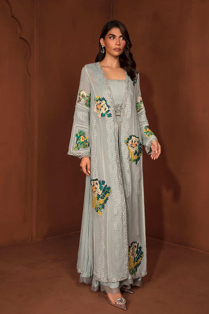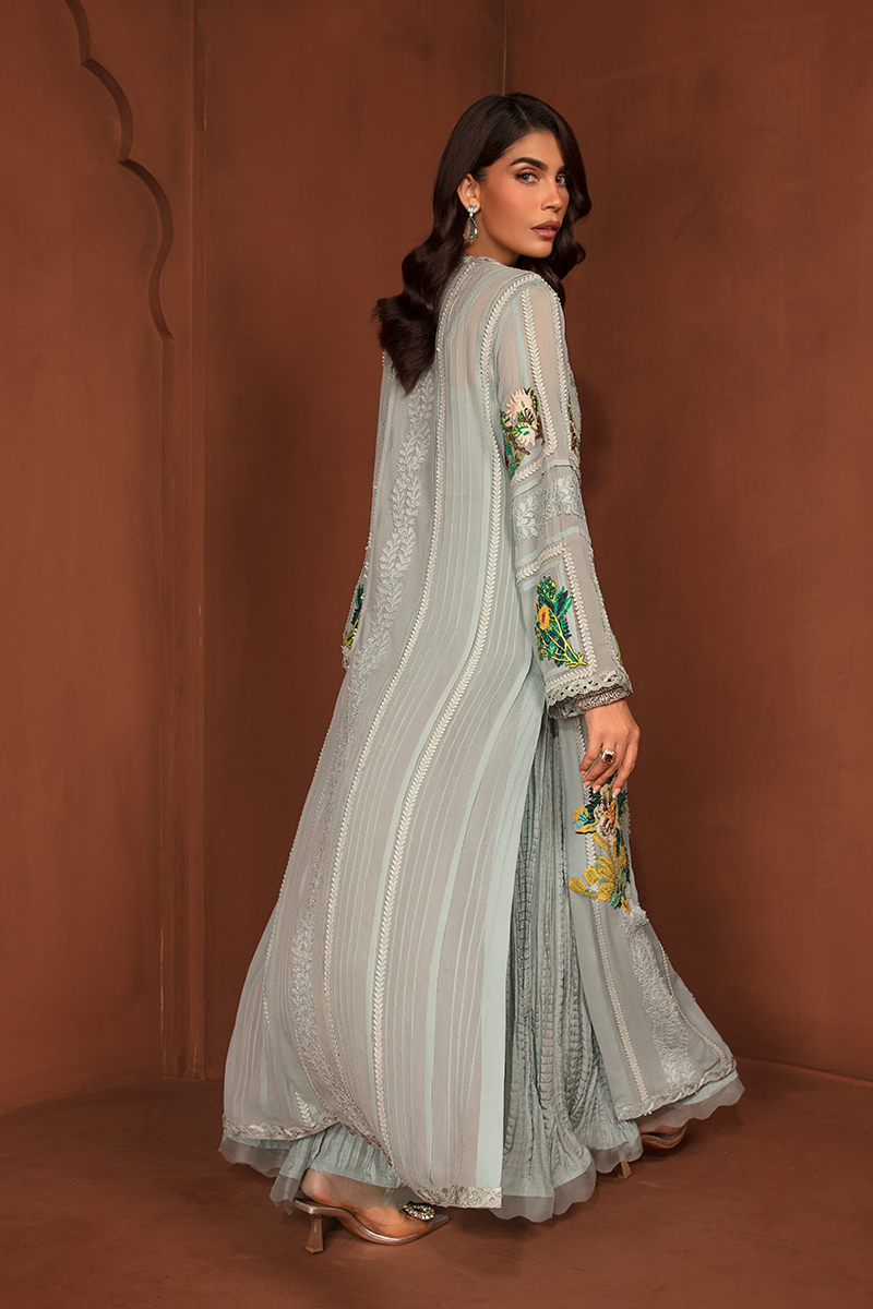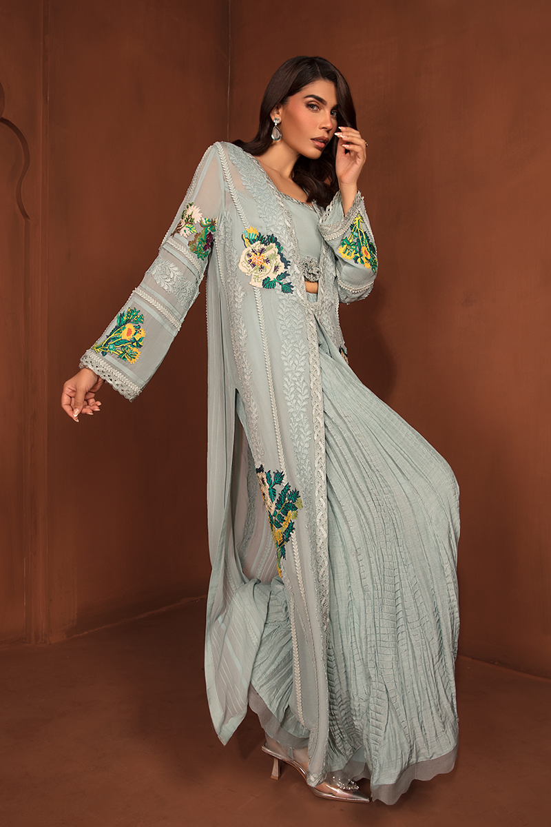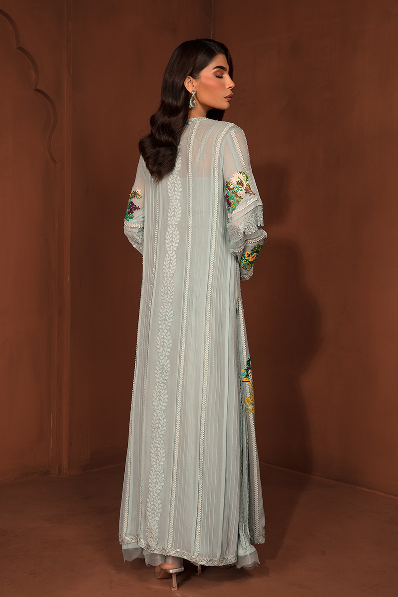 Description: Experience the magic of floral dreams with "LANA" on a gorgeous Blue base. The chiffon shirt is adorned with exquisite net lace detailing and embroidered multi-colored flowers, creating a vision of ethereal beauty. Paired with raw silk trousers and a chiffon dupatta. Chanting an orchestra of floral melodies, Lana is artisanal and trendy.