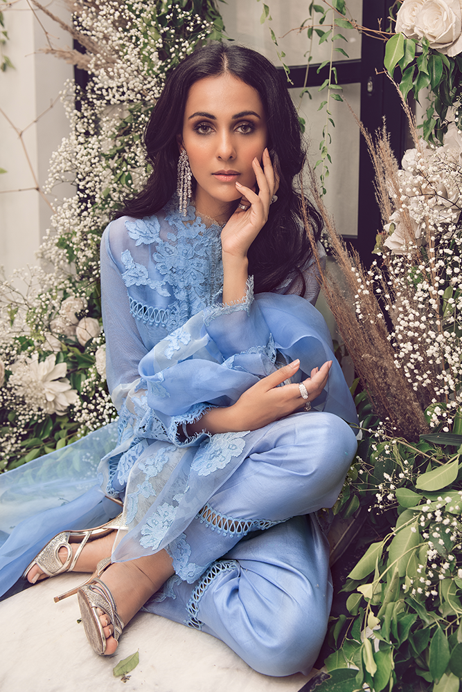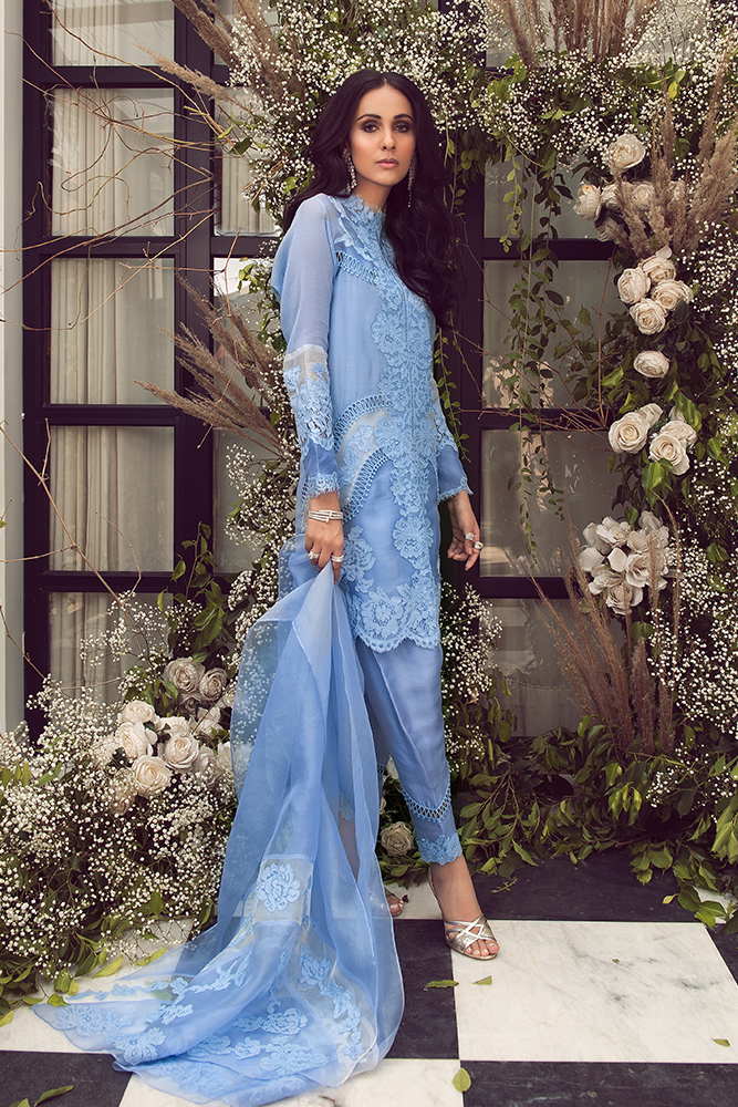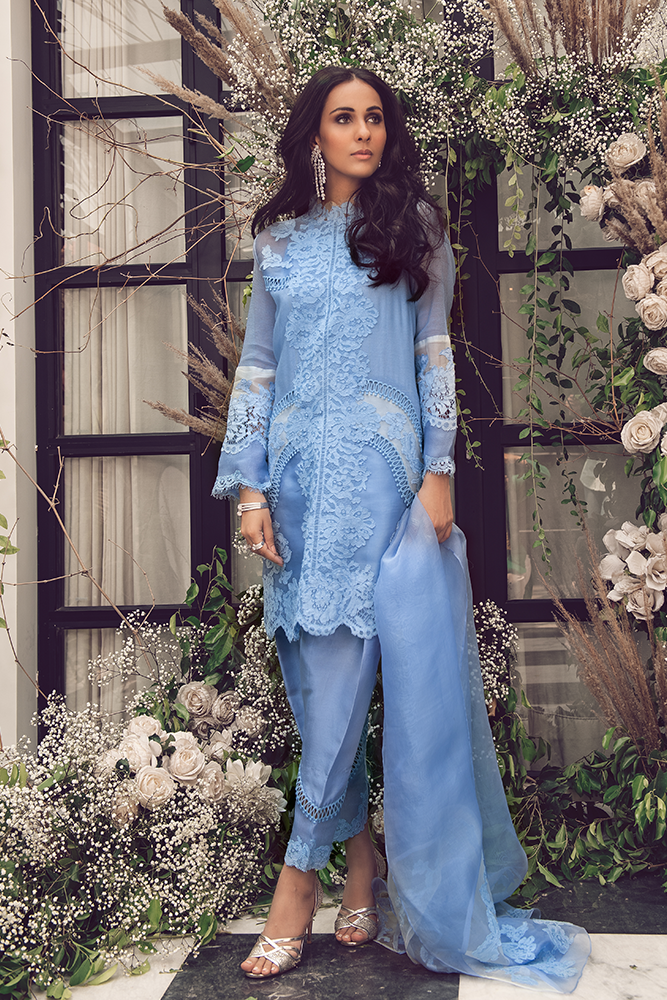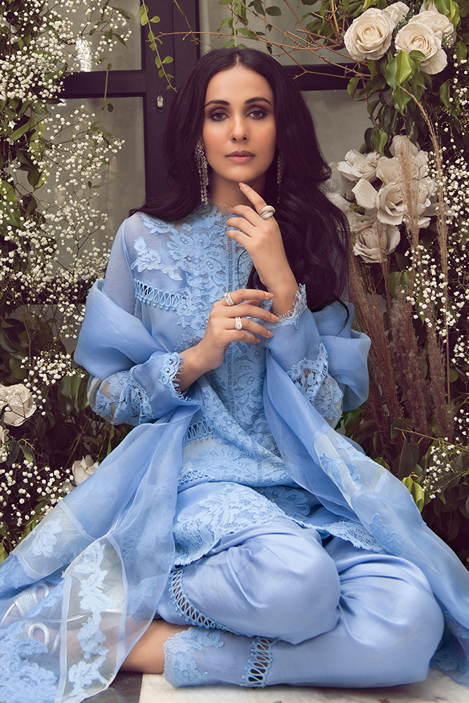 Description: Windsor blue cotton silk & organza shirt with a beautiful lace. Paired up with lace shalwar and organza dupatta.