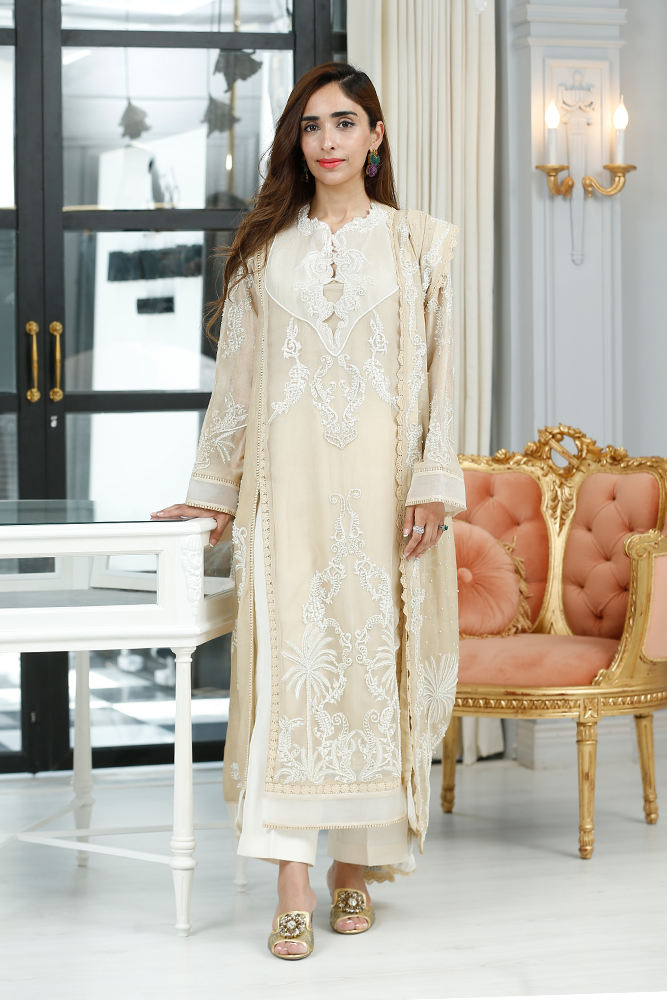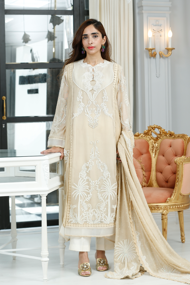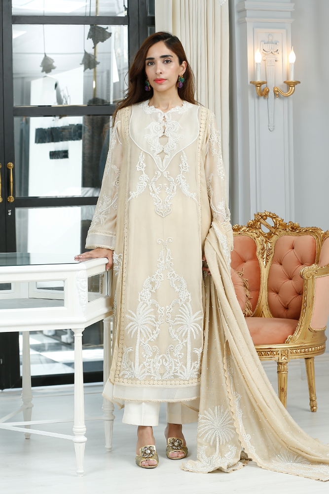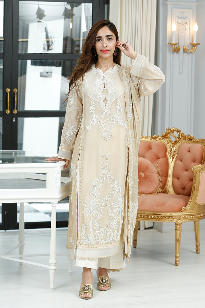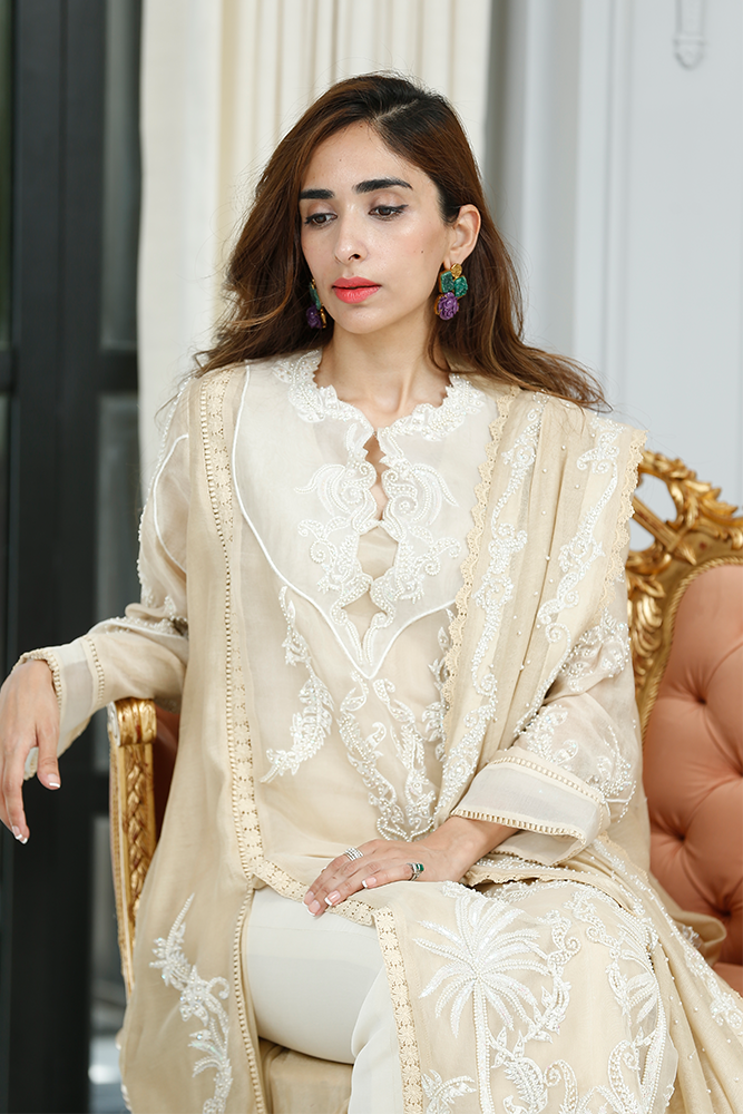 Description: Thread embroidery organza shirt with front panels slits having pearls and sequins embellishments. Paired with silk net dupatta and pure silk pants.