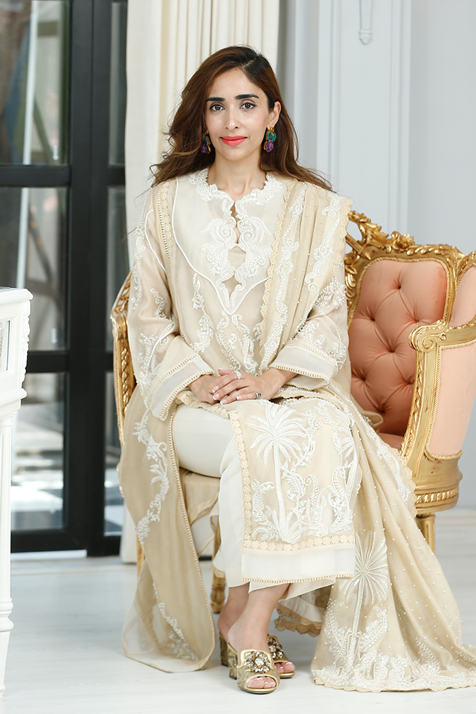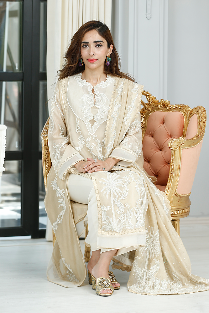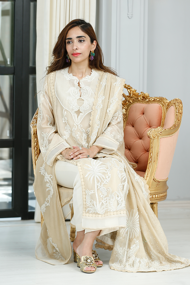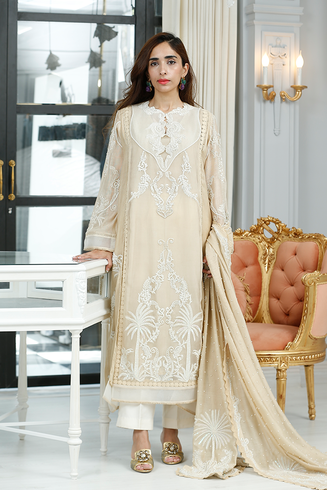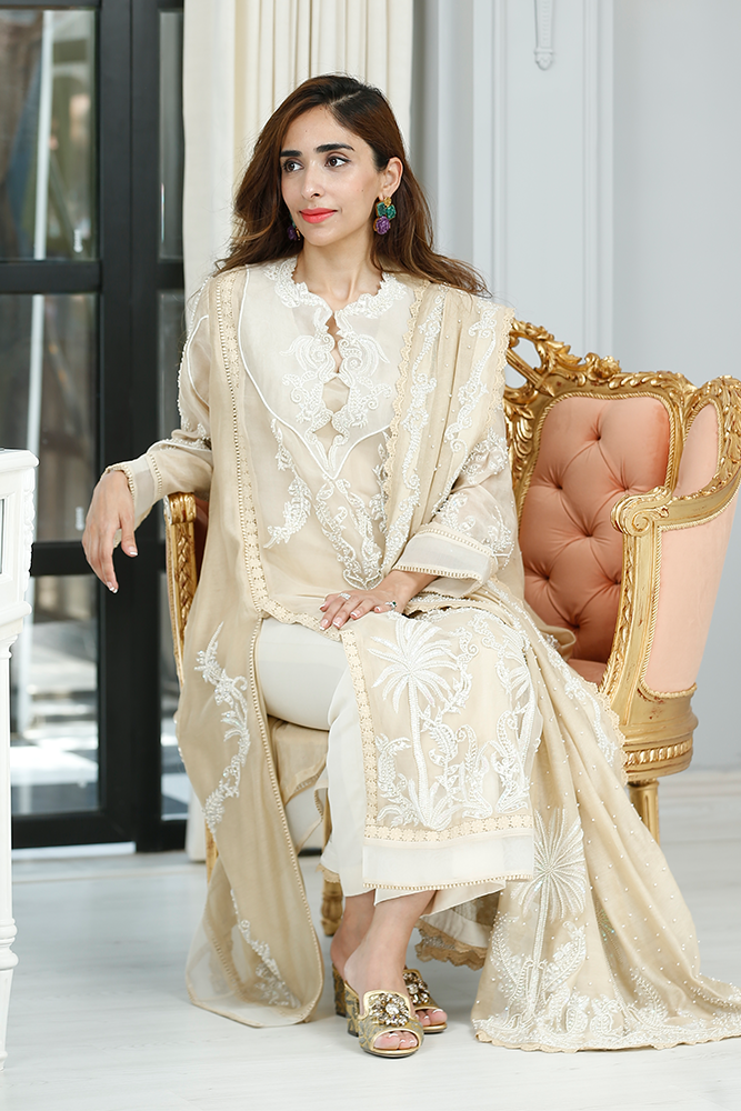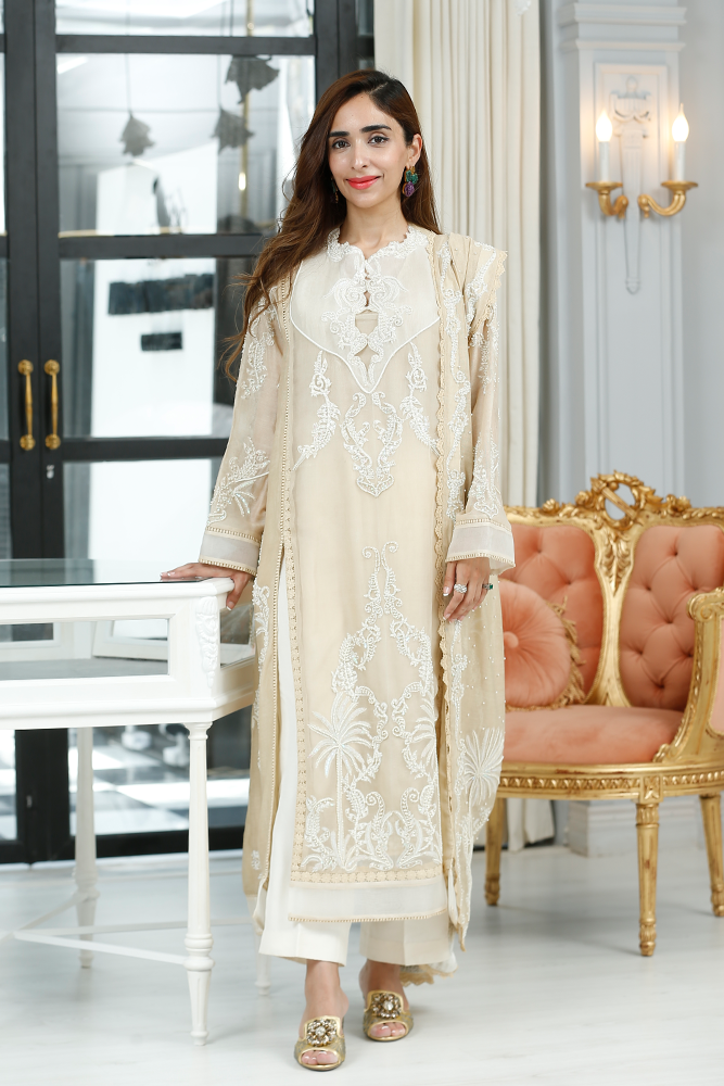 Description: Thread embroidery organza shirt with front panels slits having pearls and sequins embellishments. Paired with silk net dupatta and pure silk pants.
