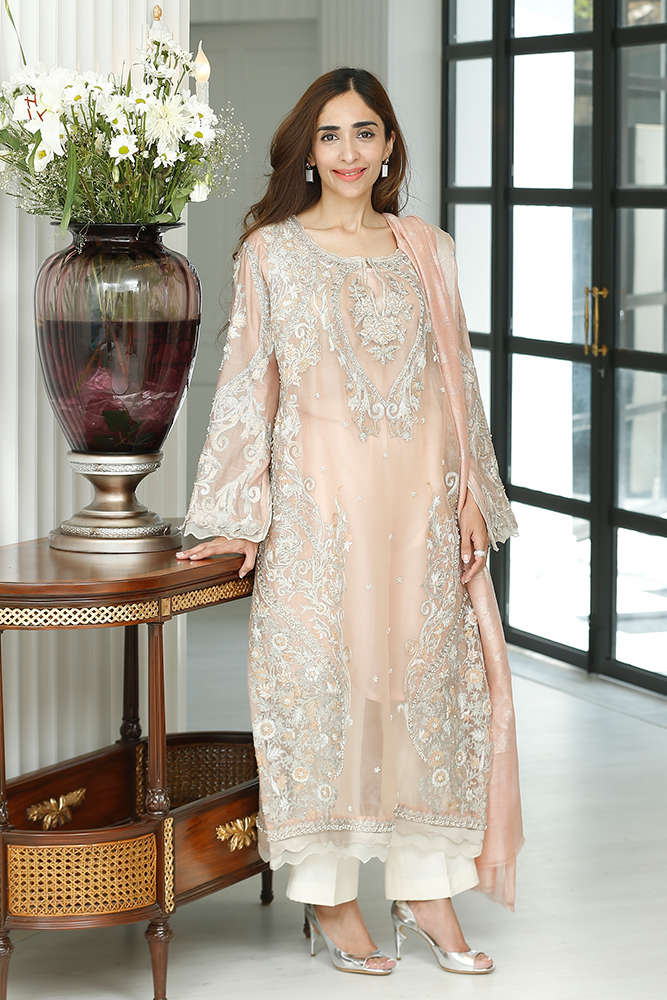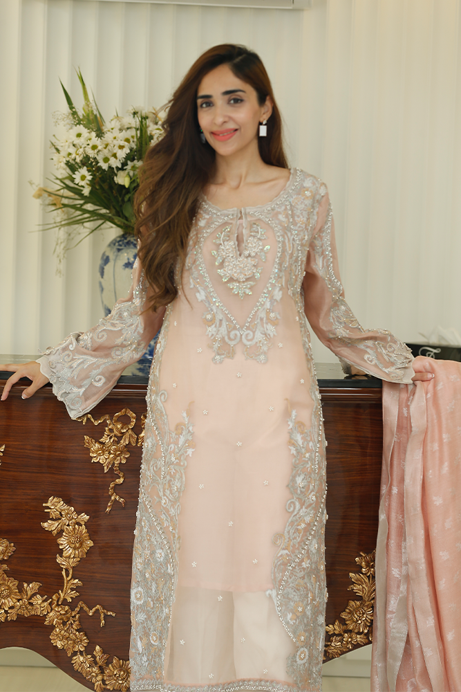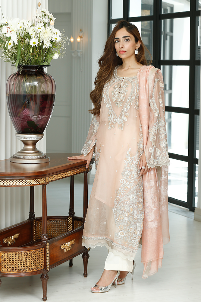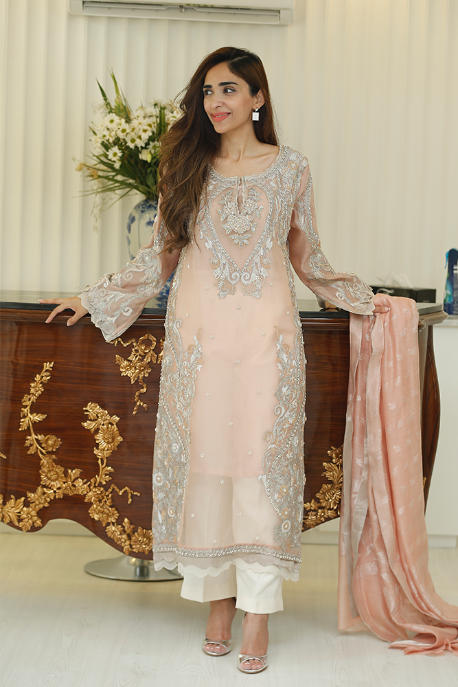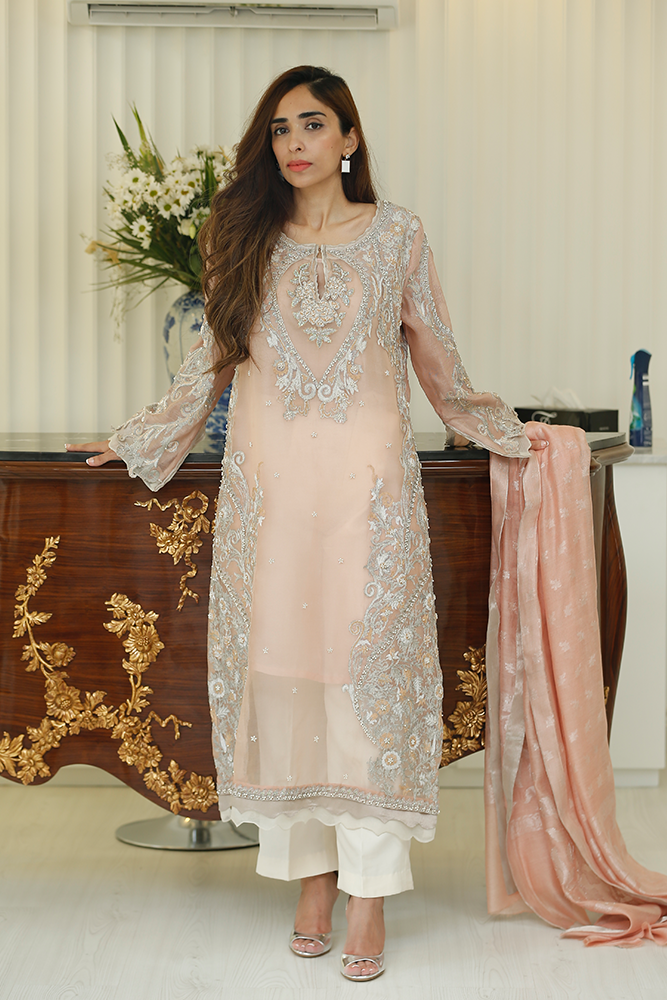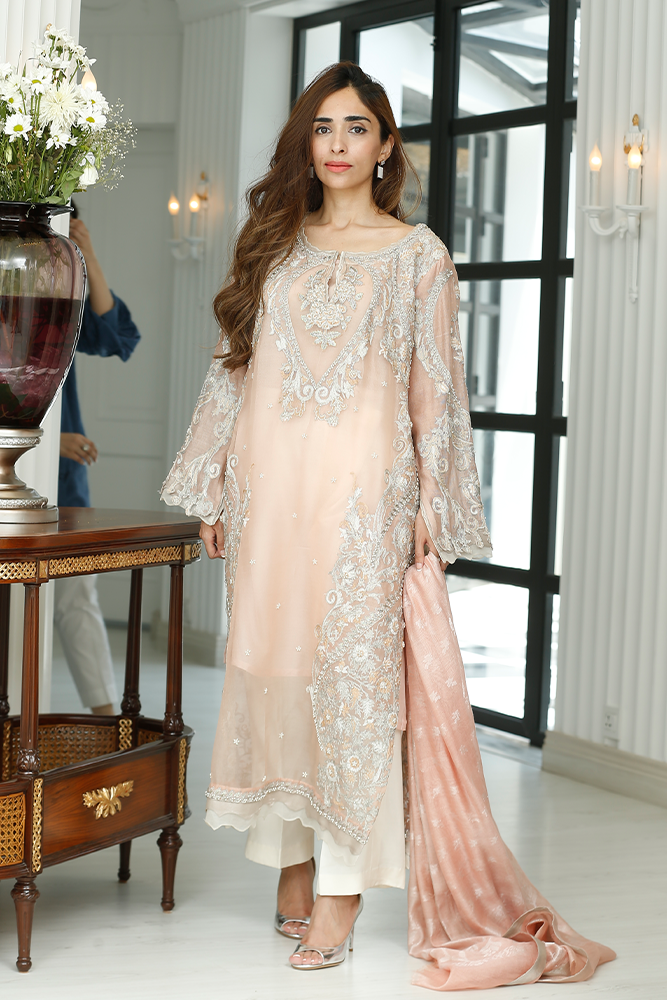 Description: Dusty pink and ivory silk net shirt with tilla embroidery, sequins, beads, and dhabka nakshi work. Paired up with silk net dupatta and pure silk pants.