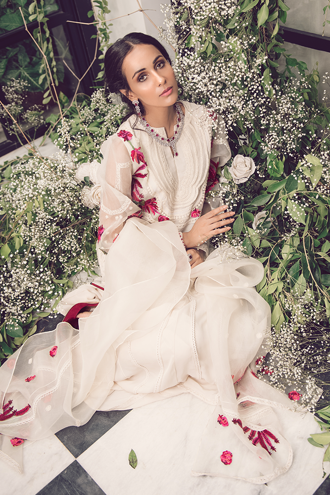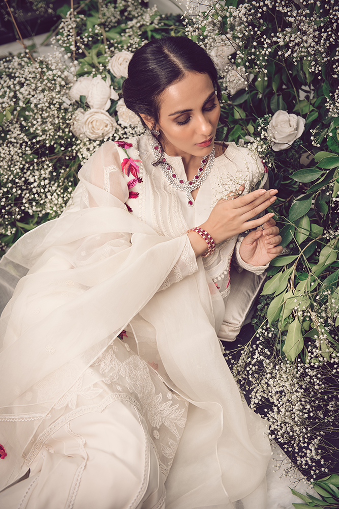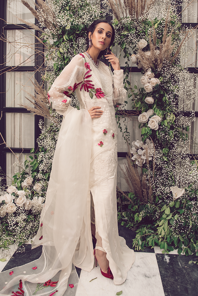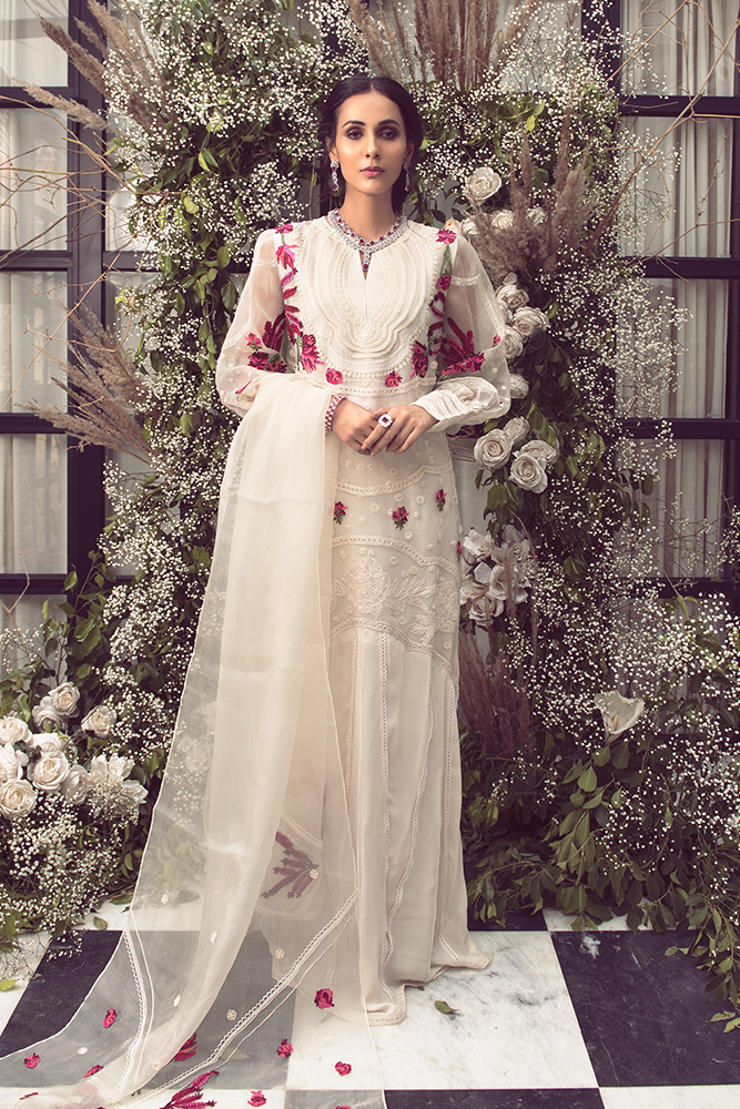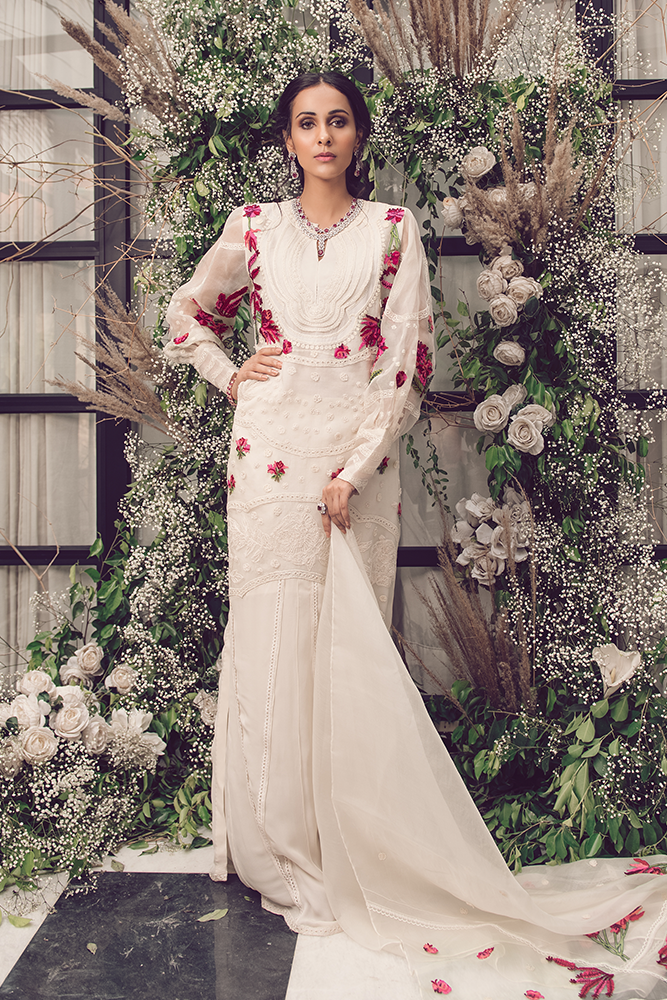 Description: Stunning ivory-colored malai crepe dress with self embroidery, paired with organza dupatta and raw silk pants.