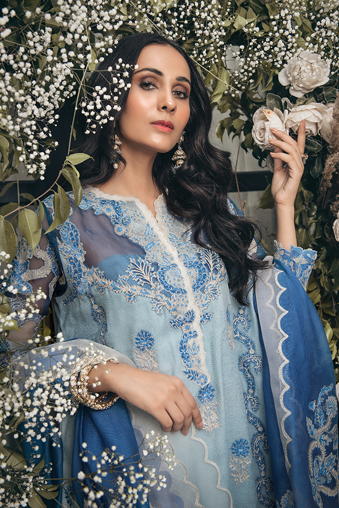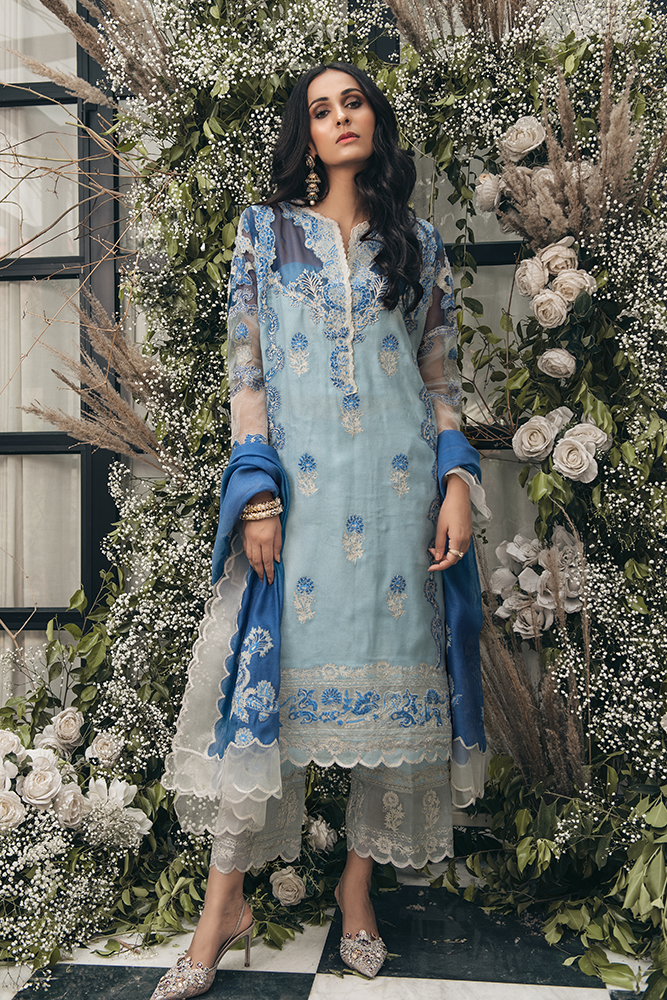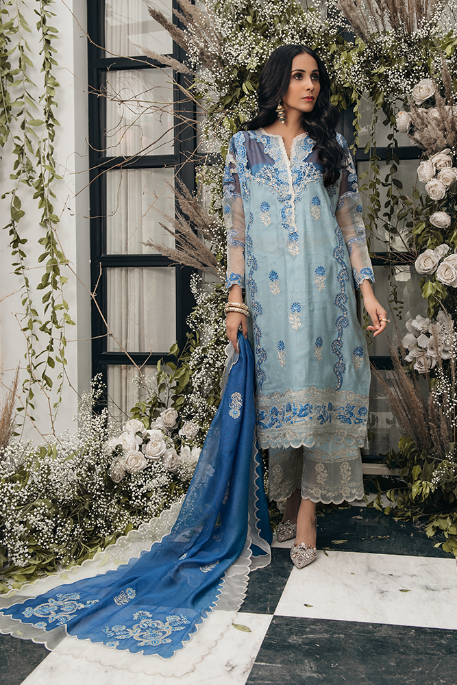 Description: Silk Net Gorgeous combination of ice blue and royal blue cotton silk embroidery shirt paired with raw silk azaar/ pants and cotton silk dupatta with organza borders.
