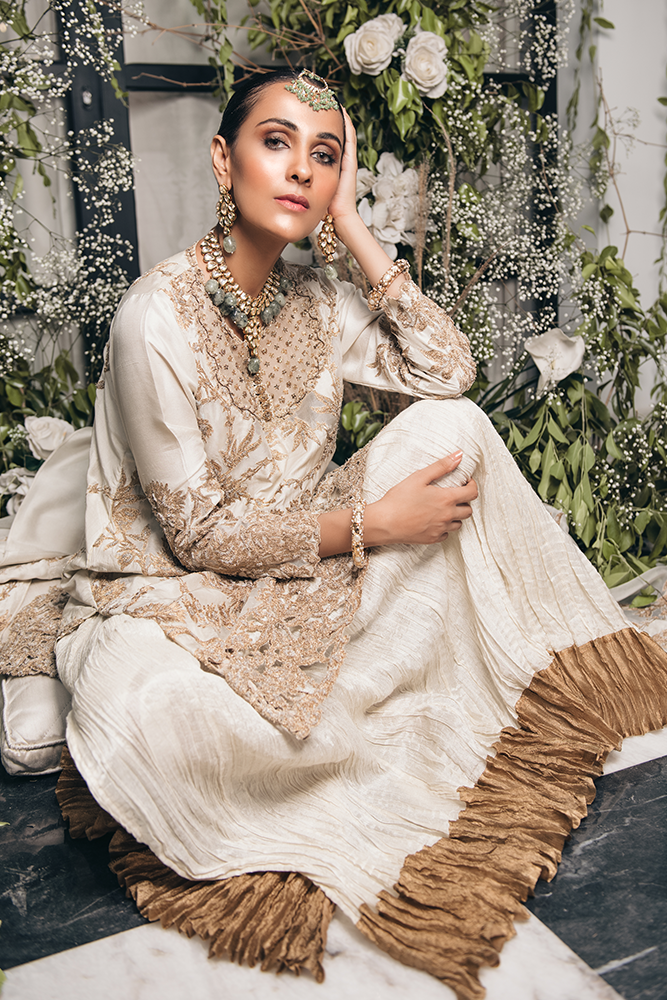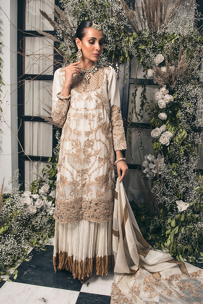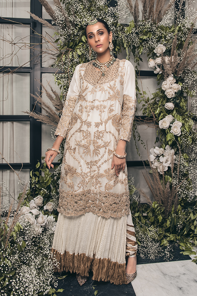 Description: Ivory and gold silk shirt with embroidery, embellished neckline and organza inlays. Paired with chatta patti churidar and dupatta.