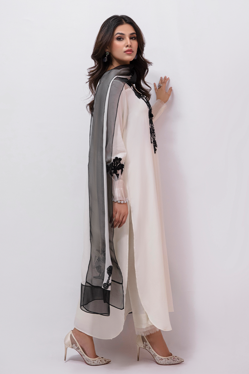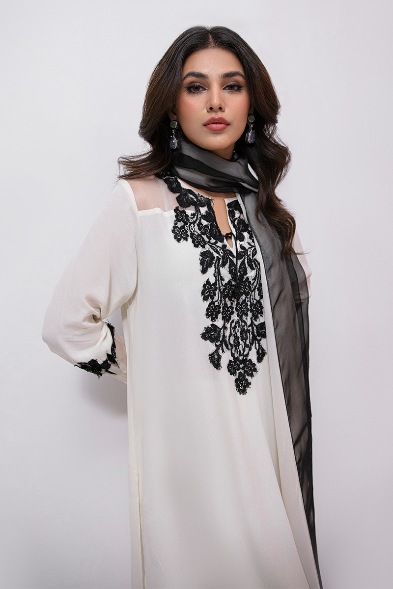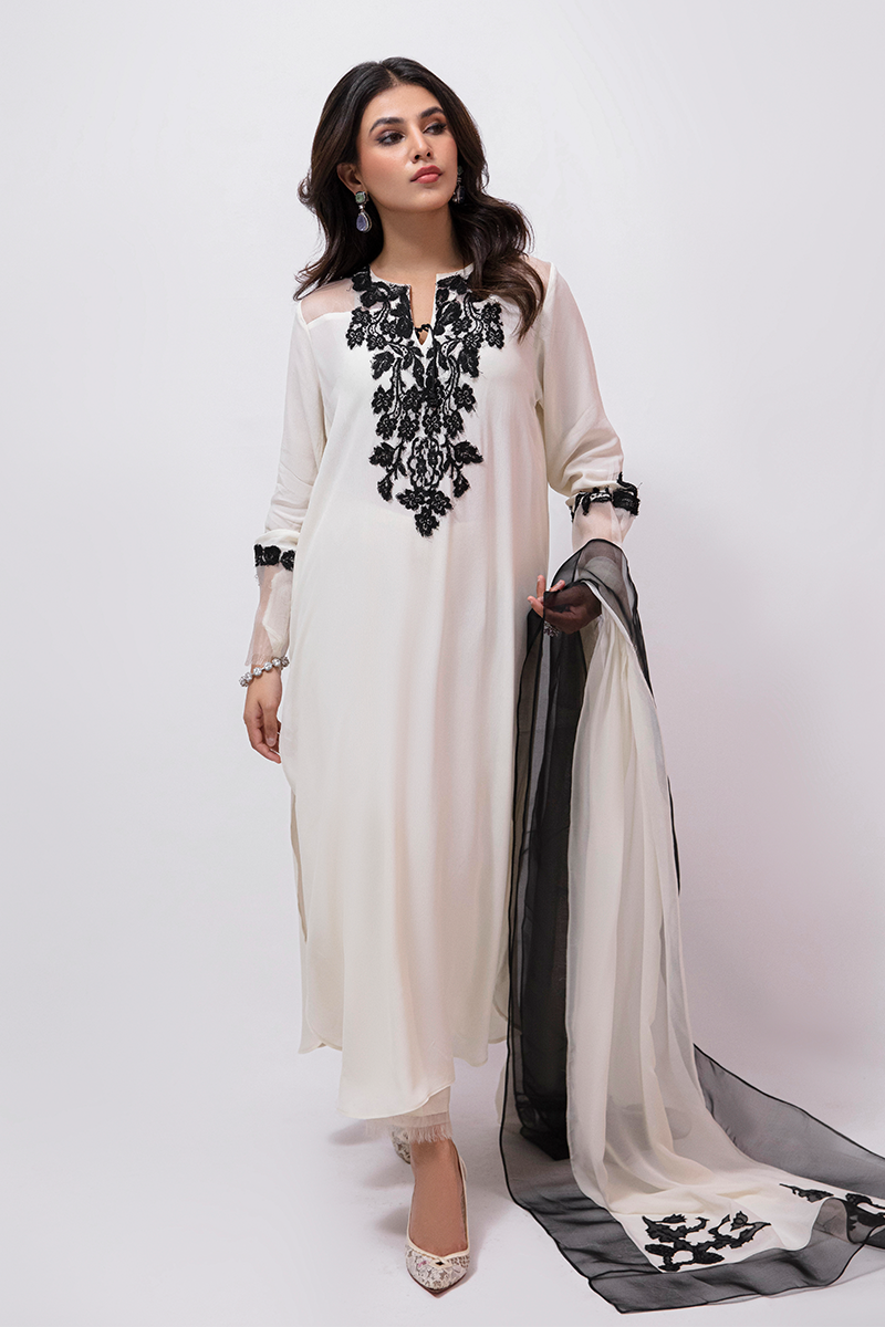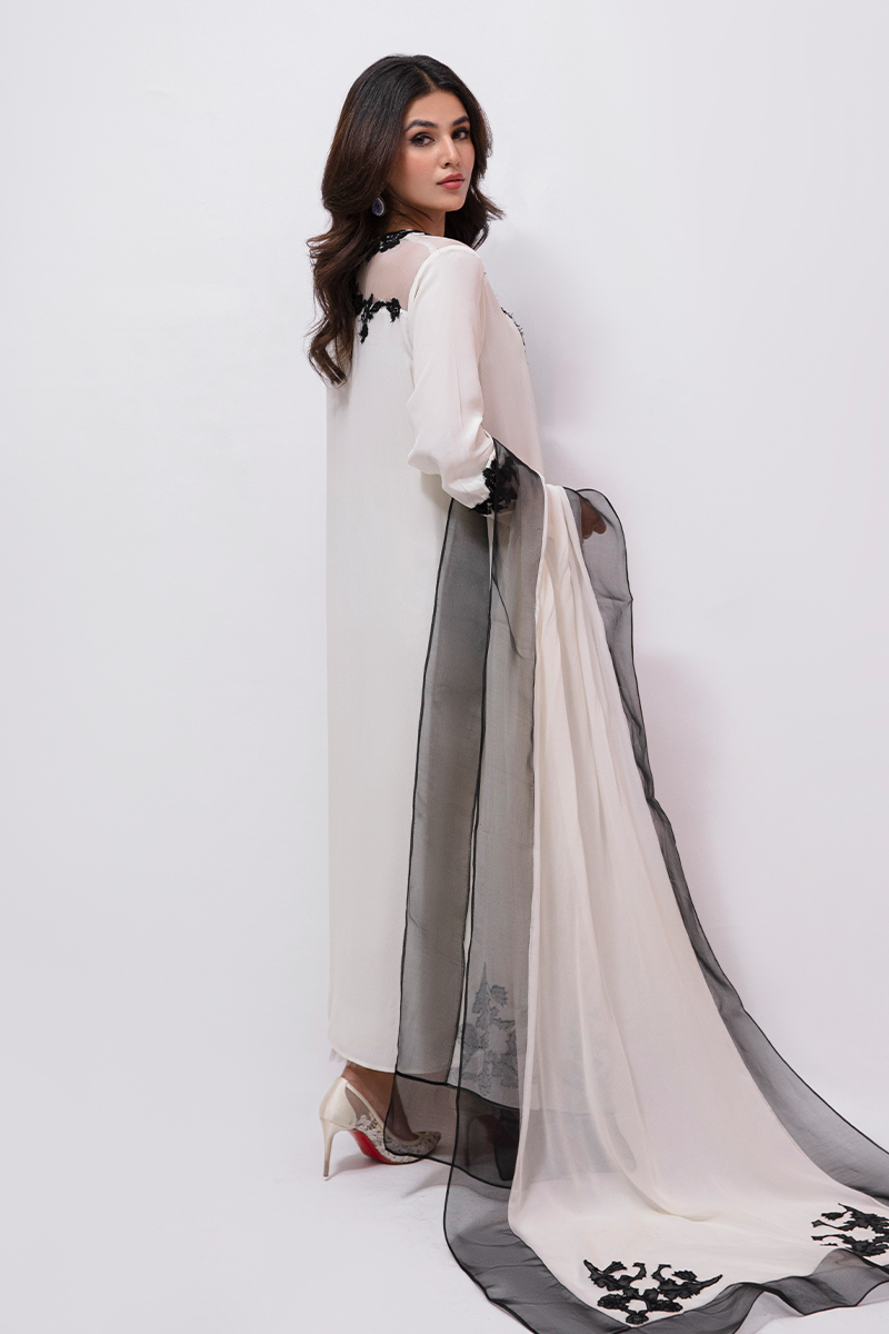 Description: Crafted to perfection, Lily is a pure white colored georgette shirt finished with organza detailing along with black enhancing chantilly applique on the neckline and sleeves. The majestic royal black and white combination that never goes out of style is accompanied by silk pants and an organza dupatta with chantilly detailing on corners, making this a perfect fit for striking a sensational vibe.