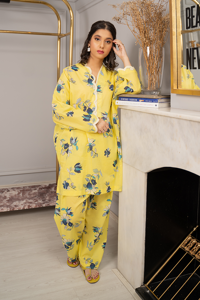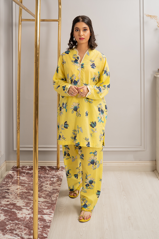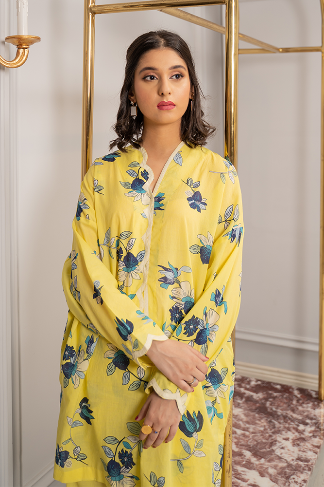 Description: This floral printed ensemble coming from the softest hues of yellow paired with a matching finest printed shalwar creates a minimalistic yet a stellar look.