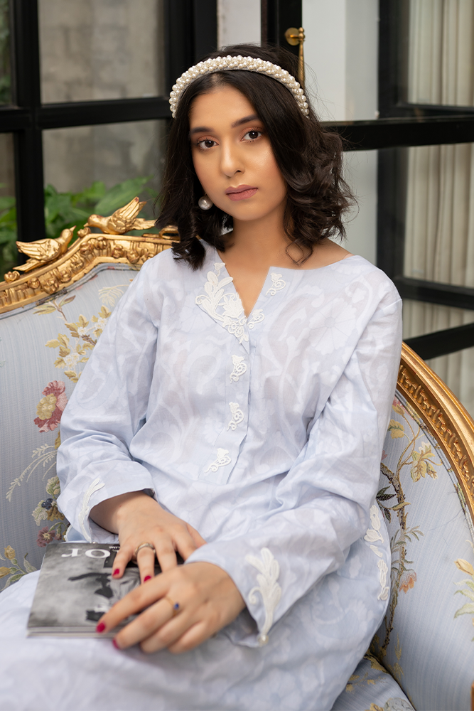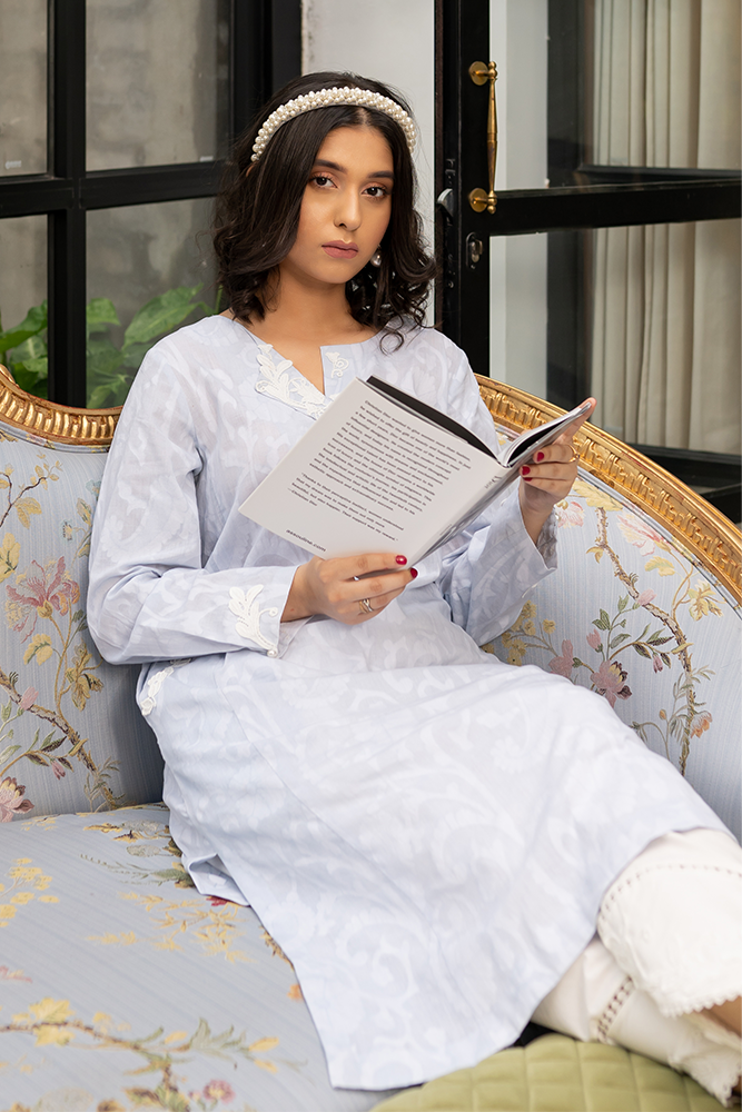 Description. A radiant display of elegance is embodied by this ensemble. Dreamy ice blue embossed cotton kurta with exquisite white details on the neckline with charming sequence on the pockets creates an elegant outlook for any occasion.