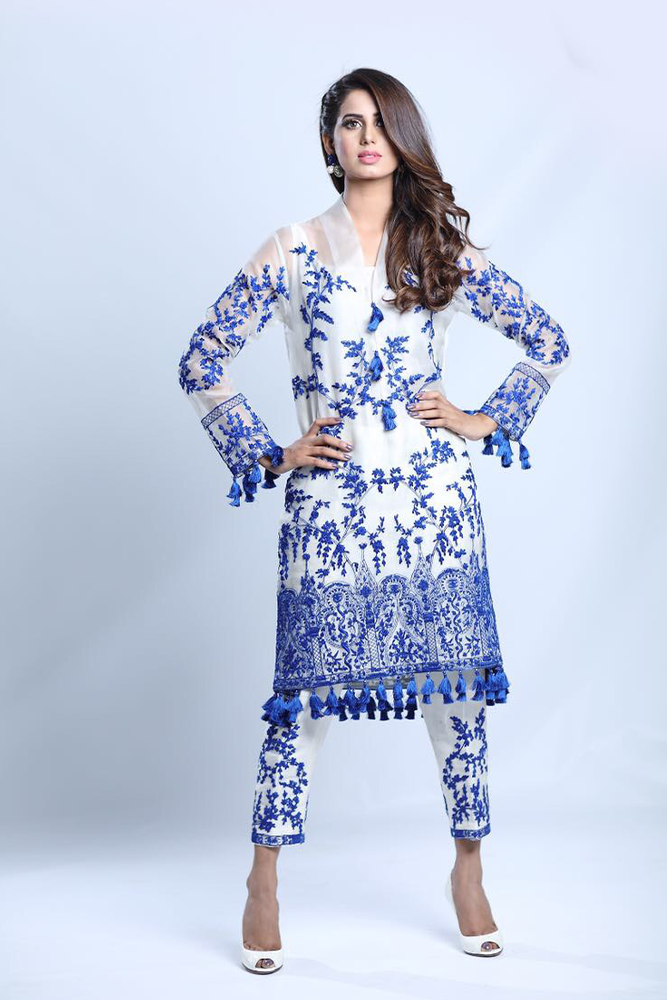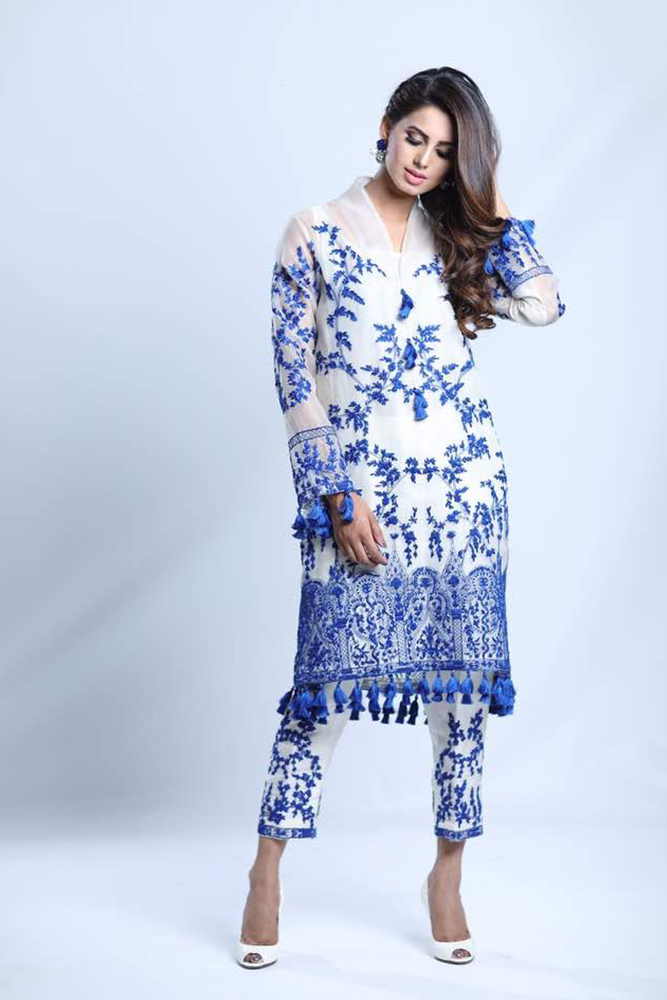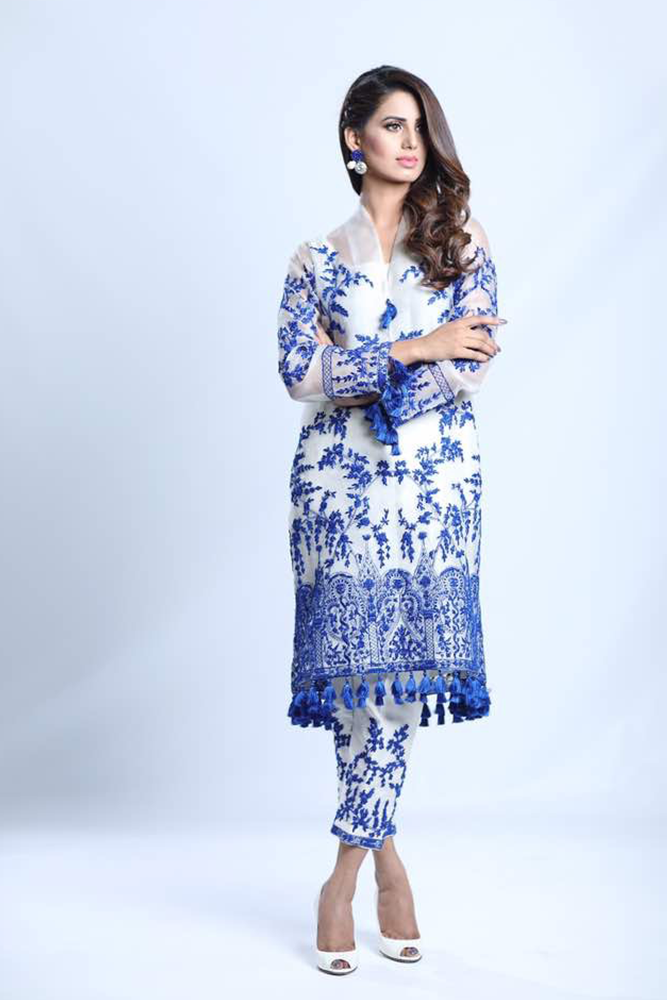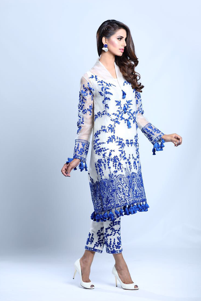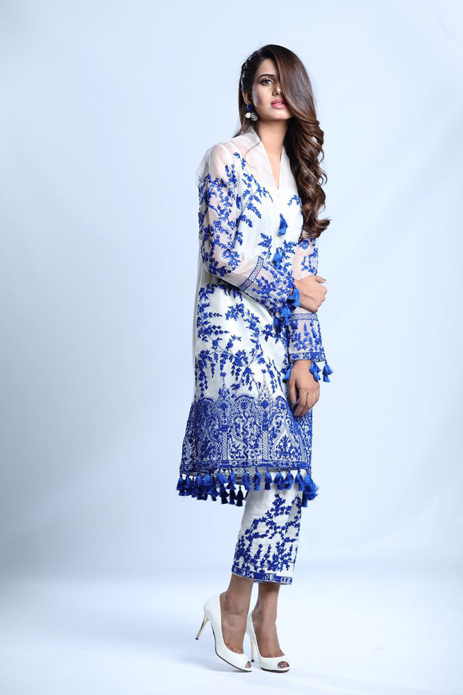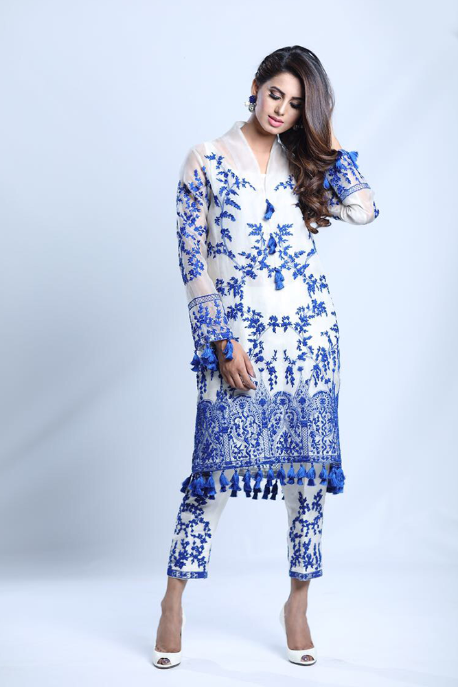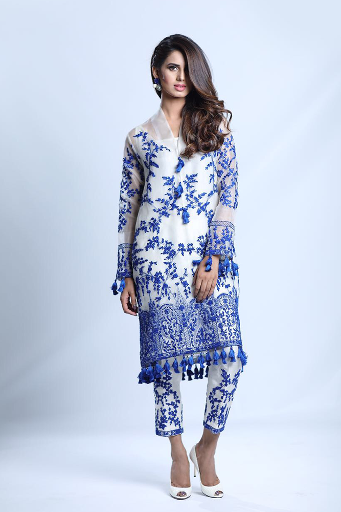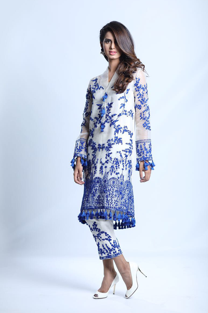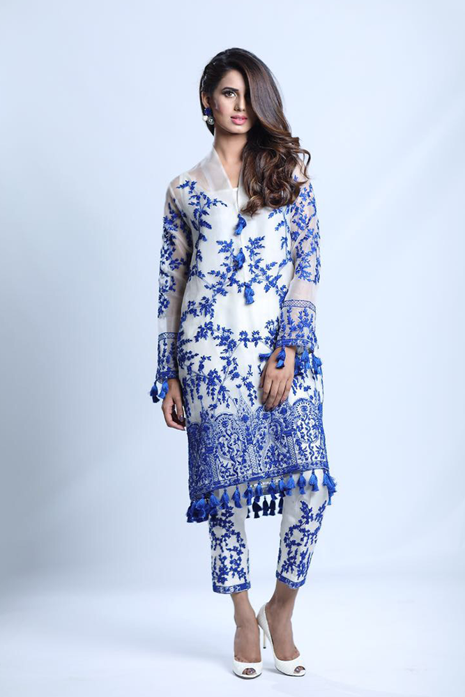 Description: Ivory silk net shirt detailed with electric blue embroidery and resham tassels. Paired up with silk embroidered pants.