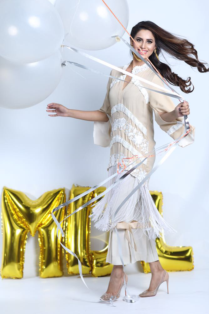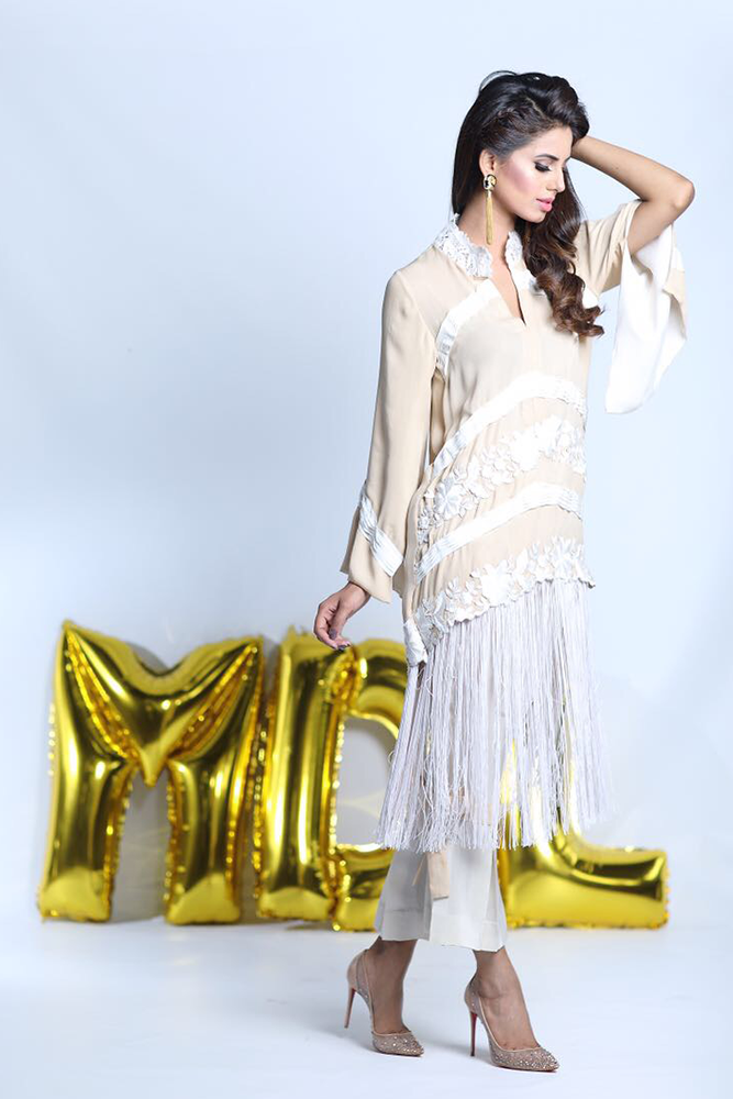 Description: Beige and ivory malai crepe shirt with tasssals hangings and slit bell sleeves. Paired up with embroidered azaar.