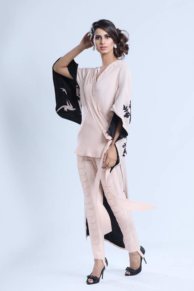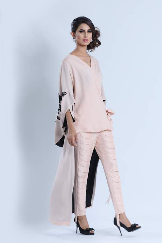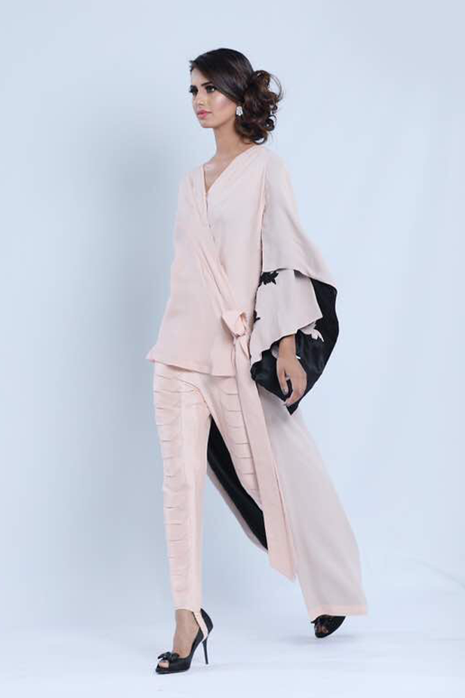 Description: This subtle Pink and black kimono style dress with black beads sequins along with crystal embellishment paired up with straight pants makes this duo the most charming yet elegant dress for any formal event.