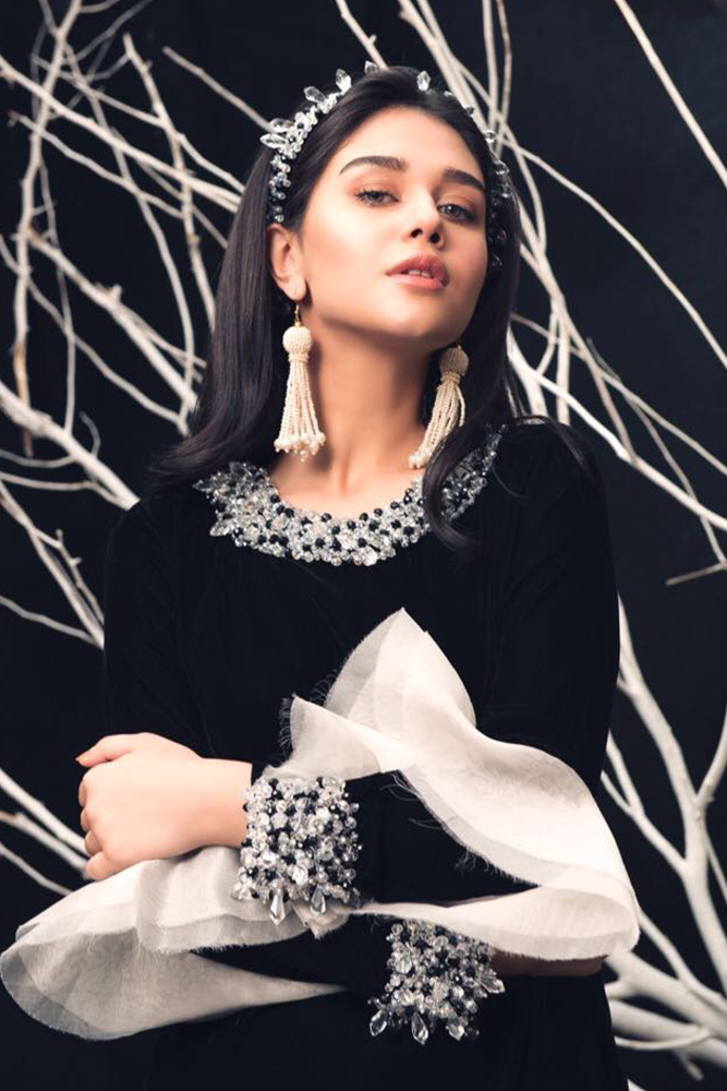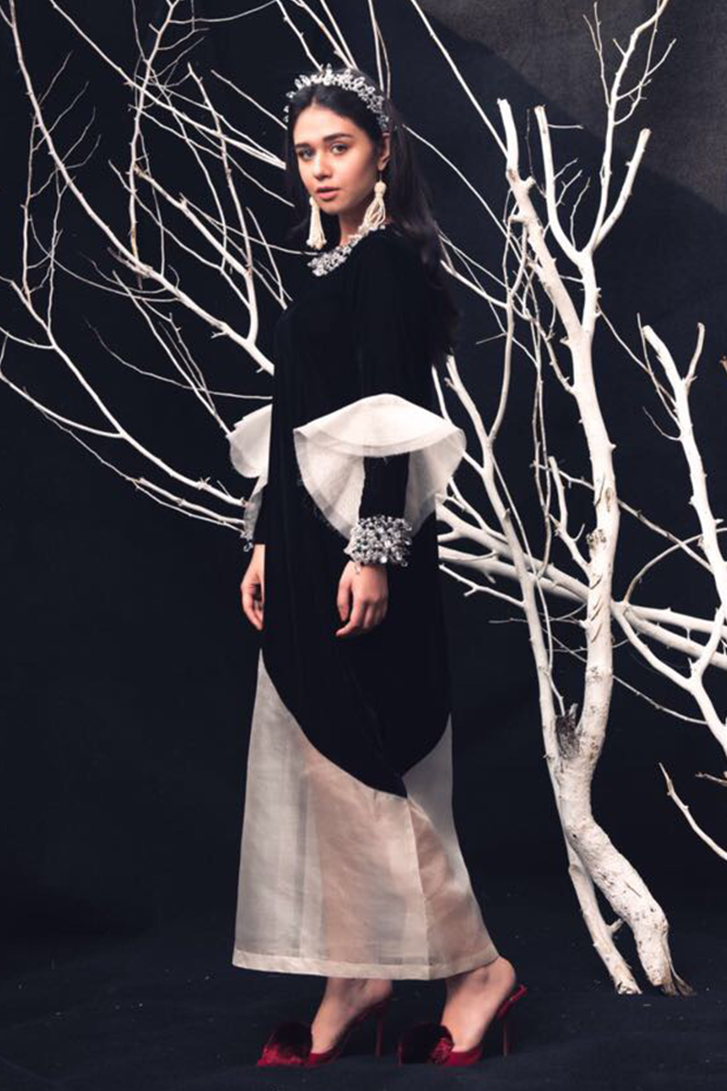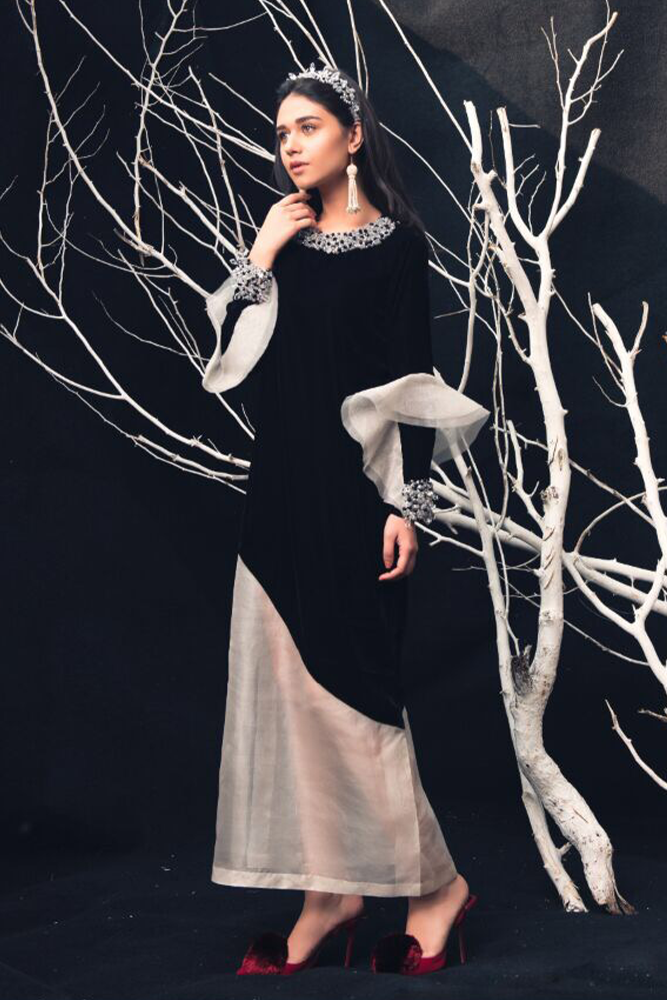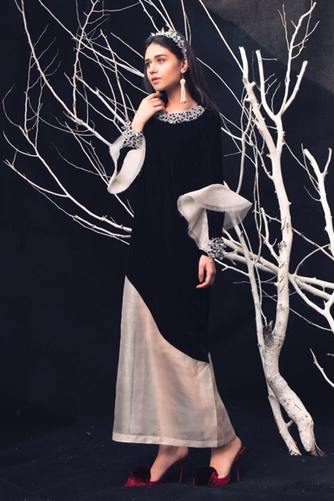Description: This gorgeous impeccably tailored winter set with mesmerizing silhouette embellishments on the neckline and ruffled bell sleeve eaccentuated with detailing. The lovely shirt incorporates ethereal work on the neckline, an embroidered organza patch on a fine cotton/organza Karandi canvas, with elaborated work on sleeves enhancing the whole look with ethnic details.