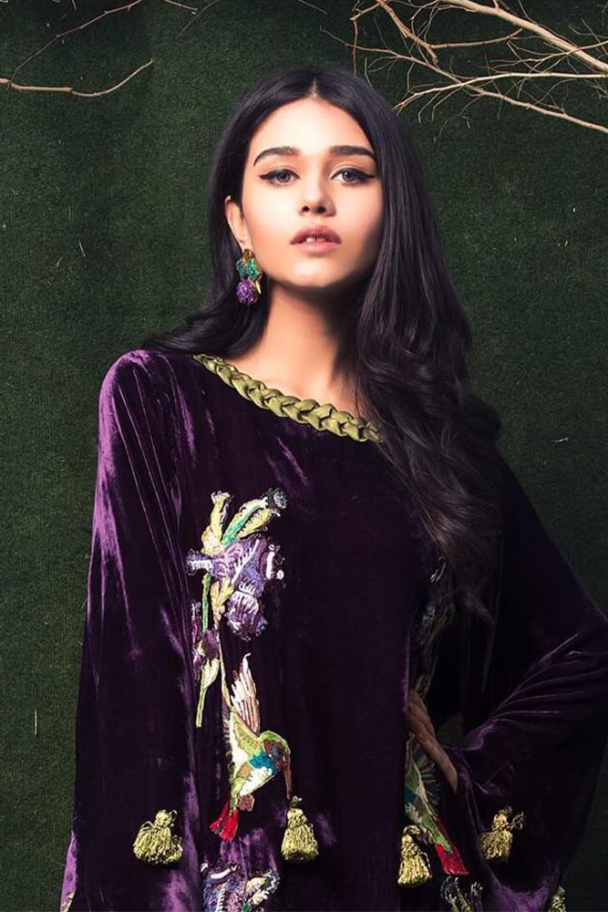 Description: This Purple short shirt from front and long from back embellished with multi- colored embroidery along with dramatic satin braid detail on the neckline with the exclusive pure silk pants enables depicts supremism from this outfit.