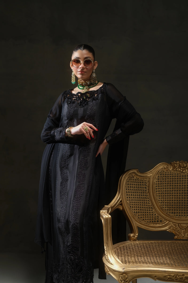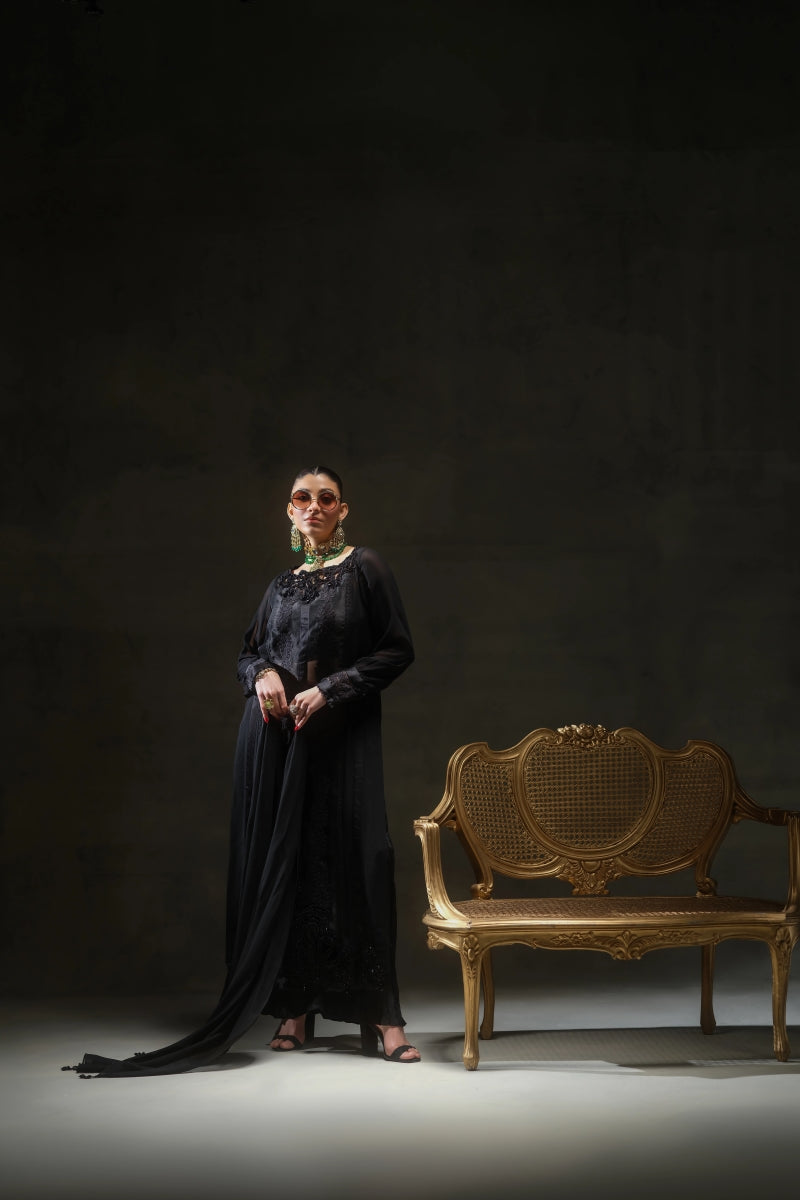 A statement ensemble featuring a pure chiffon shirt and dupatta, adorned with intricate black embroidery and velvet detailing on the neckline, accentuated with black beads and sequins. Finished with pure satin edging, the look is paired with elegantly pleated pure raw silk pants.