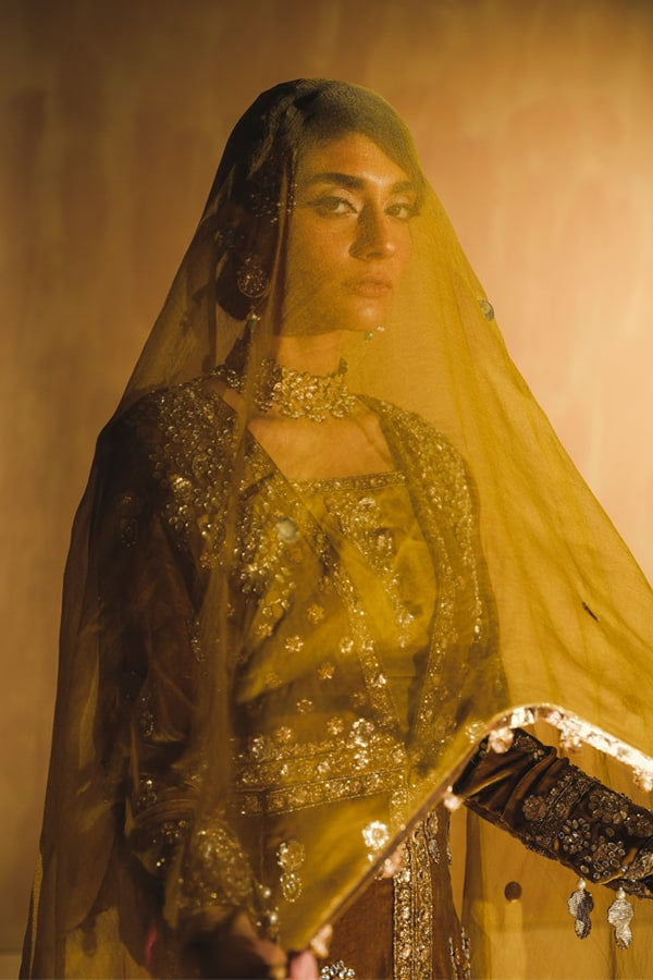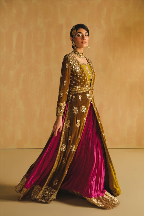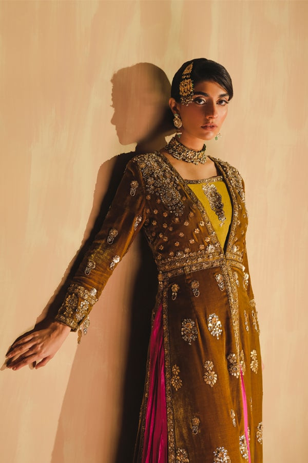 Description: A burnt mustard-hued French velvet gown adorned with exquisite jewel detailing. The gown features intricate work in light gold Dabka, naqshi beads, and sequins, complemented by kundan embellishments and delicate gota inlay. The 3D detailing adds a touch of opulence. The accompanying raw silk choli boasts intricate motifs and edging. Paired with a fuchsia pressed-pleat sharara, the ensemble is elevated with gotta lappa borders, creating a stunning and harmonious blend of colors and textures.
