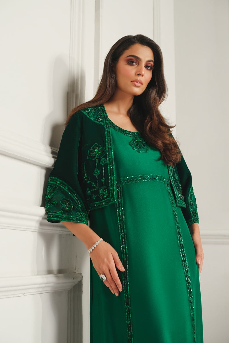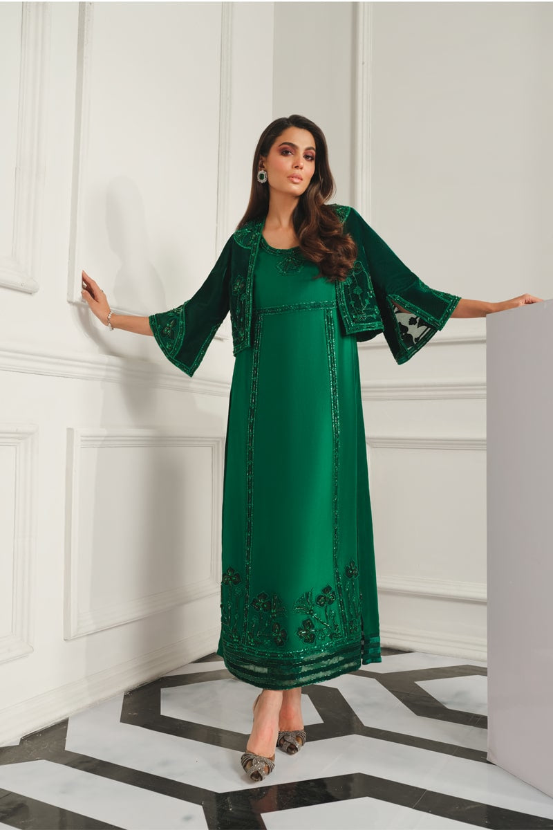Luxurious velvet and organza jacket adorned with intricate 3D embroidery, heavily beaded with exquisite sequin detailing. Elevate the allure with a pure raw silk shirt featuring 3D embroidery and opulent beadwork. Complete the ensemble with trousers crafted from sumptuous raw silk or Korean fabric, embodying refined elegance.