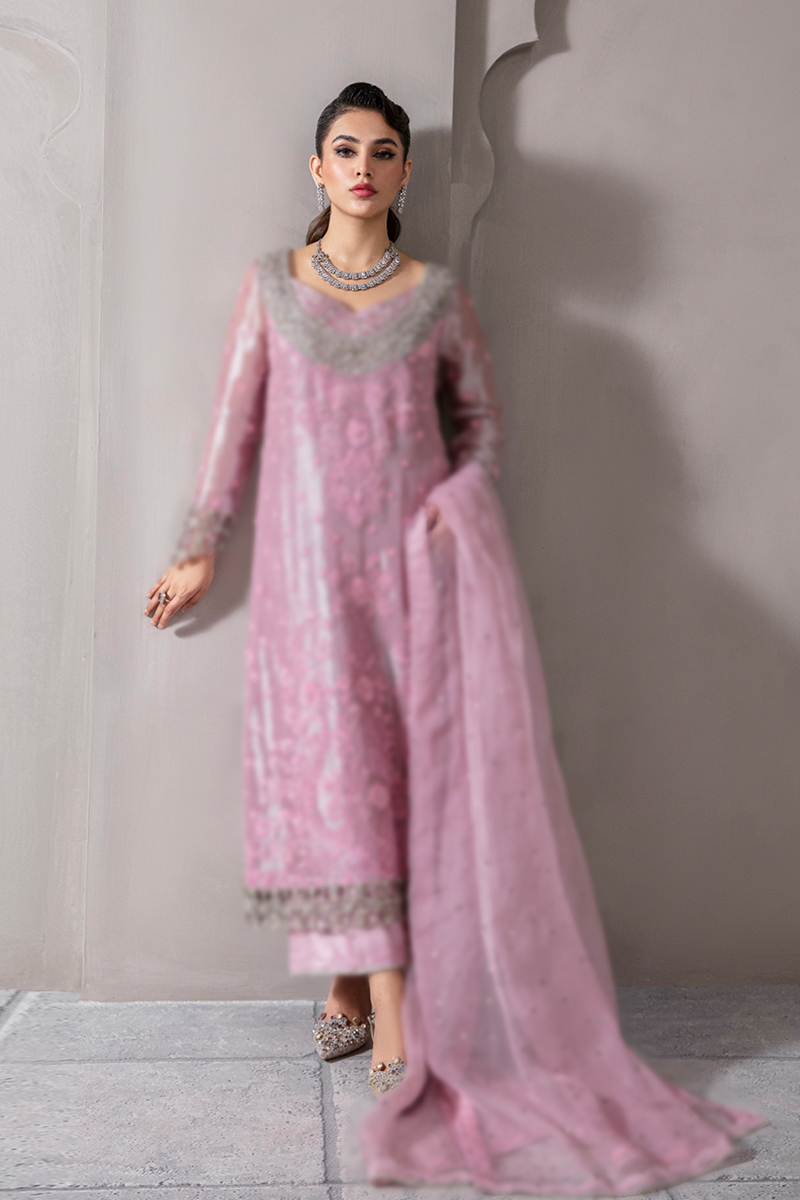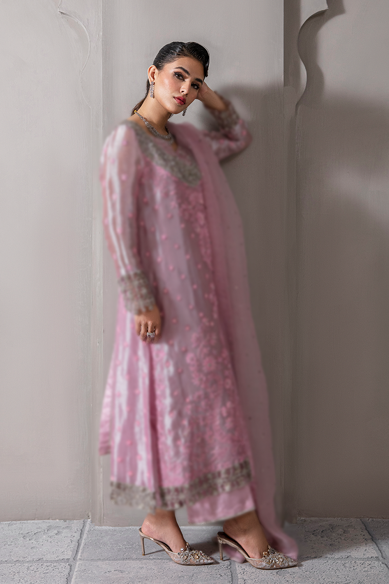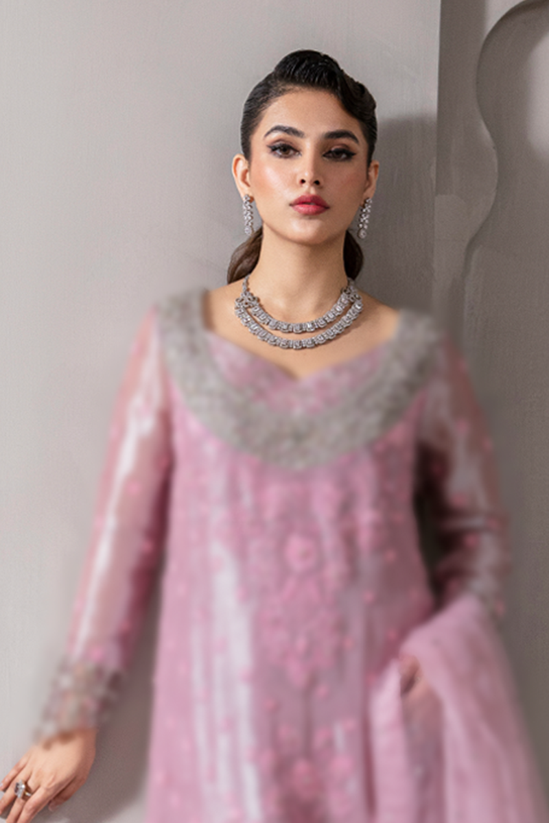 Description: The pink embroidery on pink base mangolia is a gorgeous embroidery piece, designed to embellish any outfit. Adding more elegance to this beautiful piece, it is adorned with self-colored pearls, cutdana, and sitara, which are carefully hand-sewn onto the embroidery to create a stunning three-dimensional effect. The embroidery is also accented with silver cutwork along the neckline and daman. The outfit is paired with a gorgeous kimkhab azaar and Mukesh organza dupatta draping elegantly over the shoulders, making it ideal for formal occasions such as weddings, receptions, and parties.