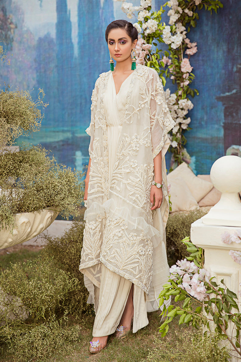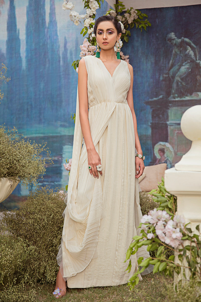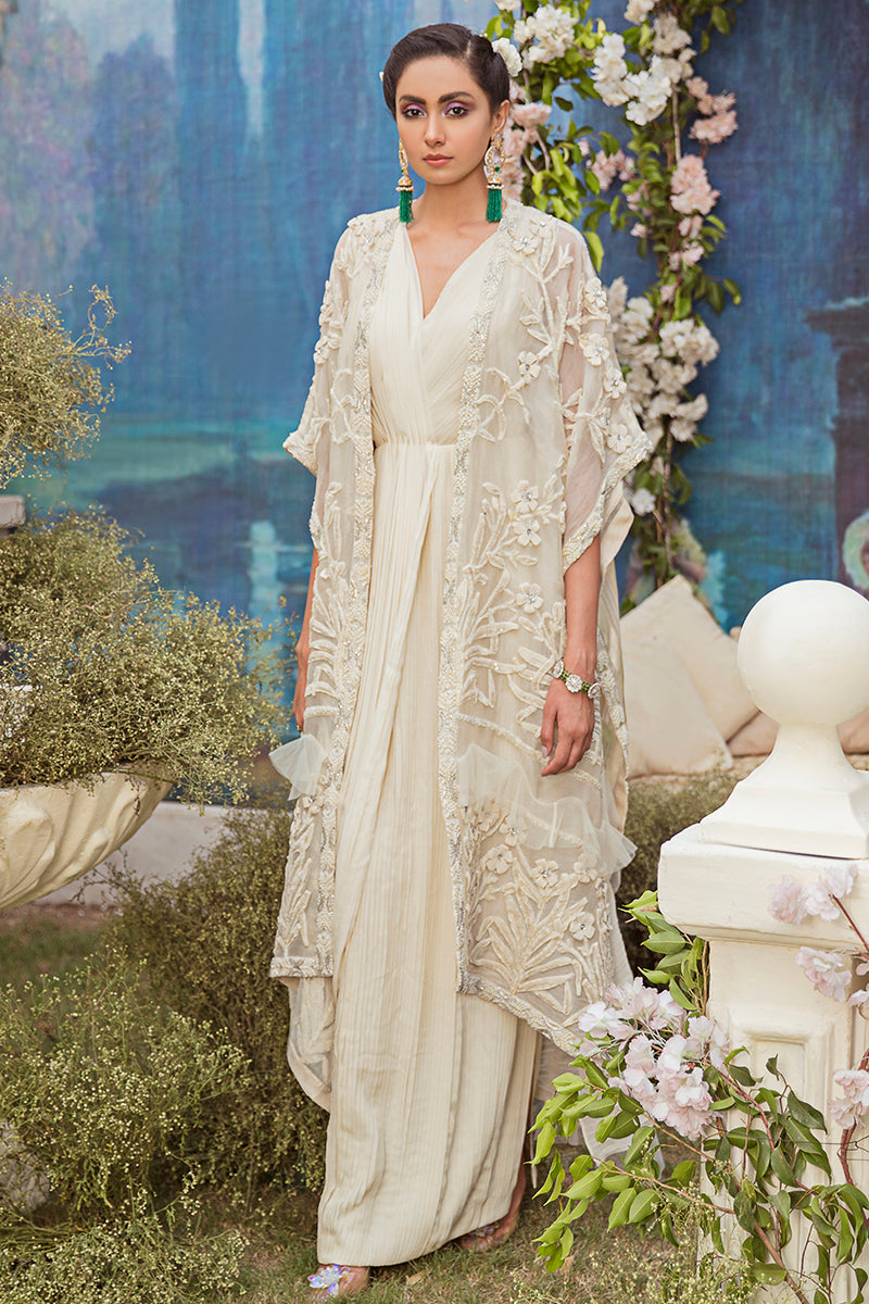 Description: A Grecian inspired chiffon pleated dress is a stunning embodiment of handcrafted elegance. With Intricate fabric detailing to add texture to a soft ivory hue dress, paired with an organza satin cape with velvet appliqué pattern embellished with sequins, naqshi and beads embroidery give this quintessential grab a contemporary take on regal aesthetic.
