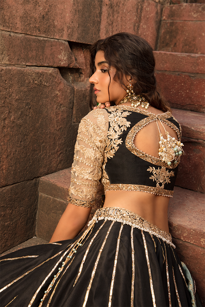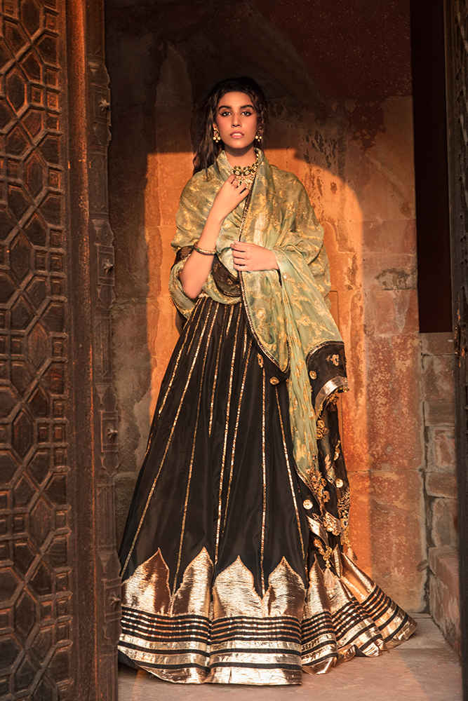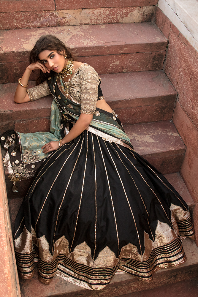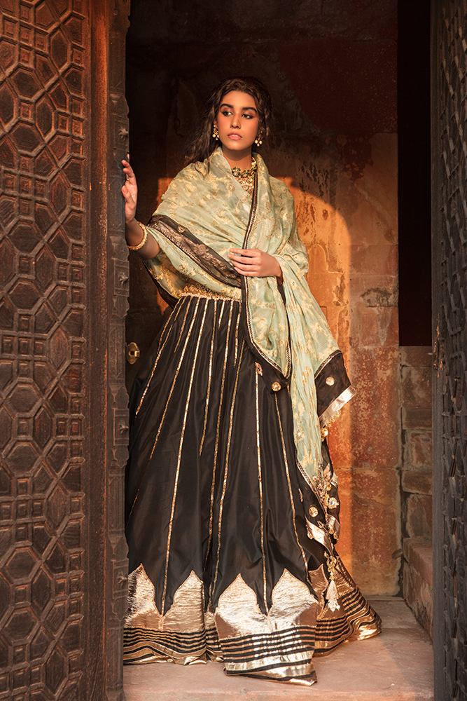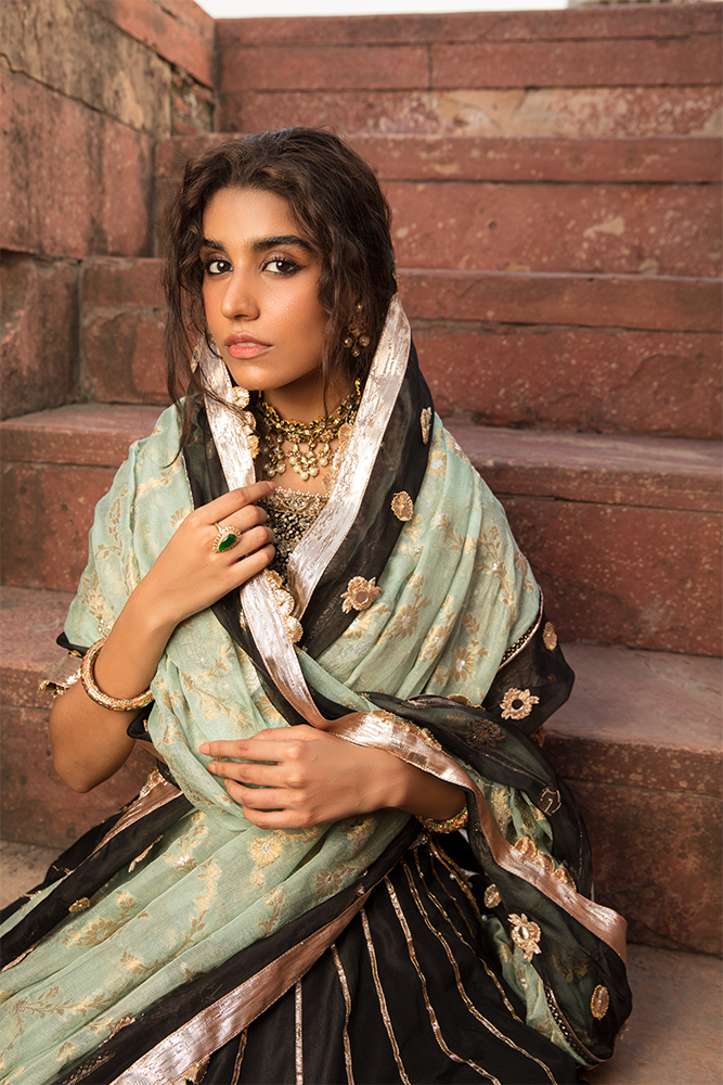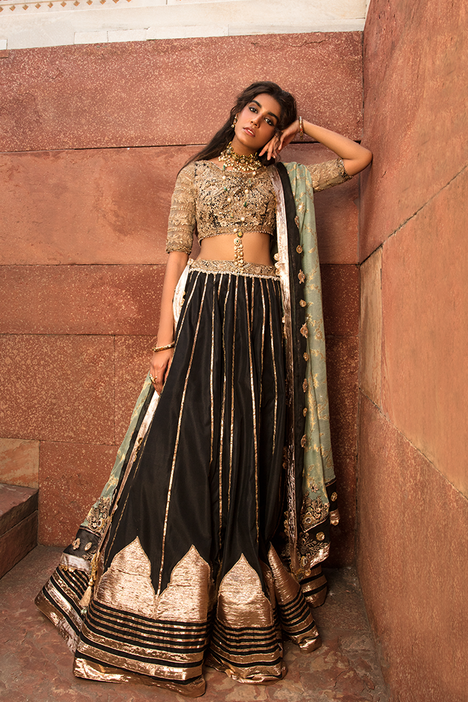 Description: Meher Bano; a draped silk lehenga with gilded gotta mehrab and detailings paired with a heavily embellished choli in hues varying from fawn to gold with decorative needlework along with alluring hand embroidery in gold metallic sequence and dabka nakshi. Paired with an aqua green silk net dupatta, bordered with gotta and black organza trimmings further enhanced with embroidered and beaded motifs and dangling’s on the corners. Meher Bano, an embodiment of elegance and an absolute classic in terms of workmanship and color pallete. A silhouette treasured forever.