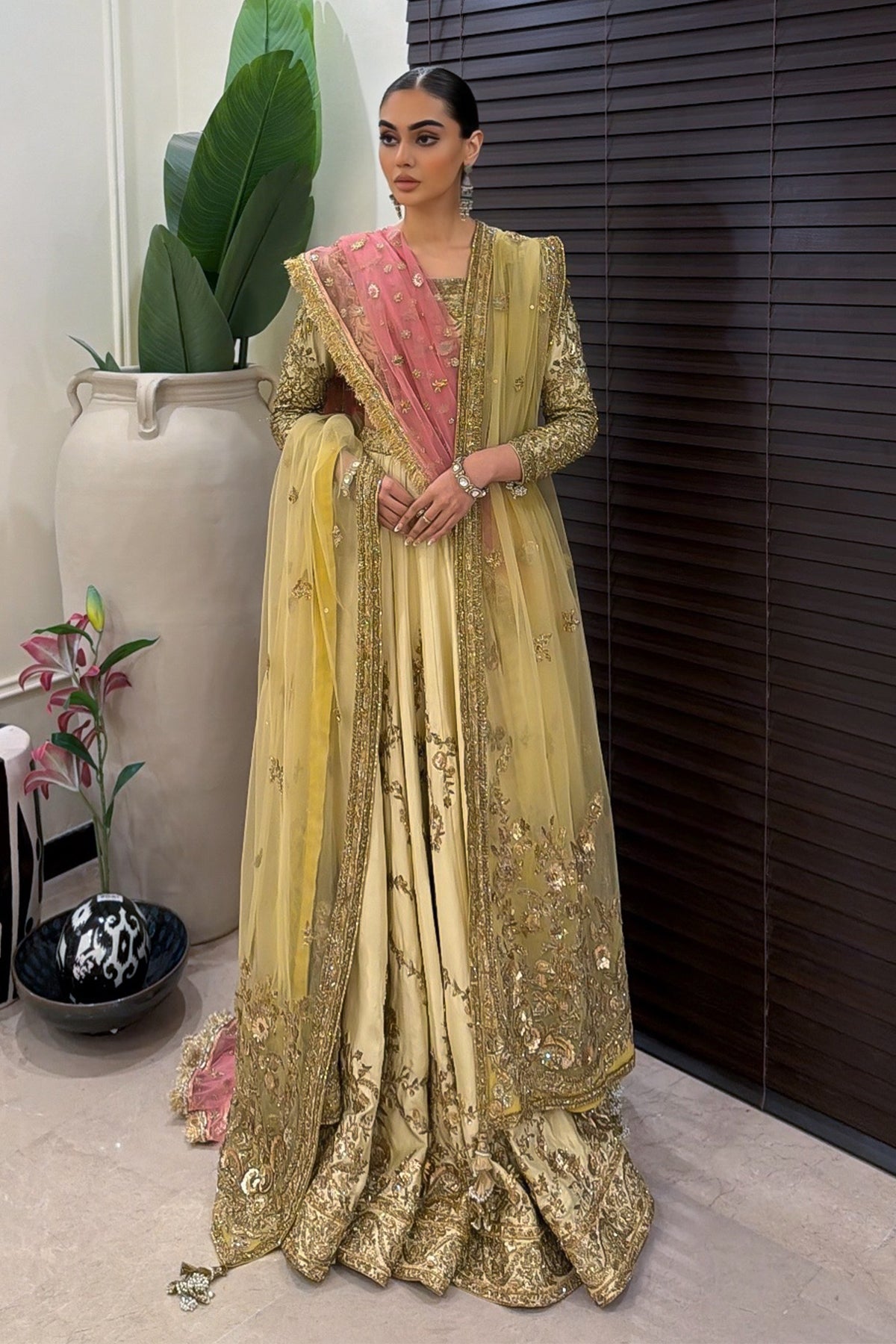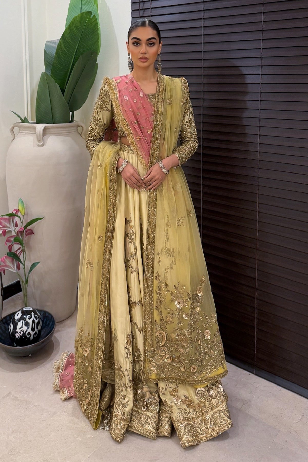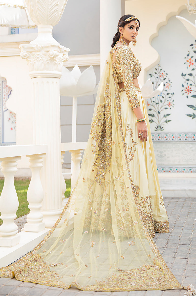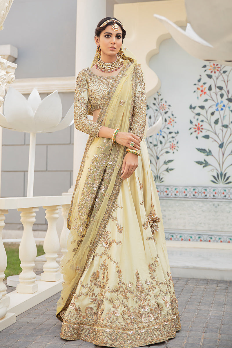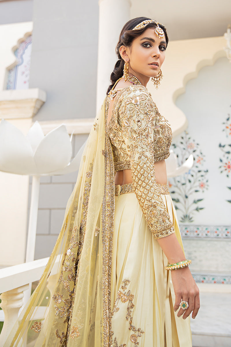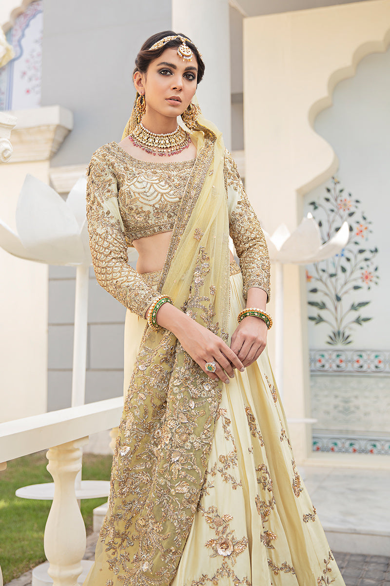 Description: Mehrbano Set You Apart This Festive Season. A Raw Silk Canvas In The Purest Shade Of Buttercup Yellow Is Crafted To Perfection With An Intricately Hand-Embellished Tulle Dupatta With Gota Details. The Neckline Of The Choli Has Handcrafted Details Of Gota And Copper Dabka With Stones And Sequins. The Back Of The Choli Comes With A Keyhole Detail Which Is Enhanced With Handcrafted Tassel. The Choli Is Paired With Raw Silk Rajhistani Hand-Embroidered Lehnga With Gota And Dabka Details.