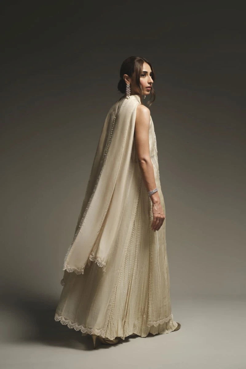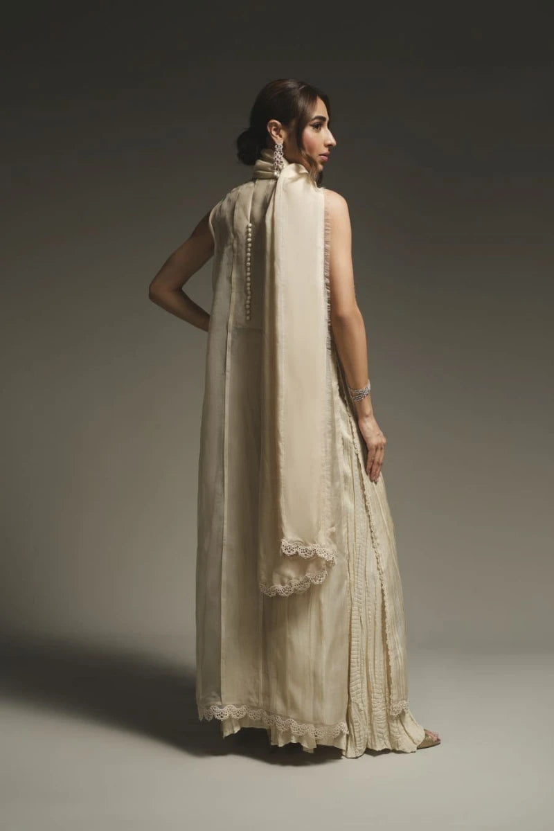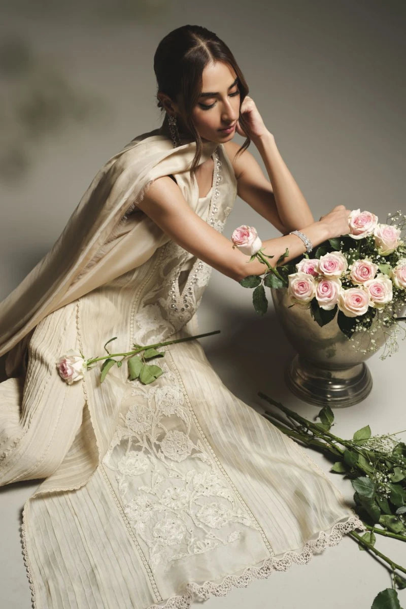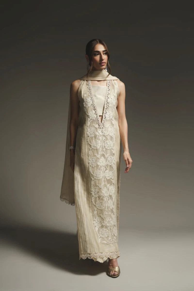 This elegant outfit in light ivory beige showcases a deep V-neckline adorned with lace embroidery along the front, enhanced with Swarovski work. The shirt is crafted from pure organza and georgette chiffon, featuring satin embellishments. Paired with pure silk crushed trousers. A light, sheer dupatta made from pure chiffon and satin drapes gracefully, completes the outfit. The neutral tones and exquisite details make it a perfect choice for formal occasions.