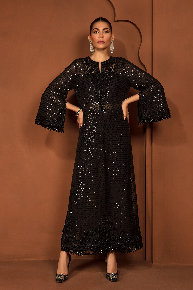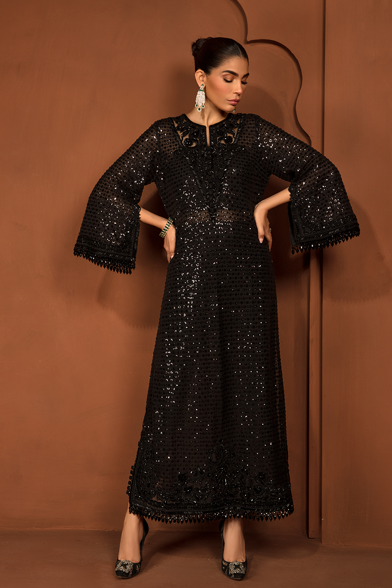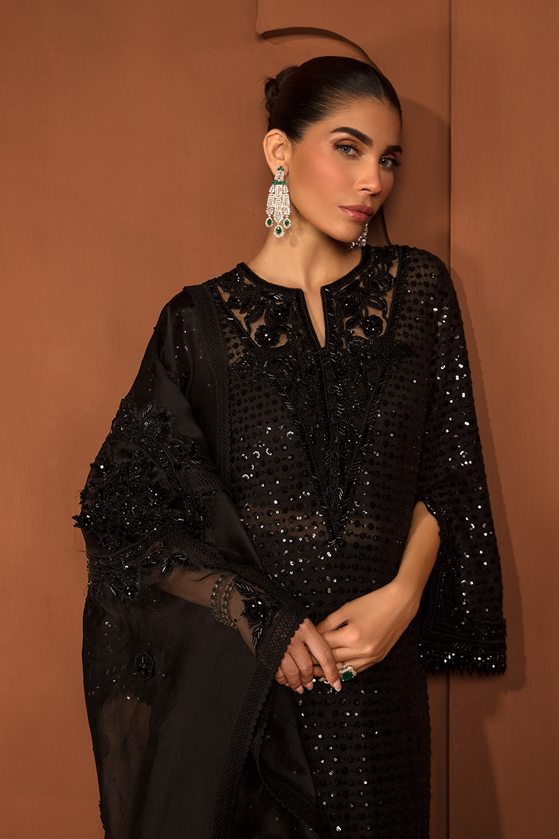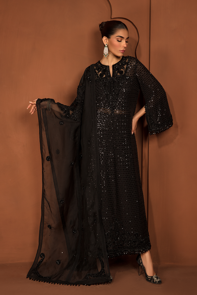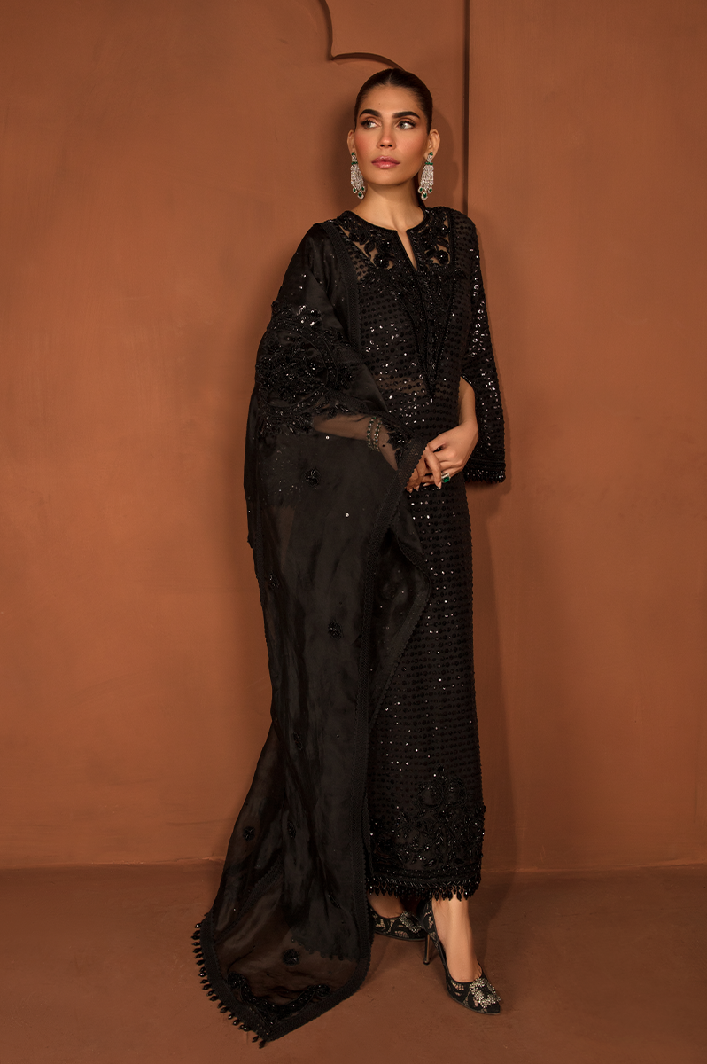 Description: Drape yourself in the elegance of "MIDNIGHT." This ready-to-wear three-piece ensemble in Black comprises a graceful net shirt, complemented by tailored raw silk trousers, and a delicate organza dupatta enhanced with self-colored beads, pearls, stones, and captivating cutwork. Discover the essence of timeless beauty and sophistication every time you grace Midnight.