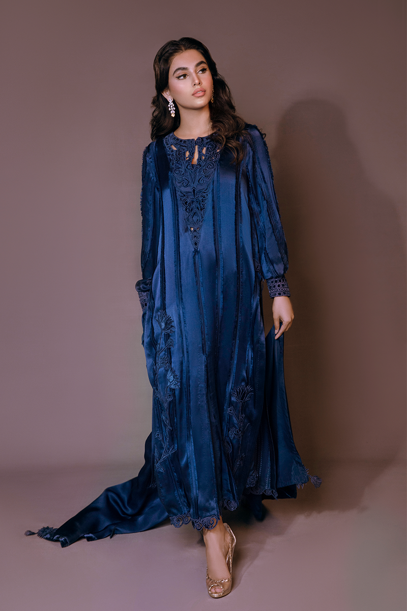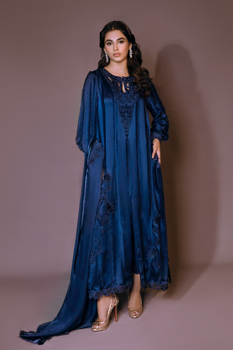 Monaco Blue is a deeply enriched midnight blue ensemble designed especially for your formal winter events. A glamorous satin shirt designed with matching velvet patterns on the neckline & sleeves fused with silk details and floral patches. It comes with a pure silk trouser and a striking satin shawl accentuated with velvet floral designs.