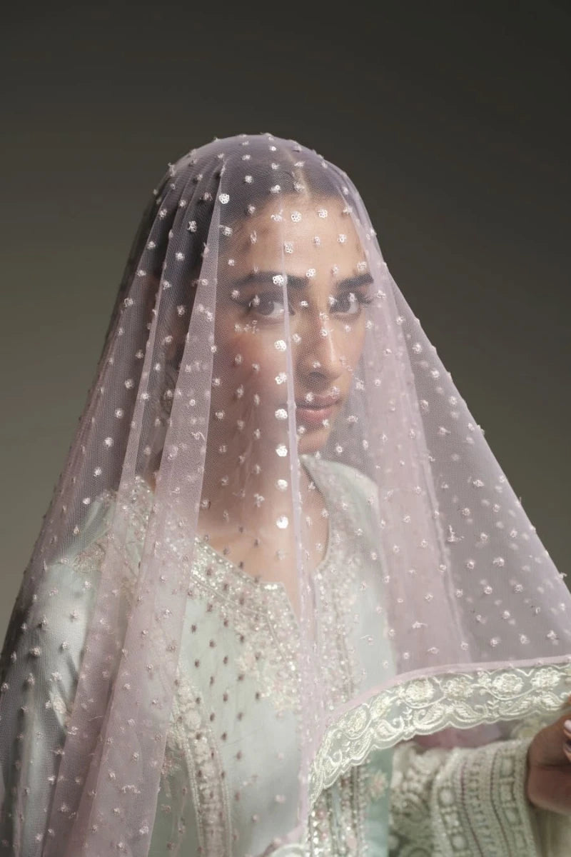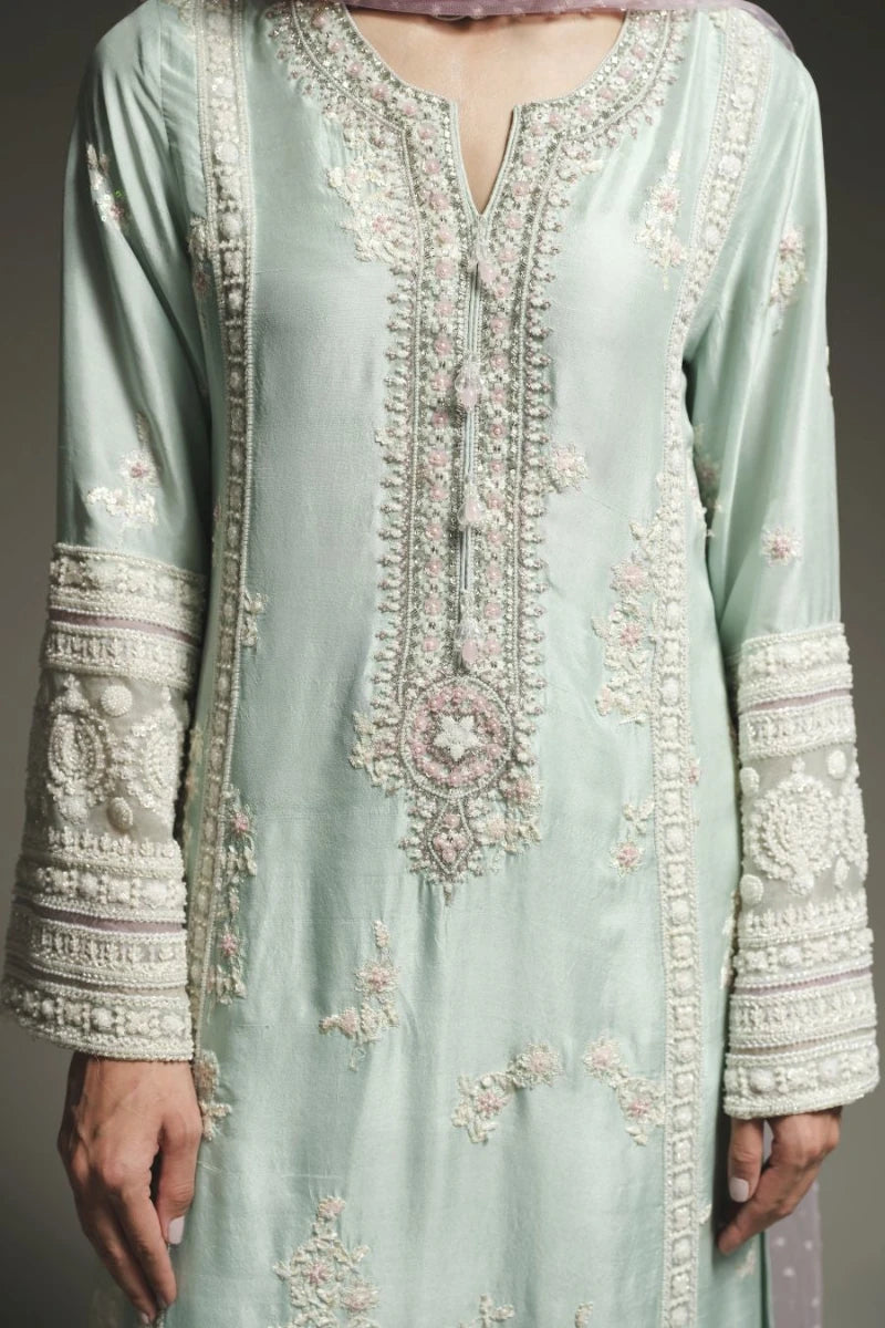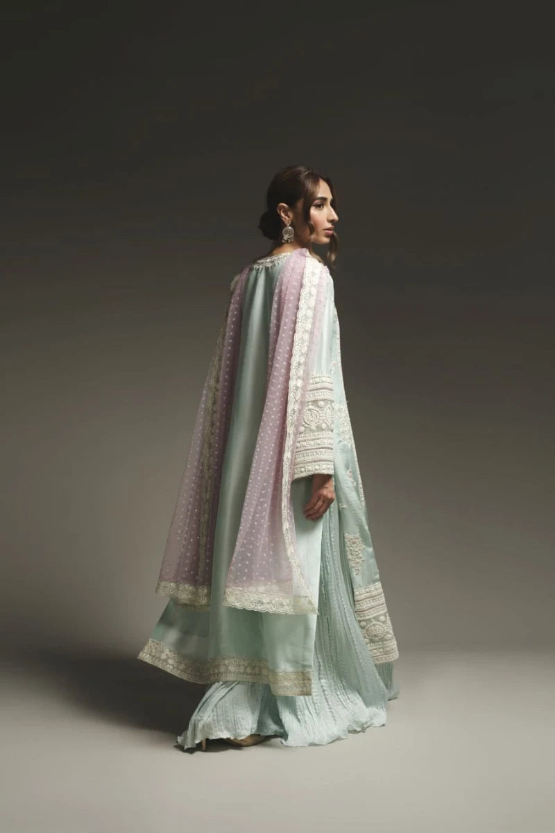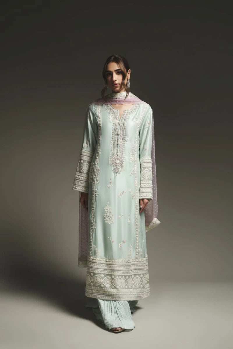 This light blue outfit features a pure raw silk shirt adorned with intricate ivory silk chikankari embroidery, enhanced with sequin and Swarovski work, and finished with a heavily embellished border for a luxurious touch. Paired with stylish pure crushed sharara pants, it adds a modern flair to the ensemble. The look is completed with a lilac pure net dupatta, delicately embellished with sequin work and intricately embroidered borders.