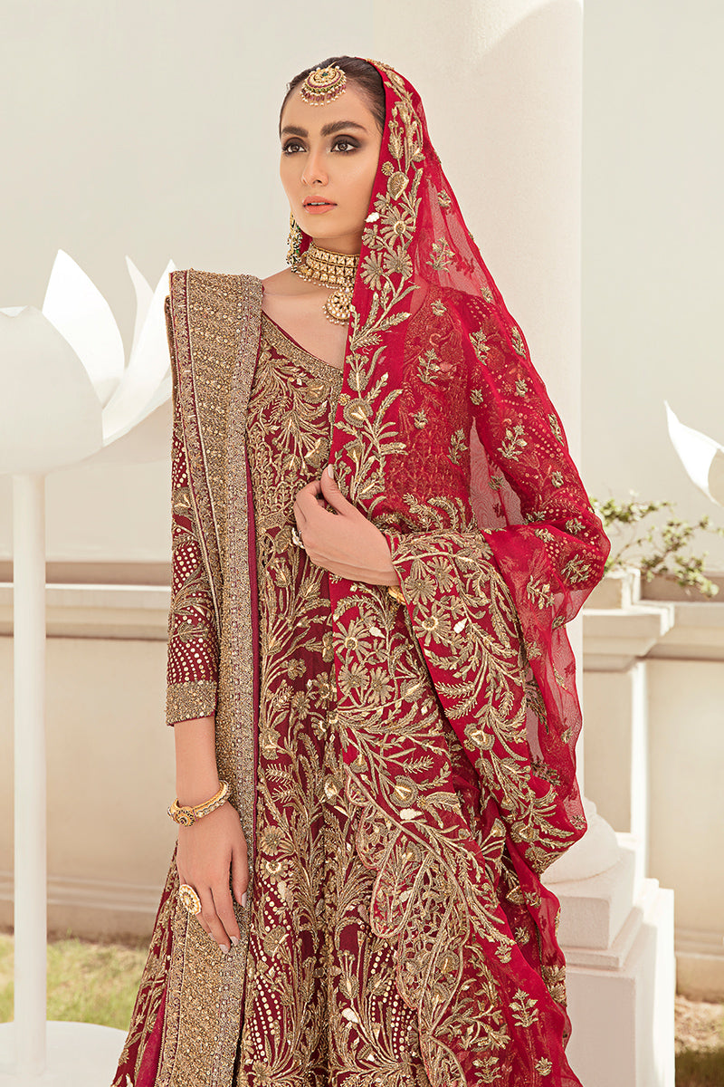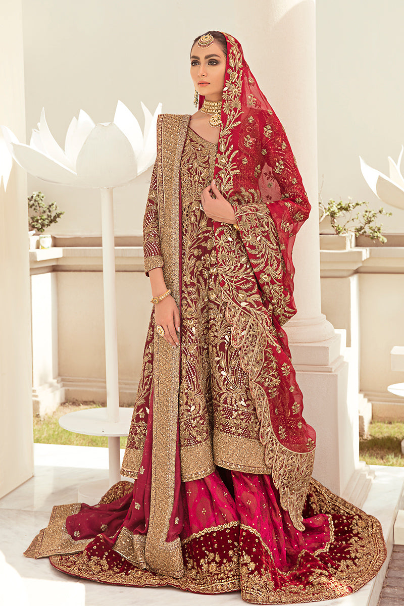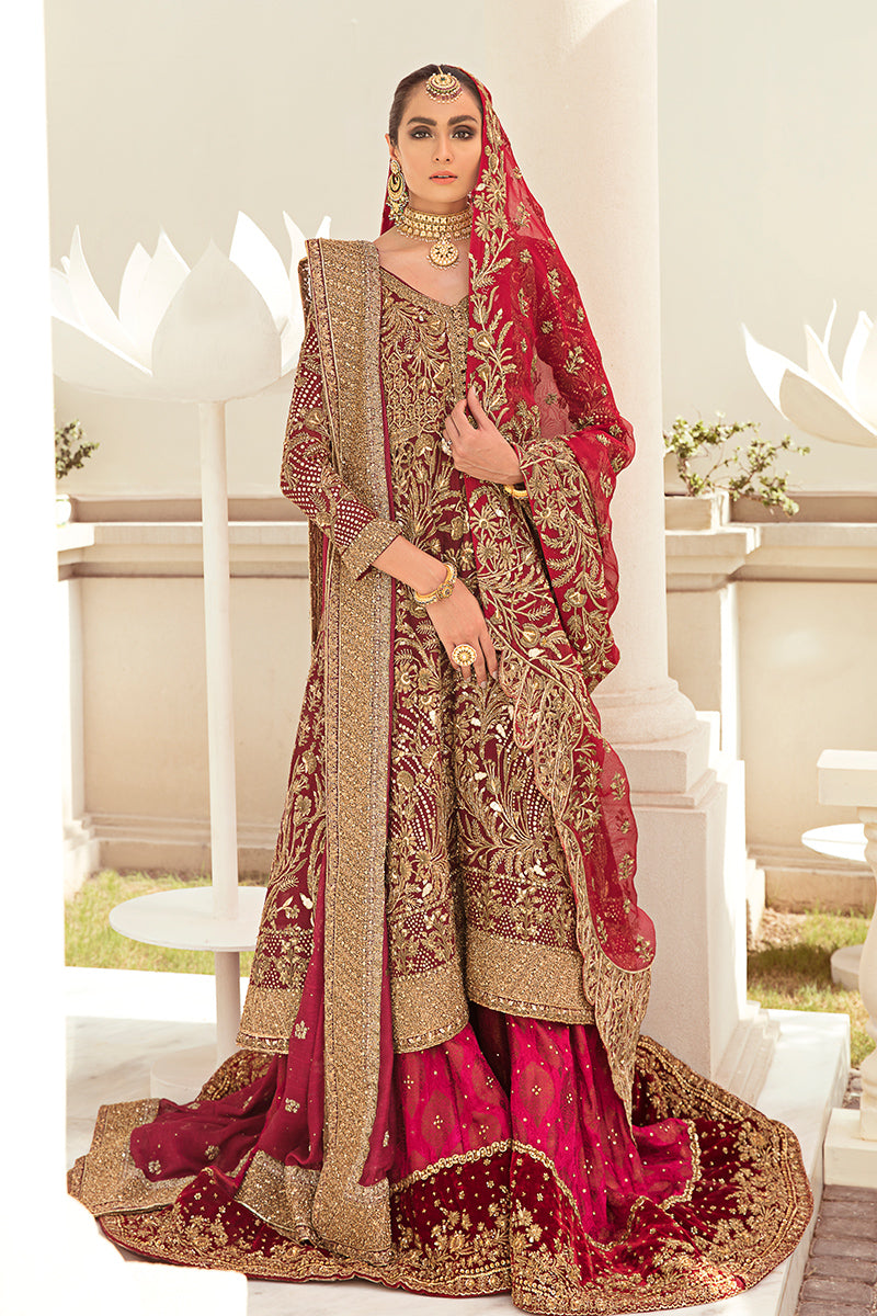 Description: Mumtaz - An Embodiment Of Femininity And Classic Love. A Crimson Red Kimkhab Farshi Sharara With Velvet Borders Handcrafted With Dabka, Nakshi, Mukesh And Sequins; All Used In A Painterly Fashion To Render Artistical Floral Keri Motifs And A Mughal-Esque Jaali Crafted Using Vintage Gold Dabka Seamed Together With Mukesh Embellishment In The Borders. The Lehnga Is Paired With A Sequin-Encrusted Full-Sleeved Flayer Pishwas And A Silk Net Dupatta With Mukesh And Sequins Borders. The Look Was Completed With An Added Red Mukesh Sequin Dupatta.