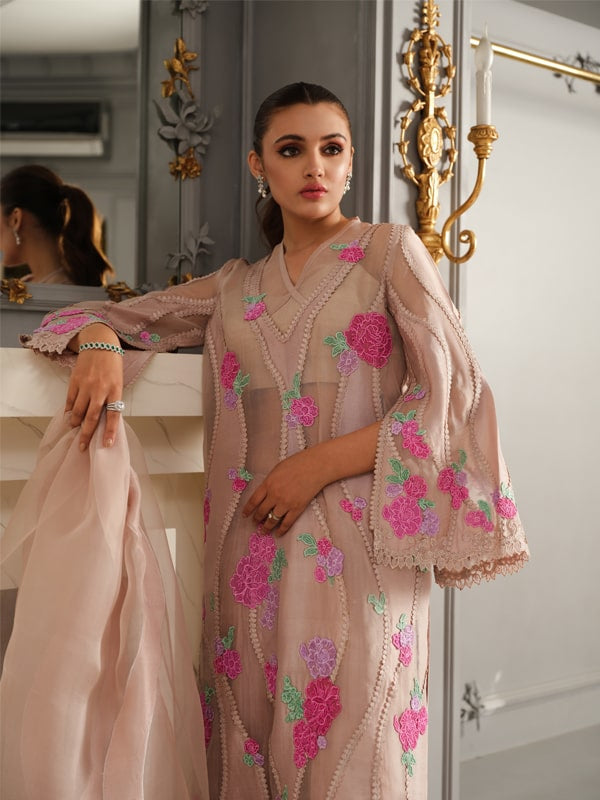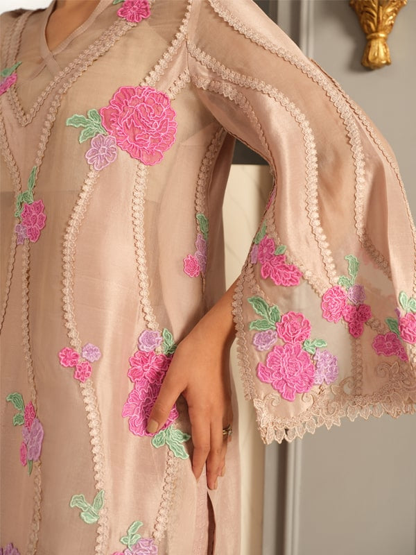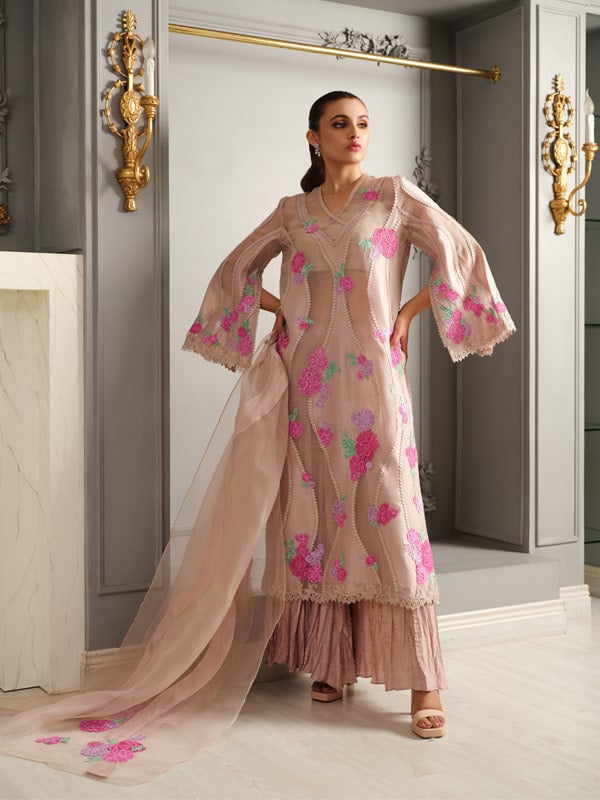 Indulge in the epitome of grace with this enchanting ensemble. The raw silk and organza shirt boasts a delicate tapestry of embroidered flowers and intricate appliqué, creating a visual symphony. Paired with crushed Korean pants, the outfit seamlessly blends comfort with style. Draped elegantly is an organza and silk dupatta, adding a touch of finesse to complete the look.