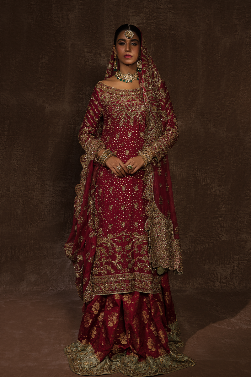 Description: Immerse yourself in the timeless allure of "NILUFER," our exquisite Red Bridal Outfit. This resplendent ensemble features a regal Cotton Net shirt adorned with delicate Dabka, Naqsi, Sitara, and Mukesh work, reminiscent of the stars shimmering in the night sky. Embrace the beauty of tradition with a Lehnga crafted on the luxurious Khimkhab fabric, adding a touch of opulence to your special day. The ensemble is completed with a flowing Cotton Net Dupatta that whispers tales of grace and poise.