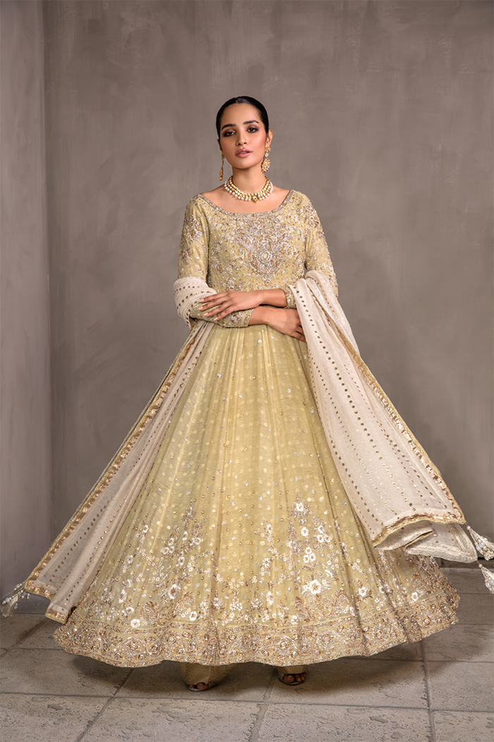 Yellow lime colored cotton net full length pishwas with fully worked bodice heavenly filled with traditional work like dabka, sitara.