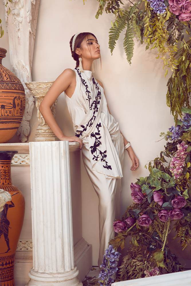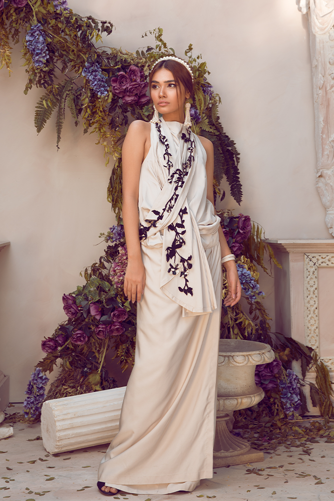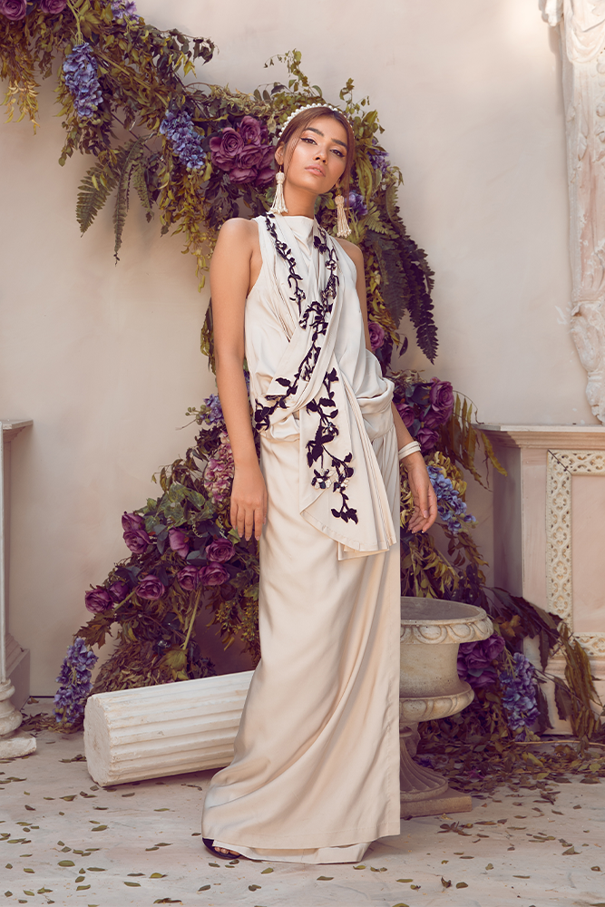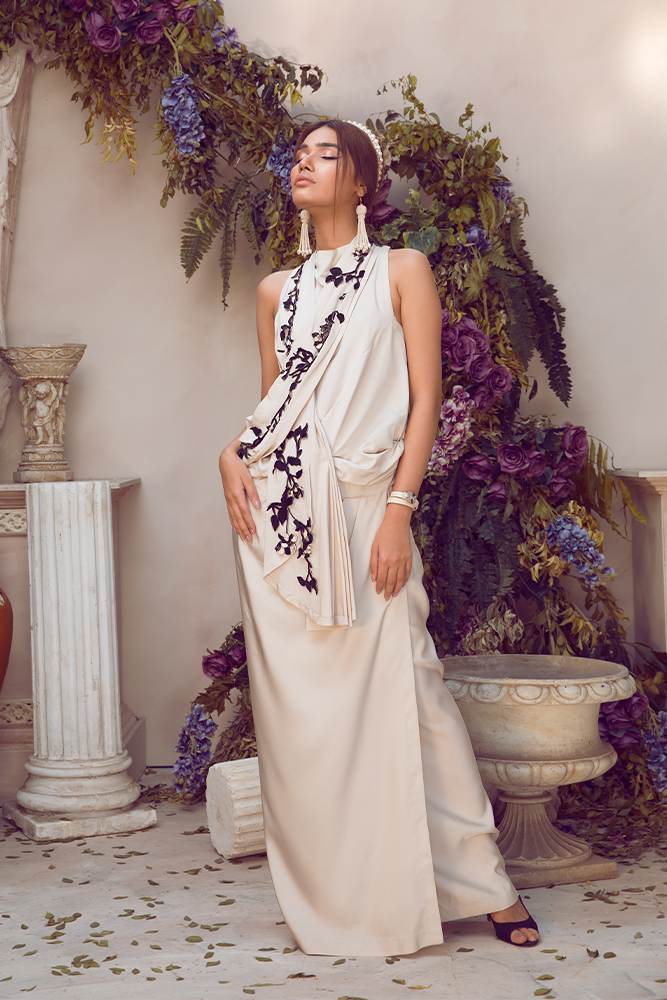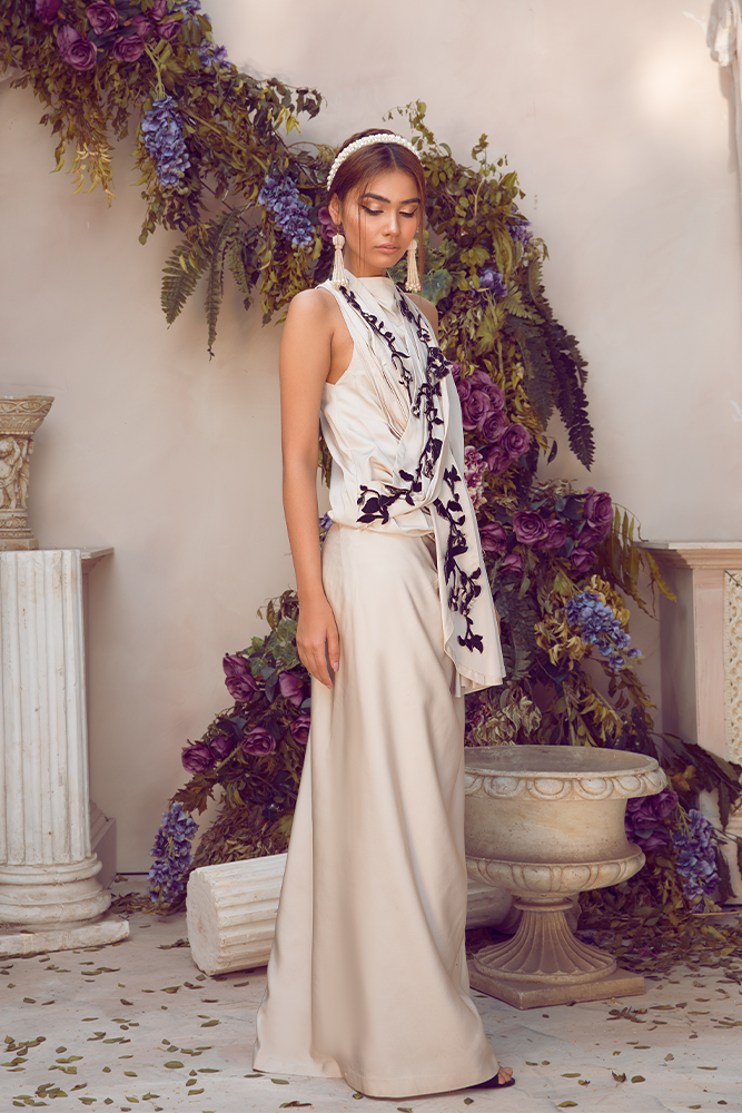 Description: This outfit radiates a symphony of grace and charm embellished with sequins and bead work on pure silk.