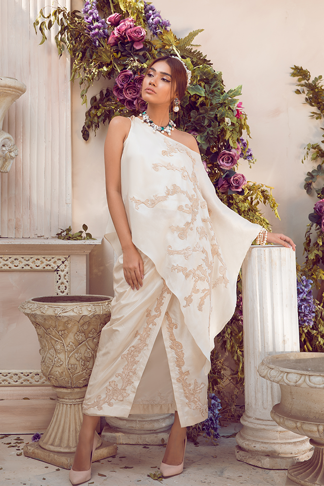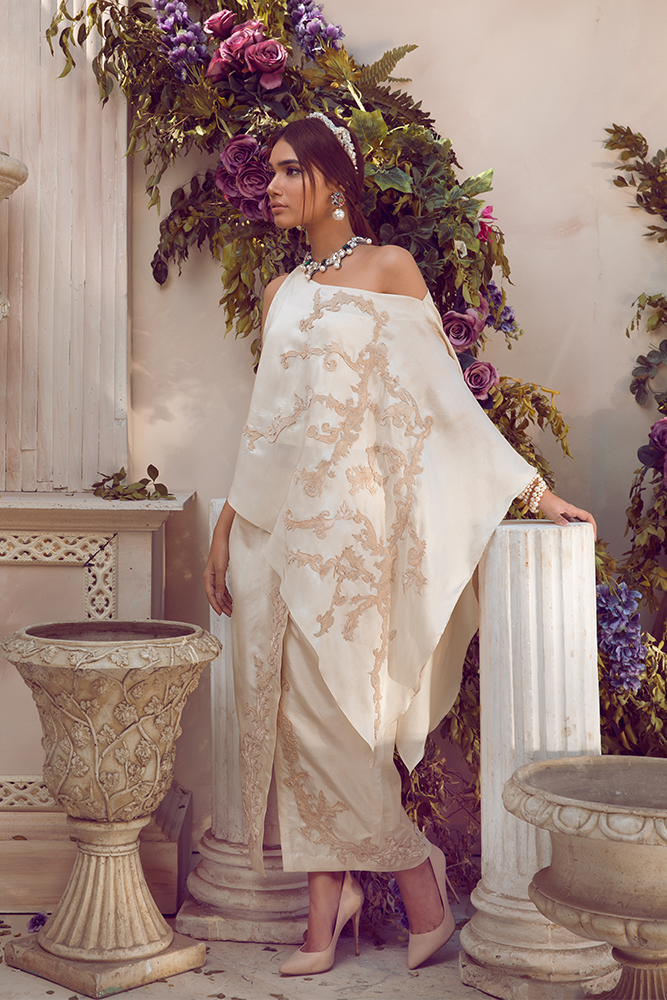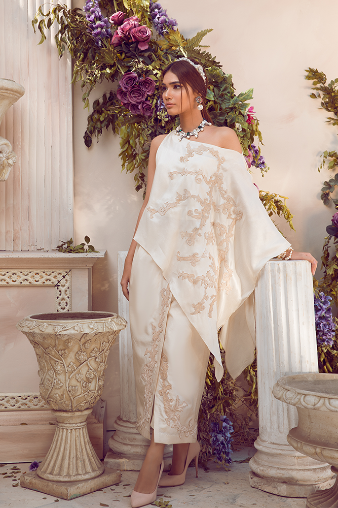 Description: Ivory one shoulder pure silk cape with embroidery paired with open embroidery engraved skirt.