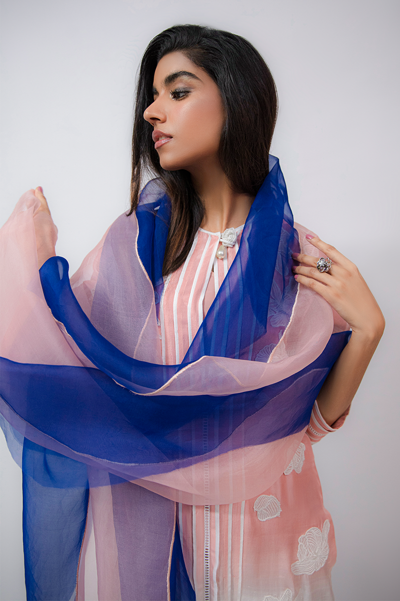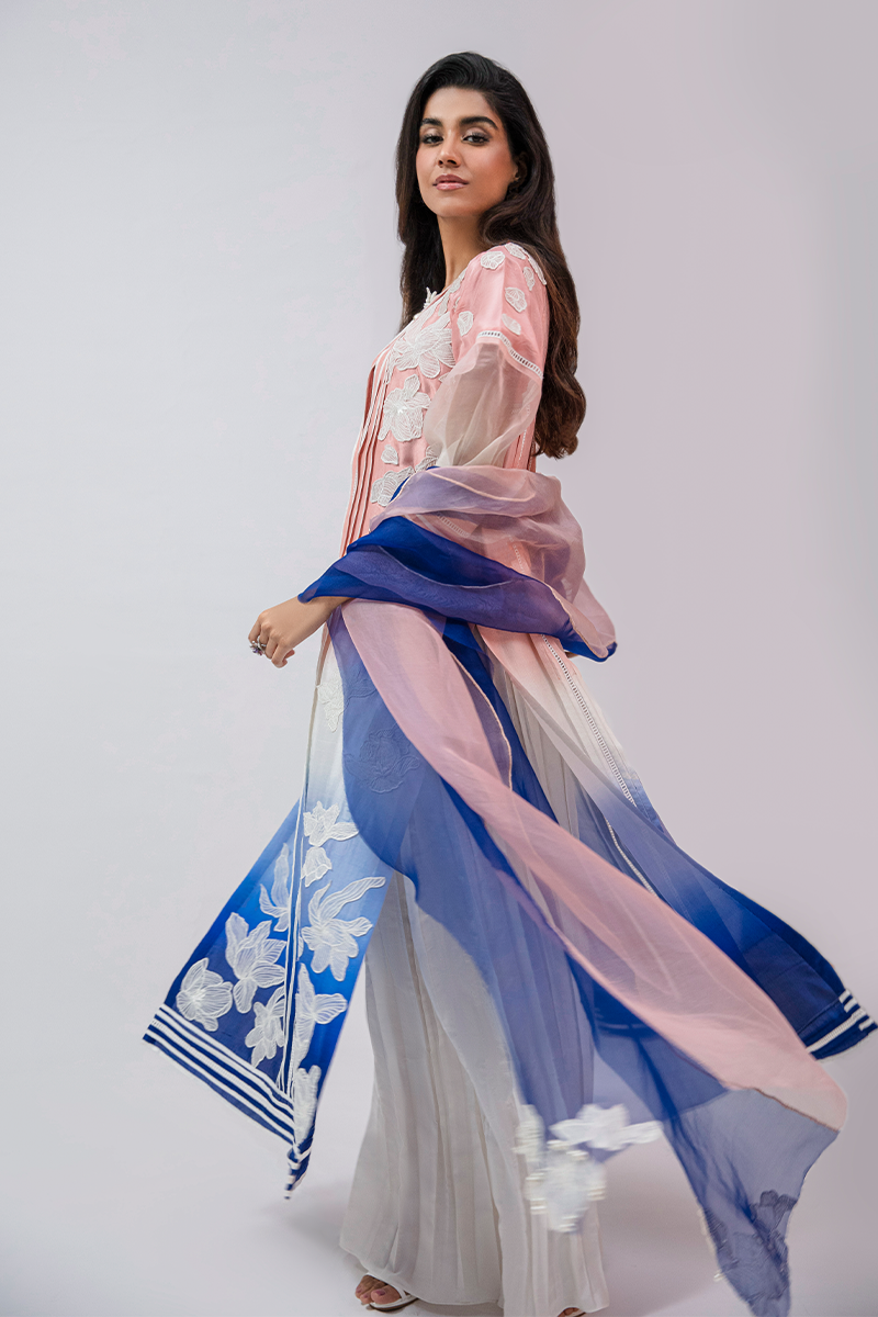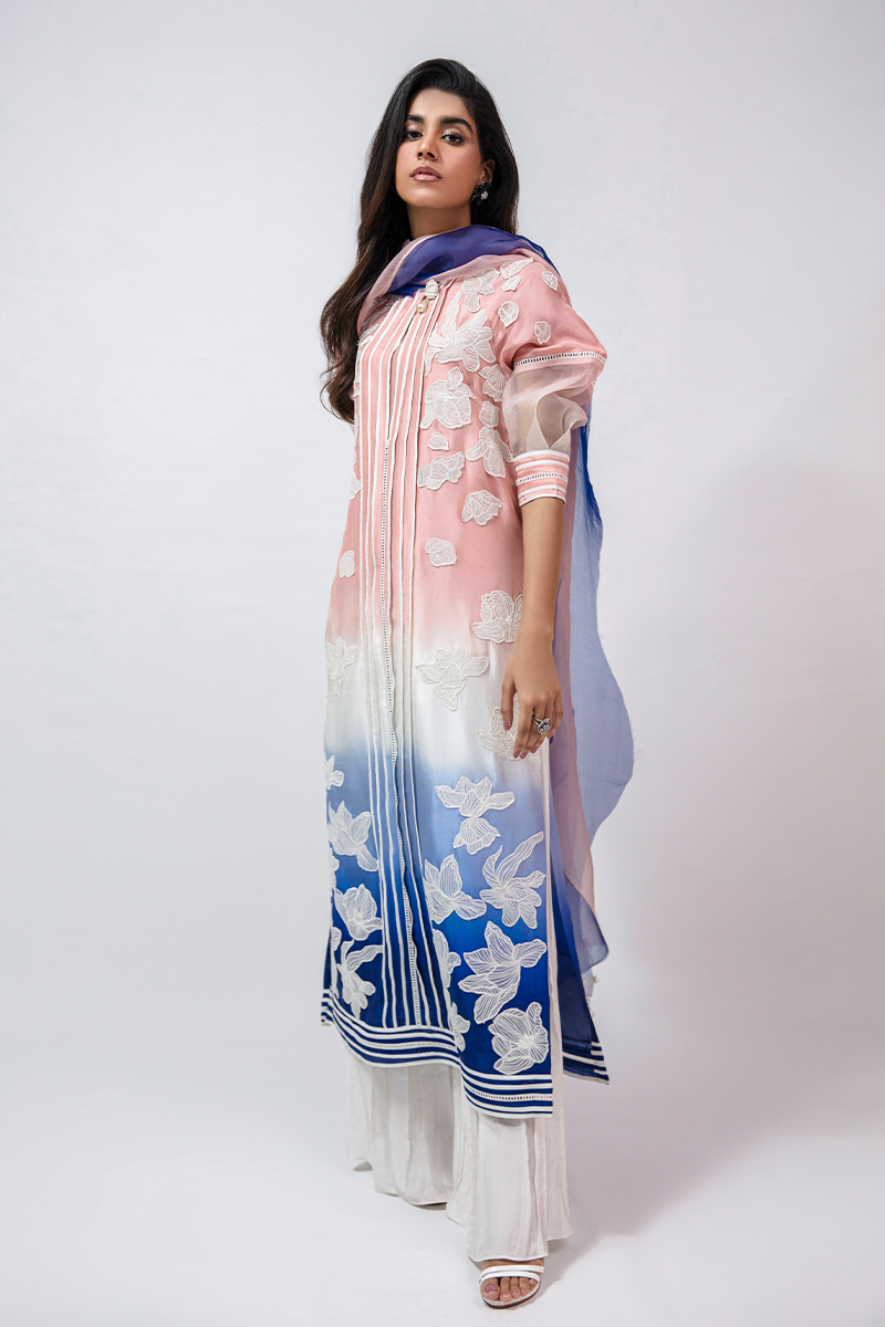 Description: With its fresh silhouette, perfectly blended tones, and sophisticated embroidery, Ombre will give you a perfect summer festive vibe this Eid. The mesmerizing blend of coral, blue, and white is enhanced with floral appliques and is paired with white press pleated pants and a heavenly shaded dupatta, giving it a perfectly captivating grace.