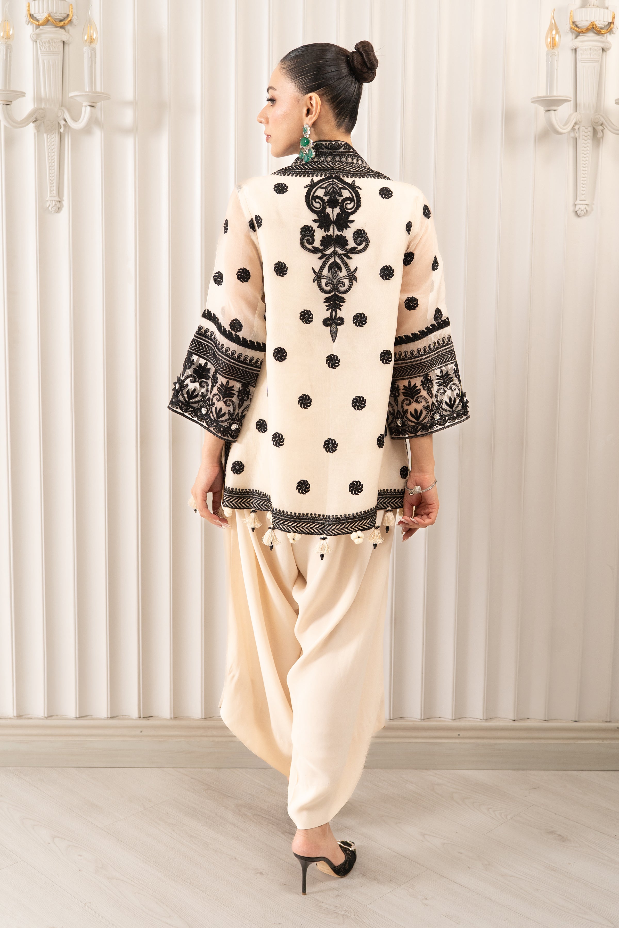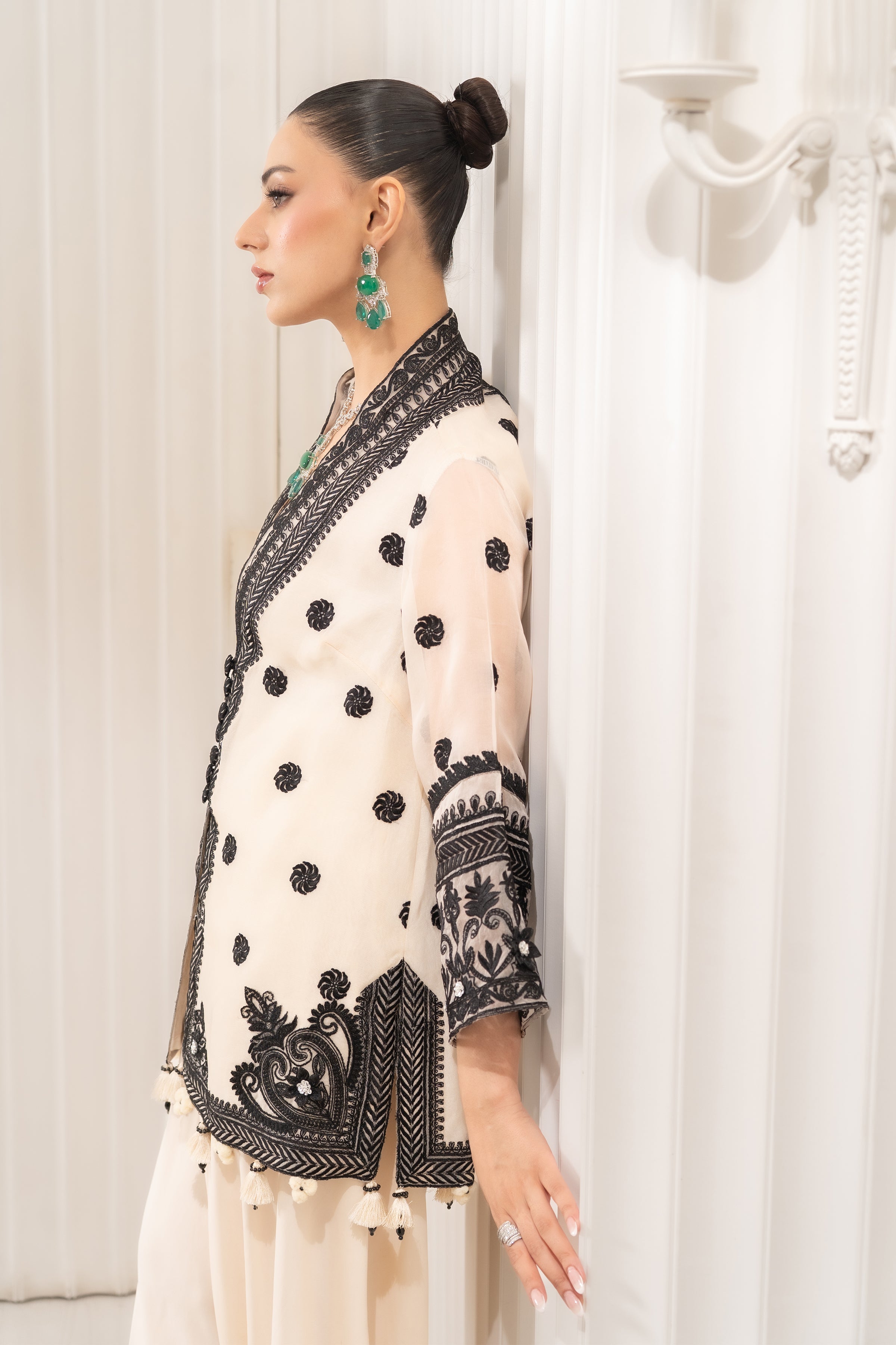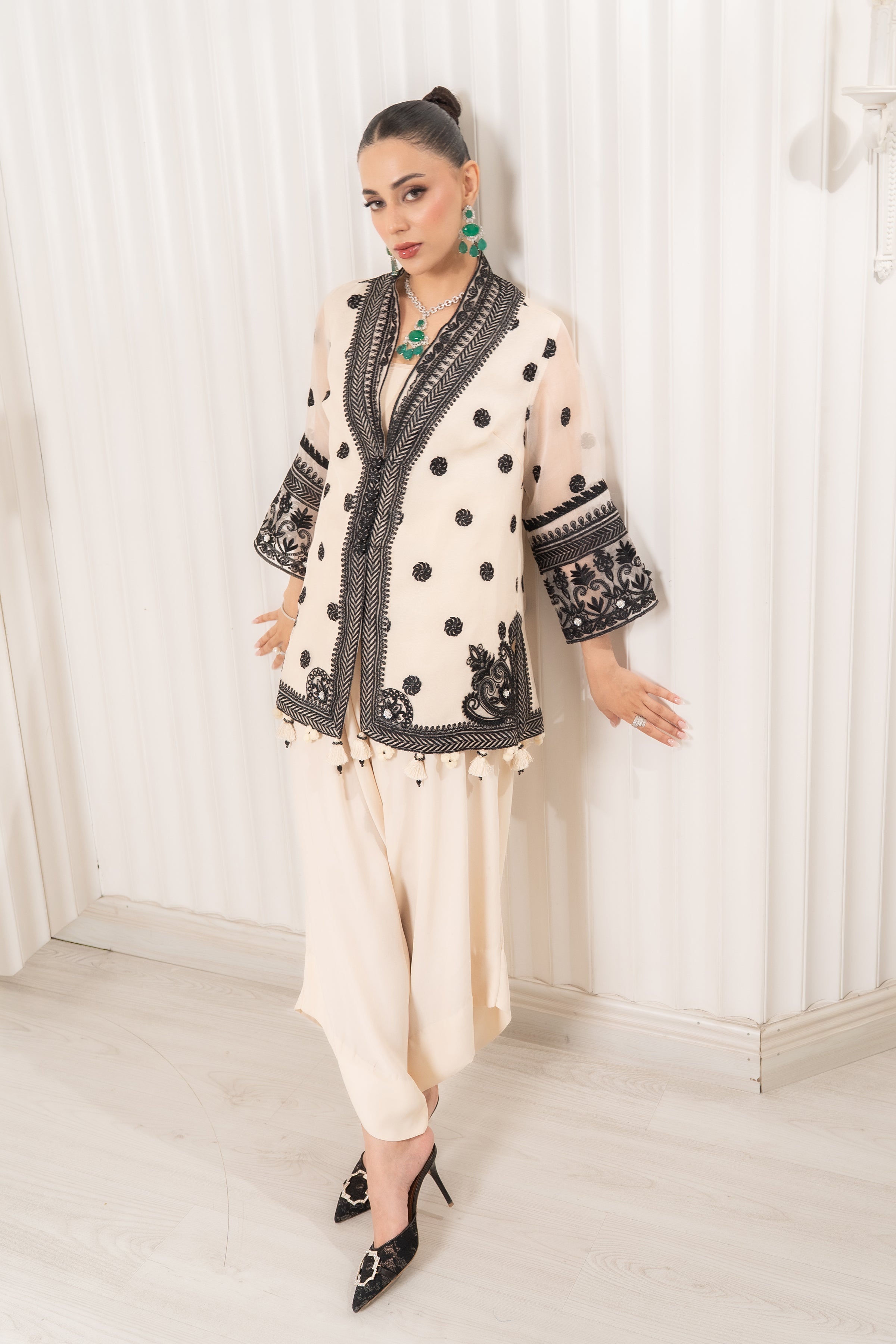This chic two-piece ensemble features a stunning pure organza jacket in a light shade. The jacket is beautifully adorned with intricate black embroidery and buttons embellished with glistening Swarovski flowers. It is paired with unique crepe asymmetrical pants that complete this modern and elegant look.