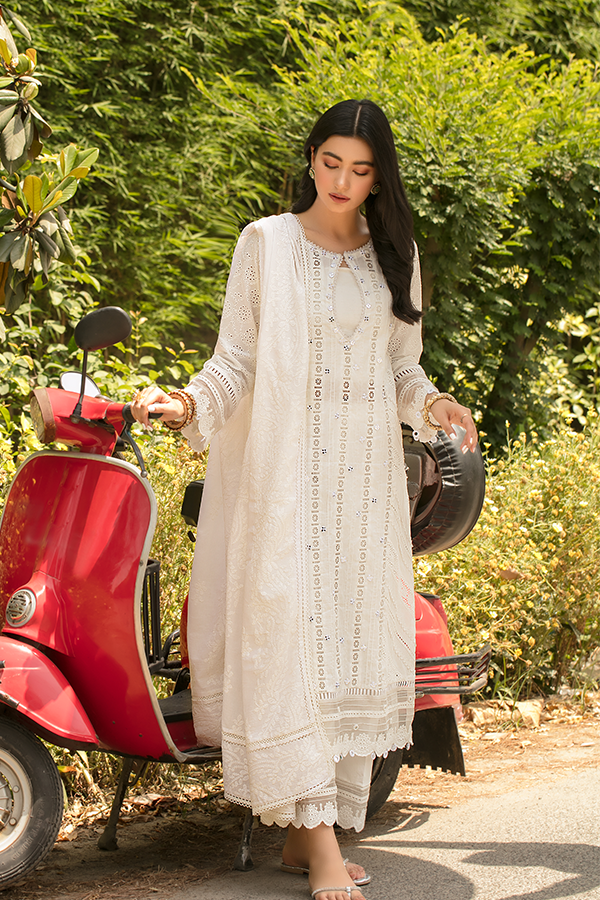 Description: Porcelain endorses a tale of delicacy along with intricacy with its contemporary silhouette. The white chikan kurta is ethereally enhanced with mirror work finishing and laces. Paired along is a lovely cotton embroidered dupatta and cotton azaar pants, creating a subtle yet dreamy look.
