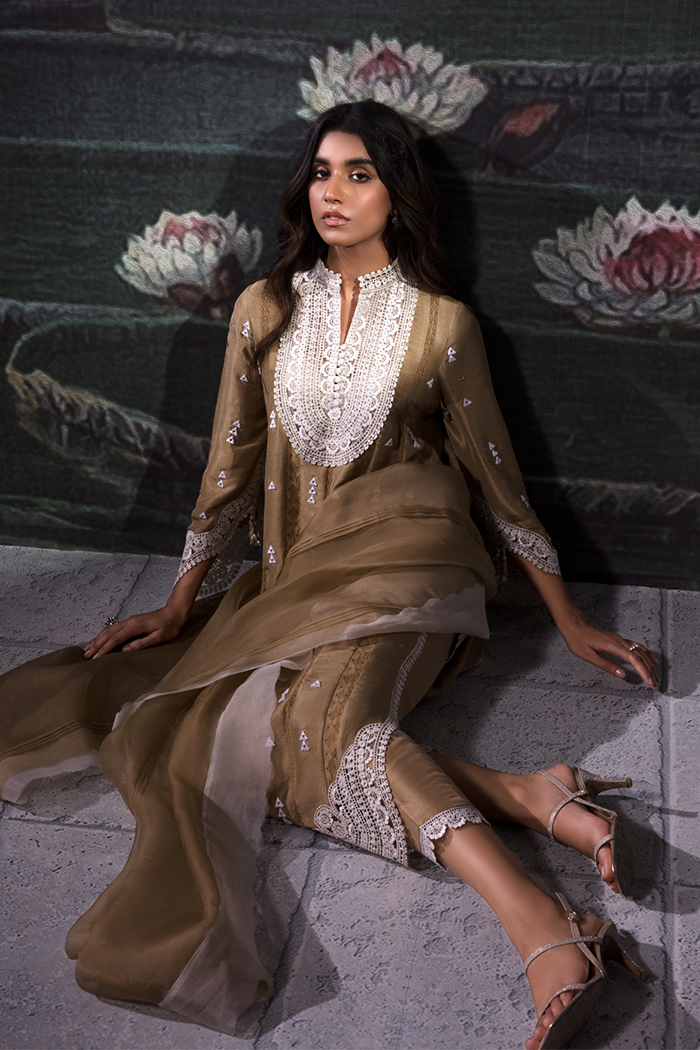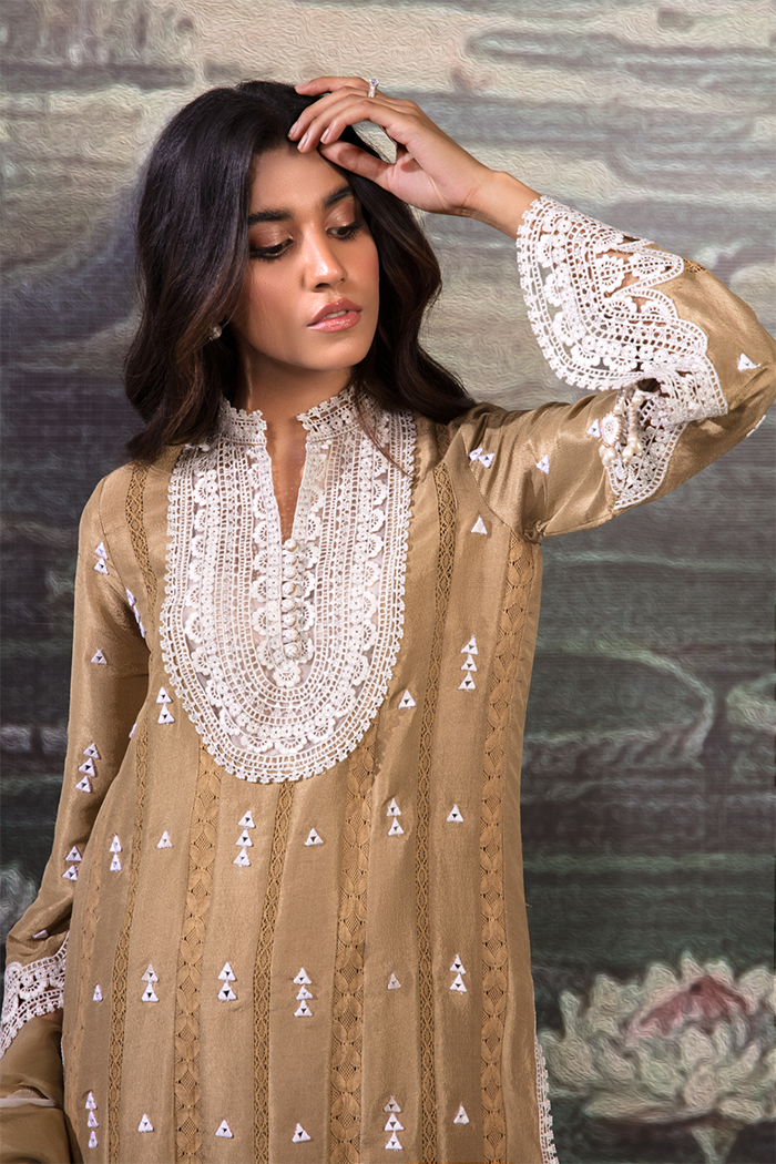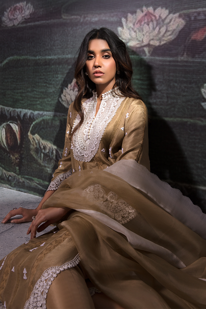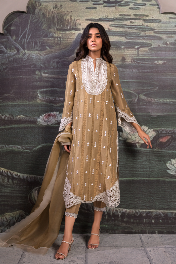 A perfect definition of elegance featured mustard colored with lace detailing on neckline, sleeves borders and daman enhanced with mirror work paired up with shalwar and organza dupatta