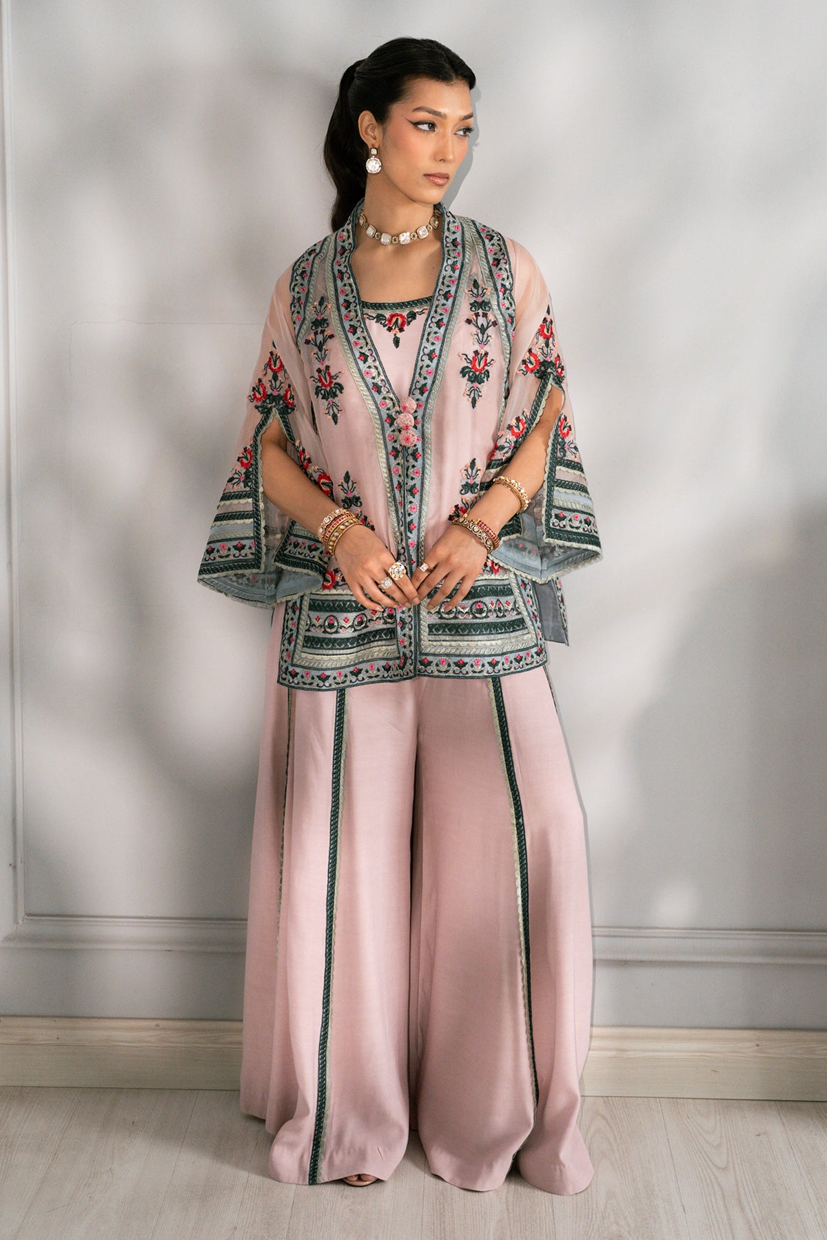 Designed in ethereal dusty rose organza, this open-style jacket is intricately adorned with multi-hued embroidery featuring vibrant floral and geometric motifs. The sheer jacket is layered over a matching silk slip and further elevated with deep green embroidered borders along the daman and wide, split sleeves. Styled with coordinating, free-flowing grip silk pants featuring vertical embroidered panels that elongate the silhouette, this ensemble creates a sophisticated and timeless look, perfect for elegant daytime dalliances.