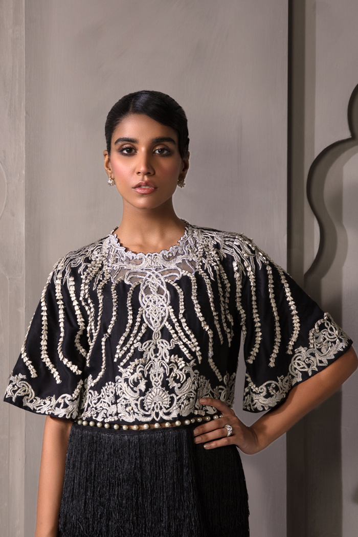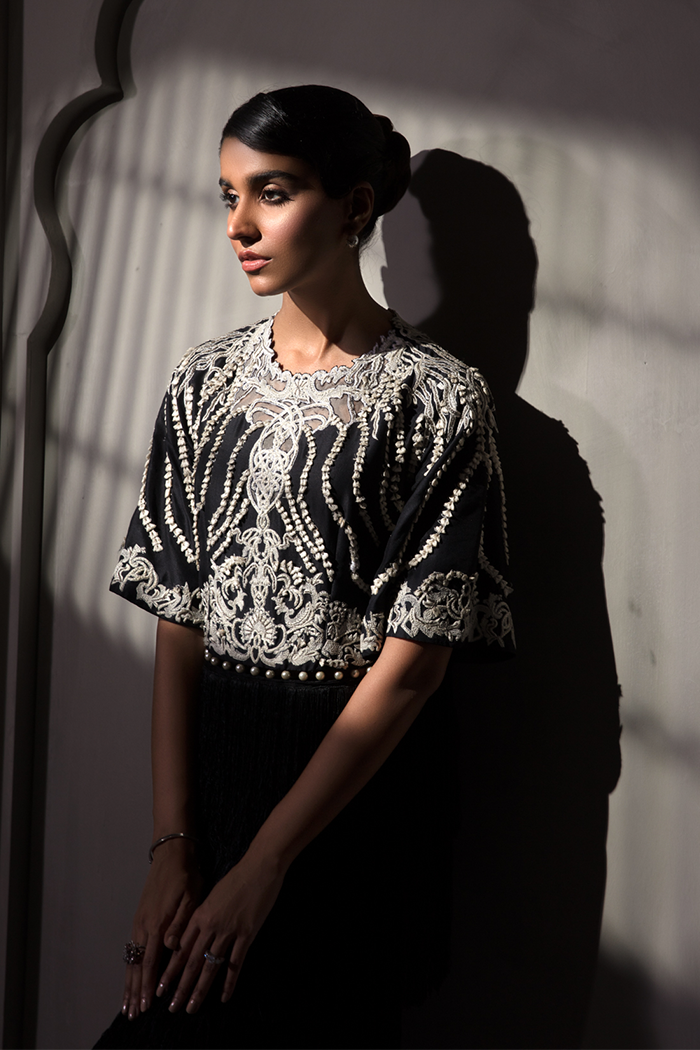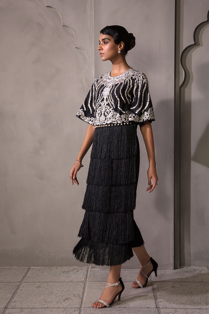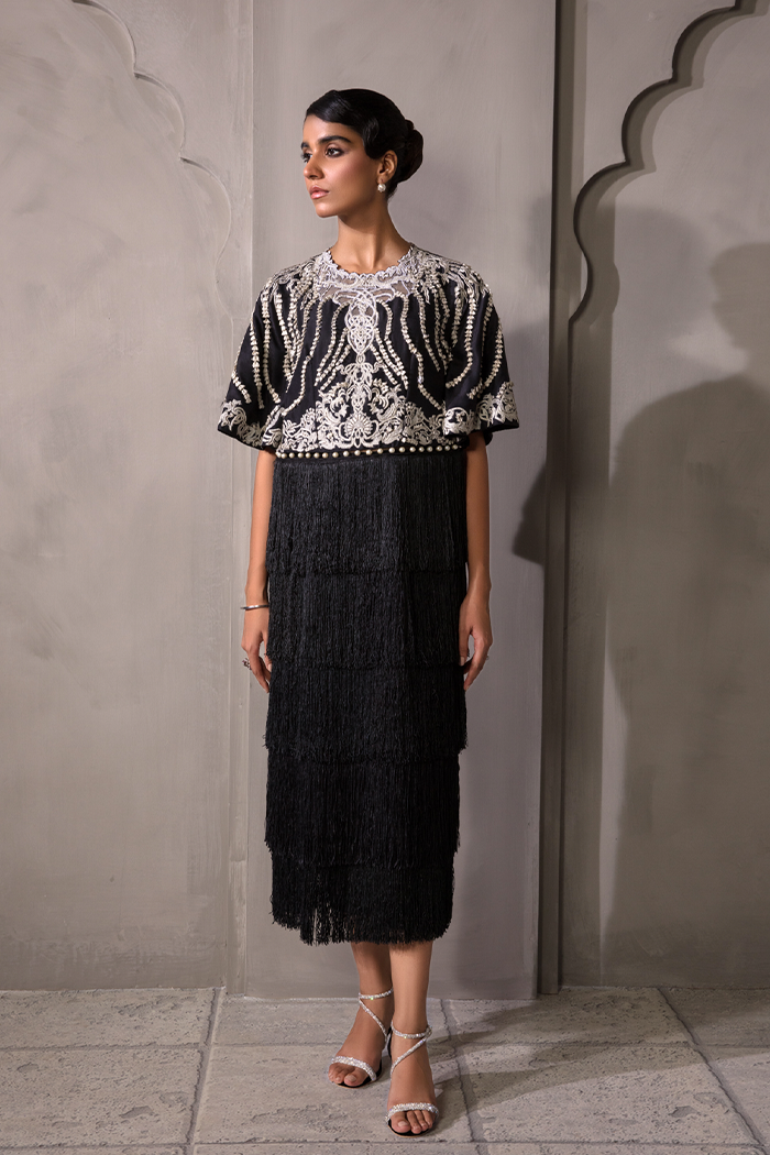 Beautiful hint of Victorian era, black based dress with white applique of beautifully crafted hand embroidery finished with layers of tassels. Paired with straight pants. A perfect retro style.