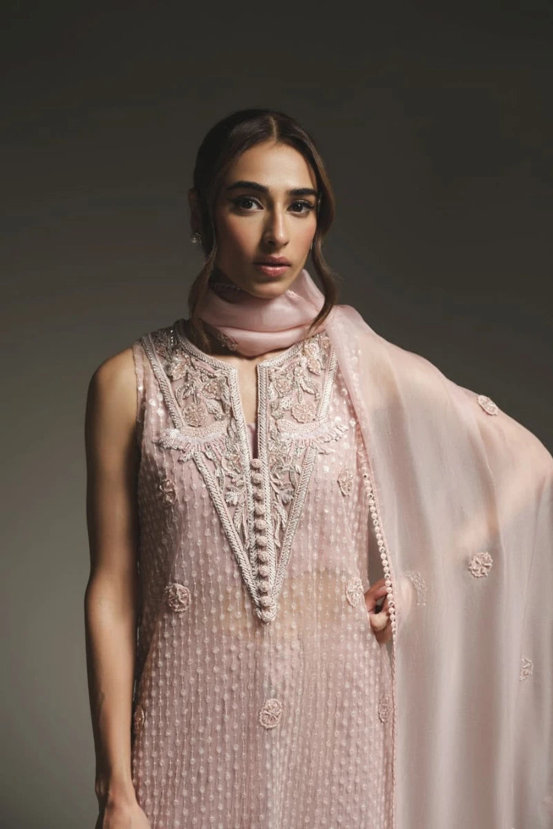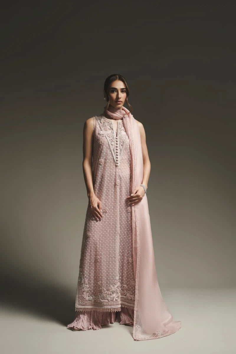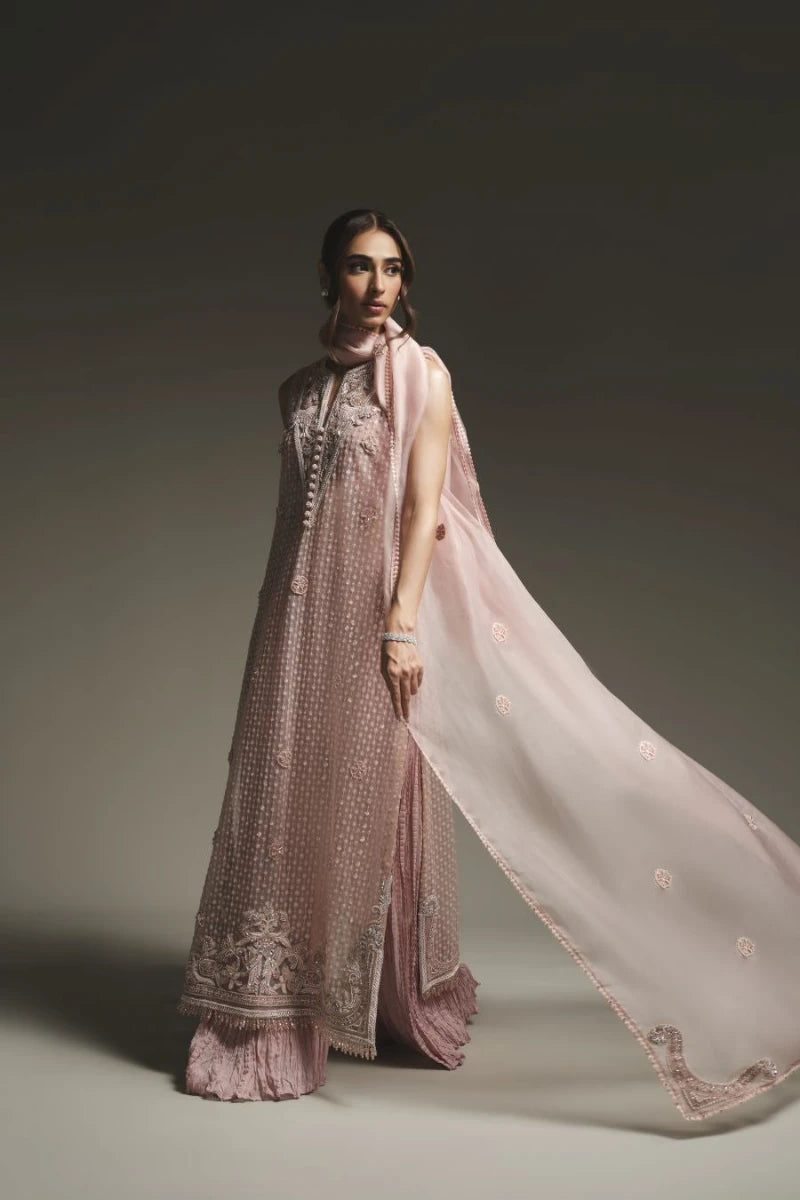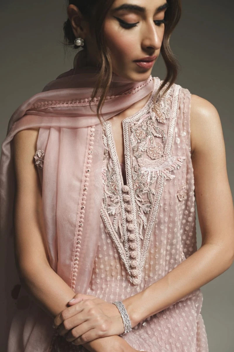 This modern pink outfit showcases a long net shirt, adorned with intricate sequin work and detailed embroidery, giving it a luxurious touch. It’s paired with stylish crushed pants, adding a contemporary flair to the ensemble. The look is completed with a soft pink organza dupatta, beautifully finished with elegant edging.