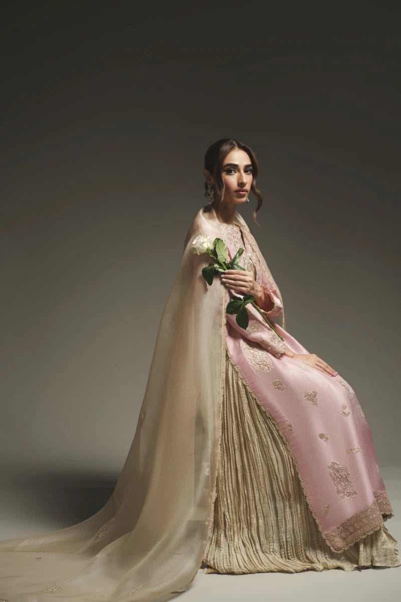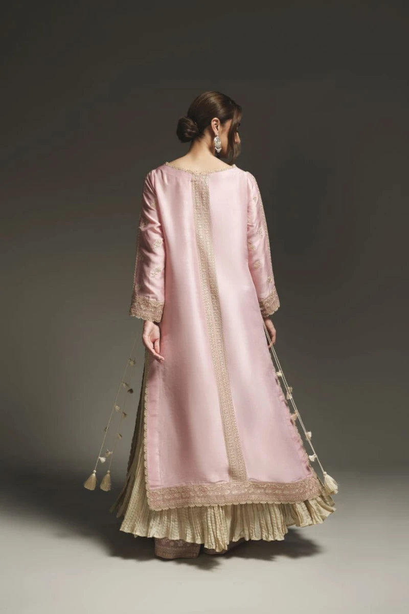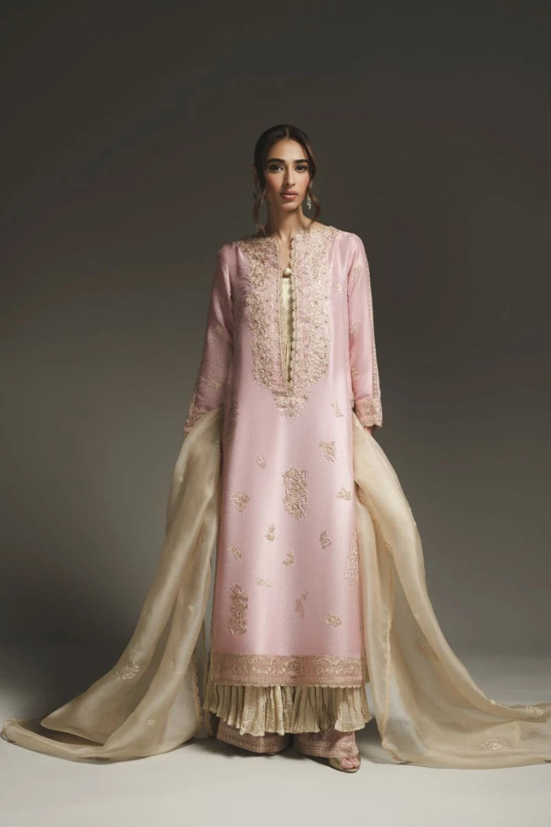 This ensemble features a soft pink pure raw silk shirt, embellished with intricate beige silk chikankari embroidery, enhanced with sequins and Swarovski detailing, offering a timelessly elegant look. The outfit is paired with beige pure raw silk trousers and a crushed pure silk underslip, adding a touch of texture and sophistication. The beige pure organza dupatta is delicately adorned with sequin motifs and embroidered borders all around, creating a balanced and graceful aesthetic, perfect for formal occasions.