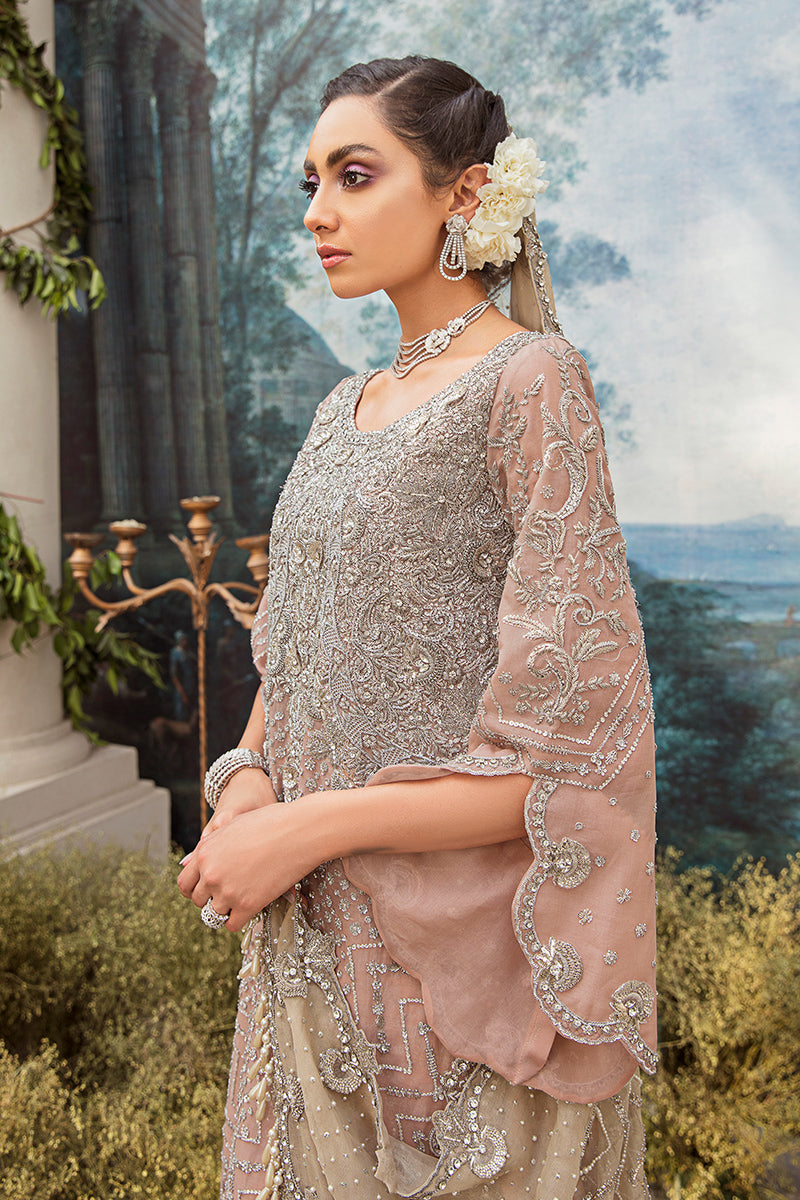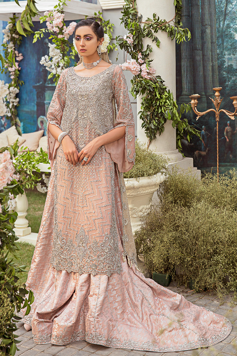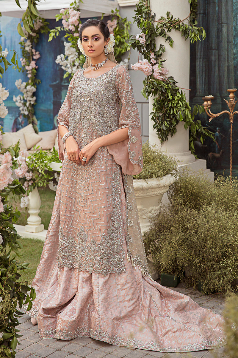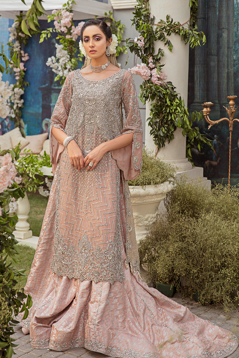 Description: Iridescent embellishments and dreamy silhouettes flawlessly amalgamate to create “Rossa”. Composed on soft pink organza long shirt with intricately detailed kora dabka, naqshi, mukesh, sequins and beads making this heirloom bridal our signature design’s house with timeless craftsmanship. It is paired with a kimkhaab sharara and ivory organza dupatta; an ode to old-world charm and vintage allure, this timeless piece is the embodiment of glamour and grandeur.