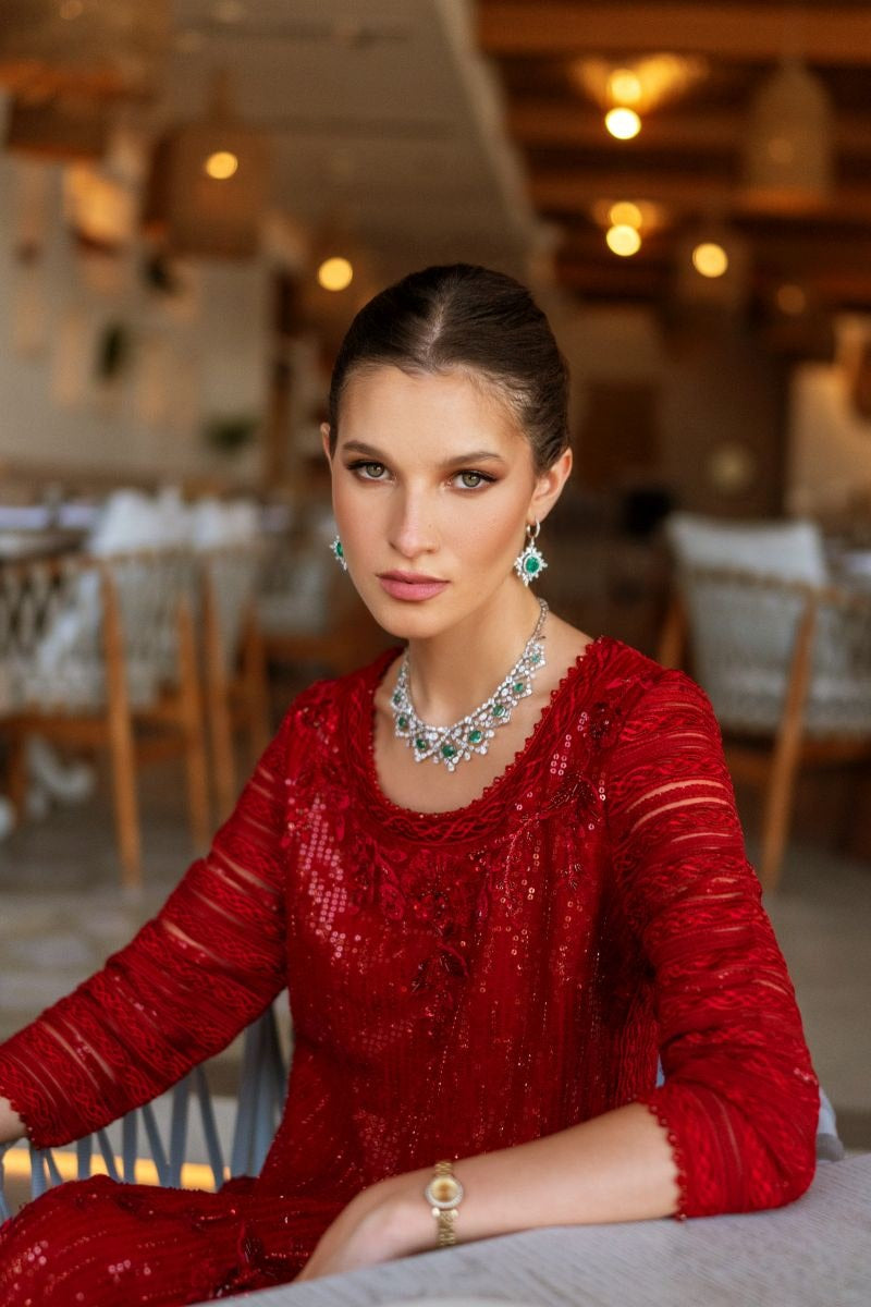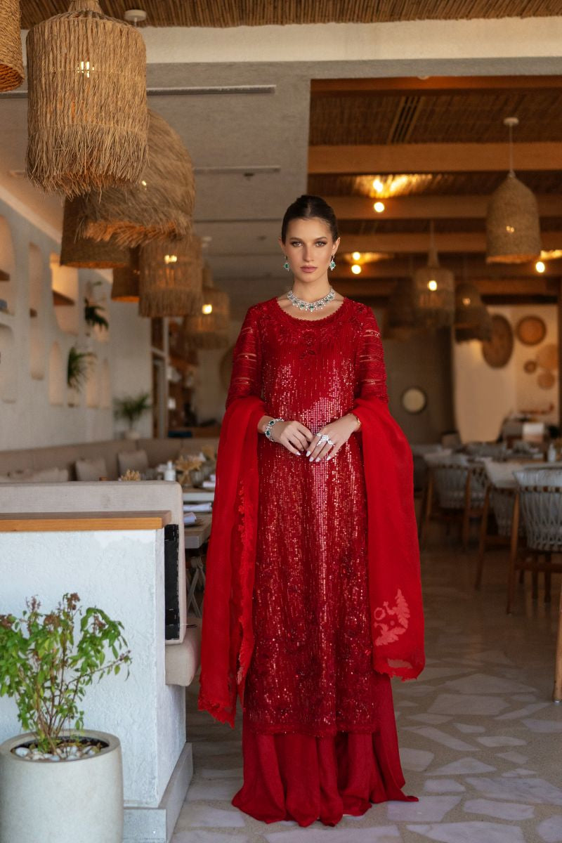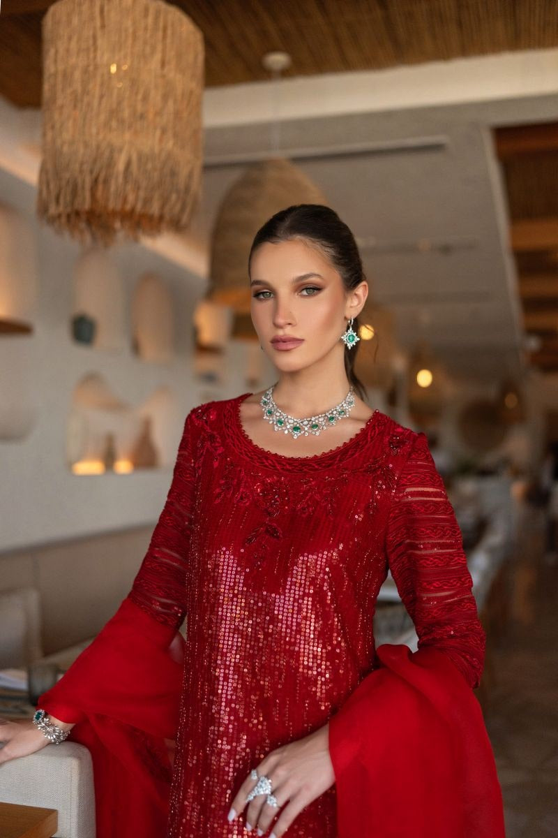 Introducing a dazzling ensemble in deep red that epitomizes modern elegance. The outfit features a long shirt crafted from net sequence fabric, adorned with shimmering sequins for a touch of glamor. Complemented by pants in luxurious raw silk, and an organza dupatta that adds a light, airy touch, this set blends bright, bold hues with sophisticated design. Perfect for making a statement on any special occasion.