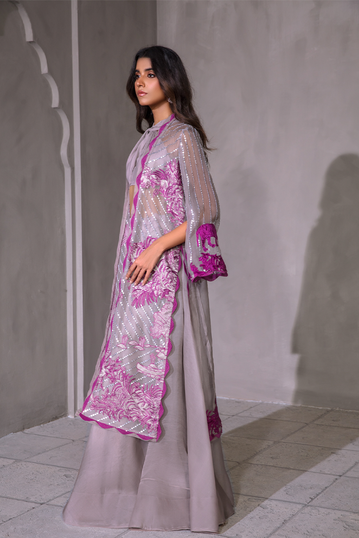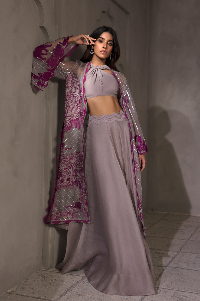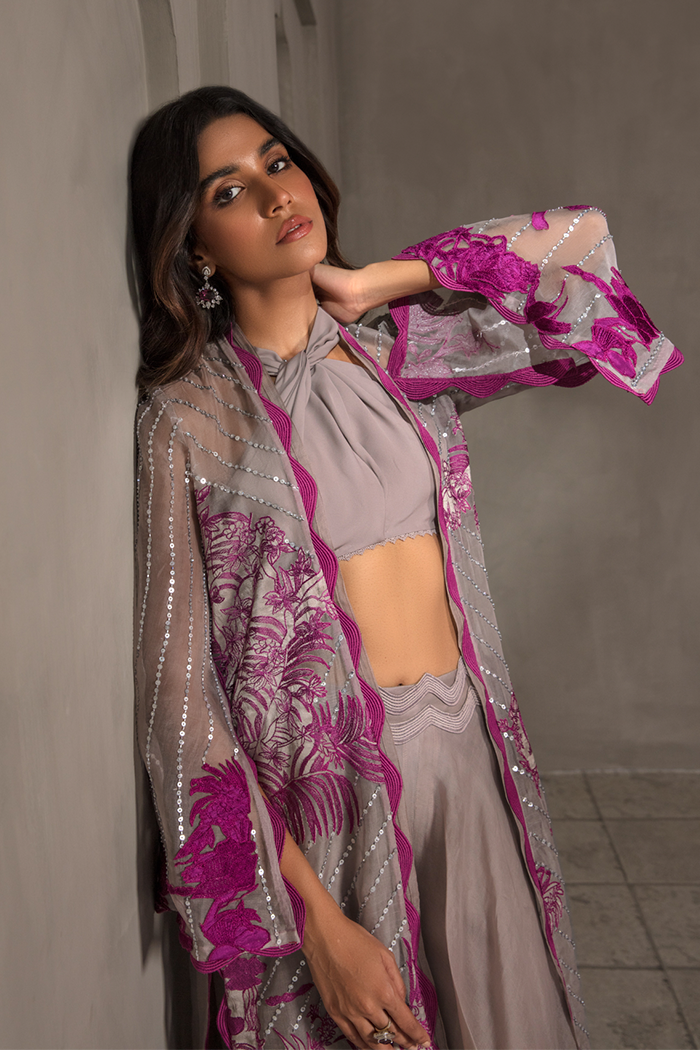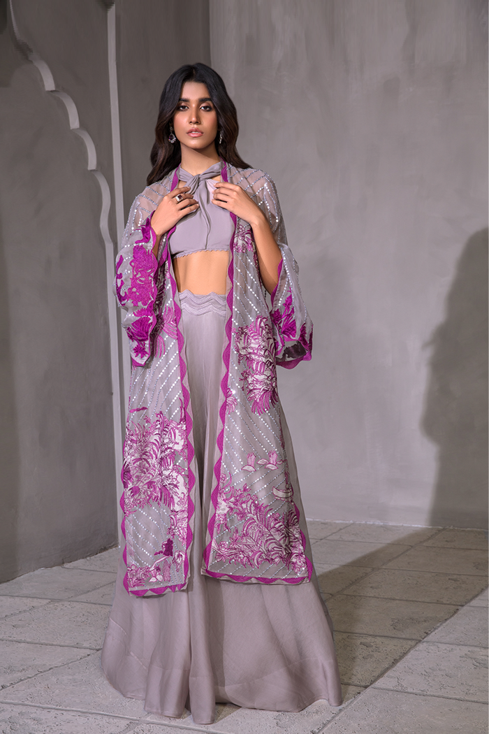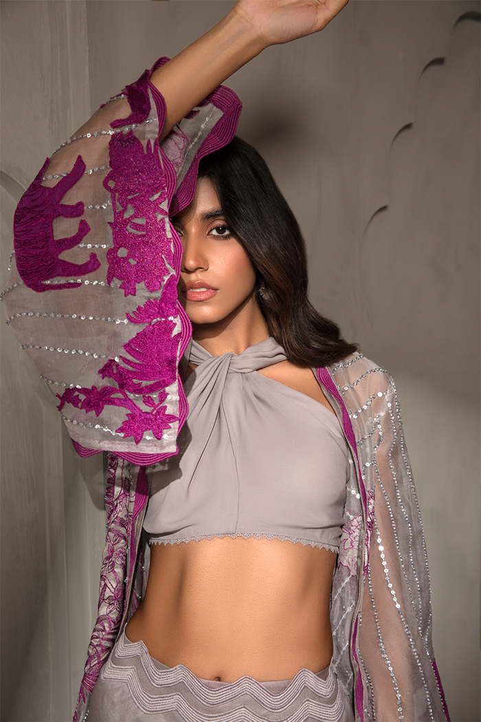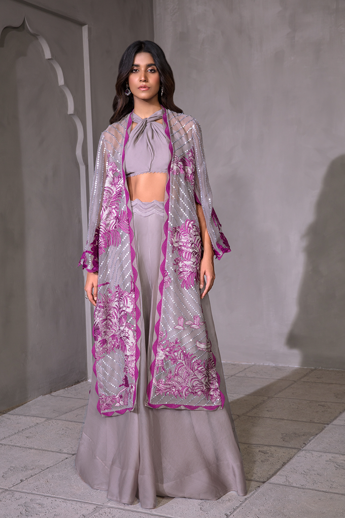 Symbolizing royalty in style. A unique combo of grey and pink. Royale features delicate pink colored embroidery, The intricately embellished feared panther and flowers applique on grey colored organza base paired with knot bustier and flared organza pants.