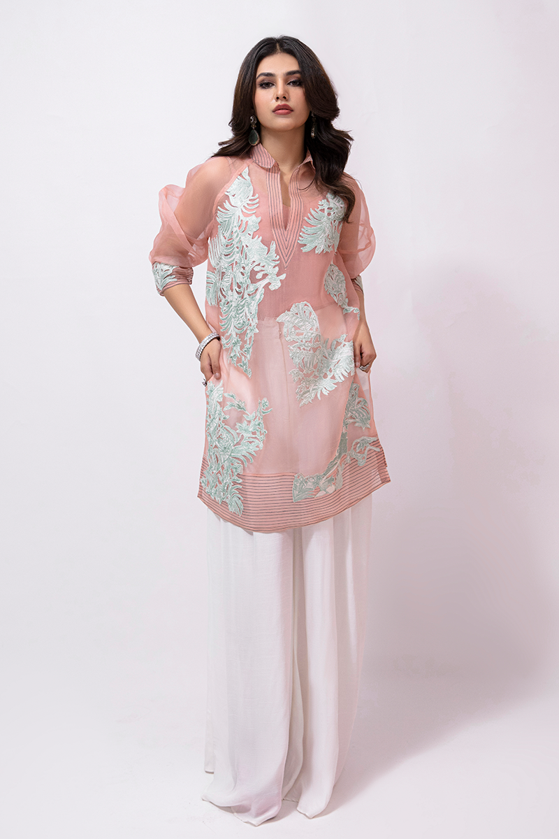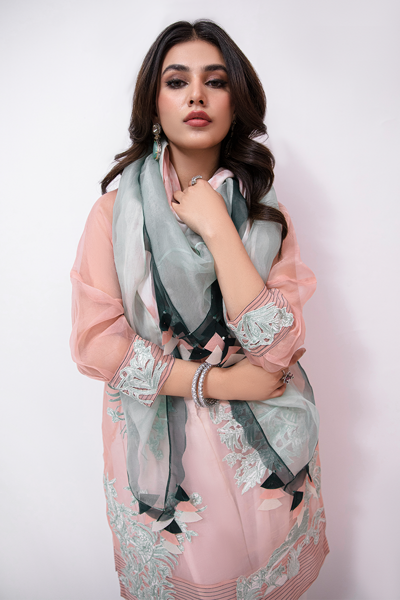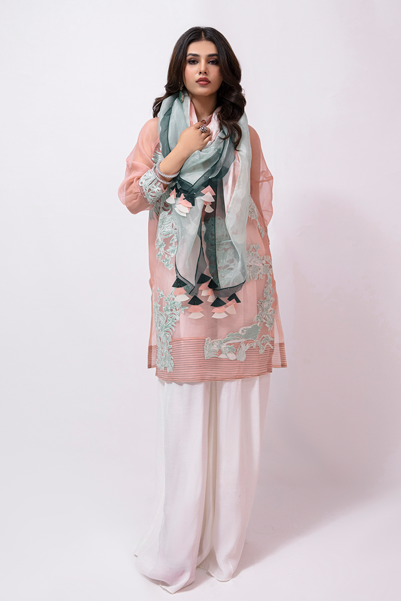 Description: Royal Luxe features a fresh peach-toned organza shirt adorned with delicate ferozi-hued embroidery. The shirt is detailed with an intricately embellished panther and floral applique on the front and sleeves. The gorgeous shirt comes with flared silk white pants and a stylish shaded scarf along with fabric tassels finishing that gives this outfit a perfect fusion of traditional and modern charm.
