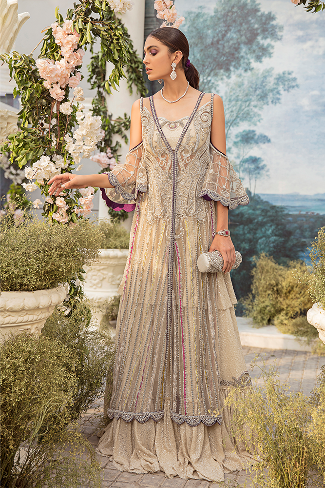 Description: It’s time to feel beautiful in the glamourous world of “Serena”. Merging traditional with contemporary, this gleaming ivory sequins blouse with a tulle gown intricately detailed with sequins, velvet applique, beadwork, and dabka, naqshi is perfect to create a dreamy and delicately flamboyant confection of delight. It is paired with a sequins gharara for your special occasions - decadent, opulent and with a dash of magic.