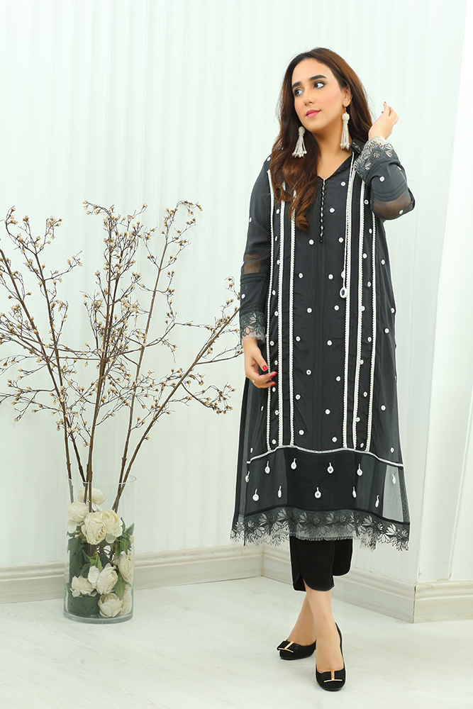 Description: This two piece elegant print serves a magnetizing blend of black and white paired with the finest sheesha work creates a style savvy look for your wardrobe.