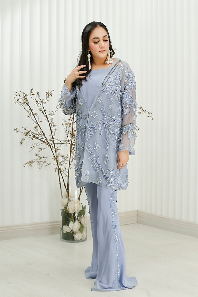 Description: An entrancing aura with its pastel silhouette on this lavender blue canvas,. Ths ensemble depicts symphony of glamor with grace. The beautifully grip flared trouser compliments ethereal embellishments.