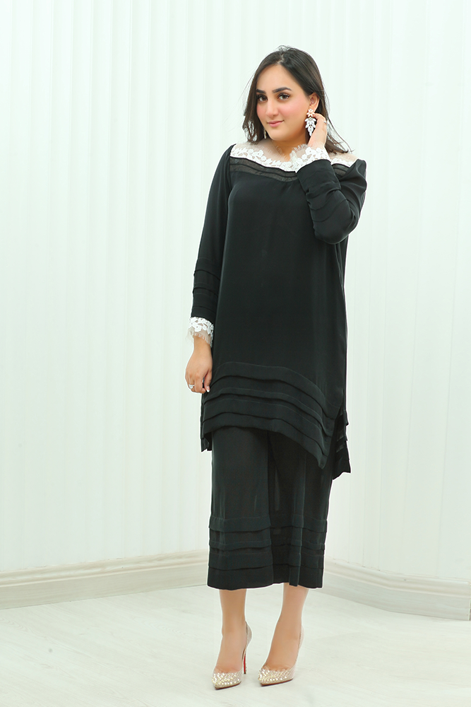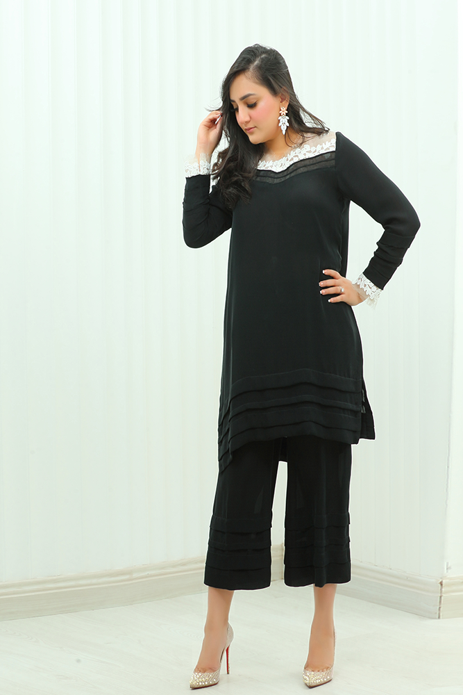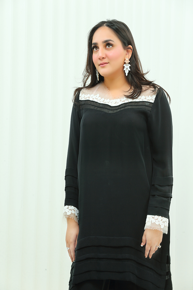 Description: The enticing piece in black with the finest enchanting details of white embroidery on the neckline and sleeves creates the most classy look for a visionary charismatic look.