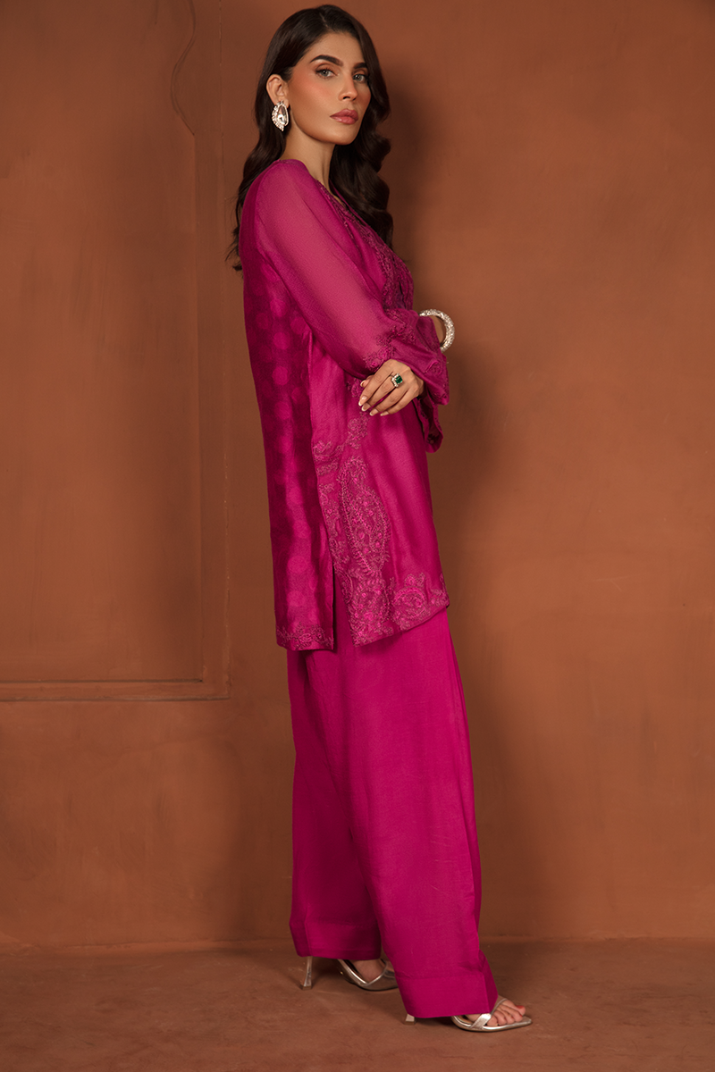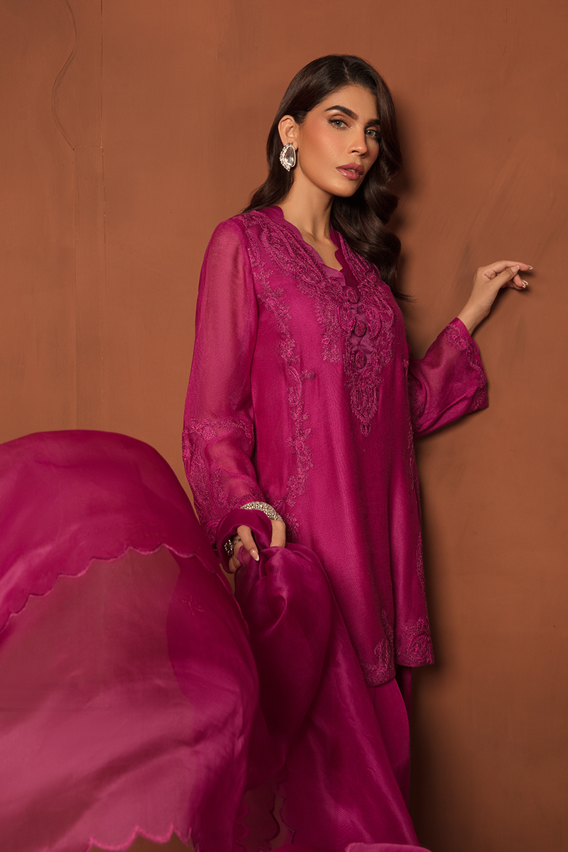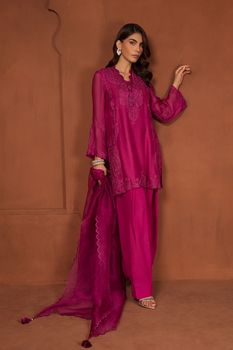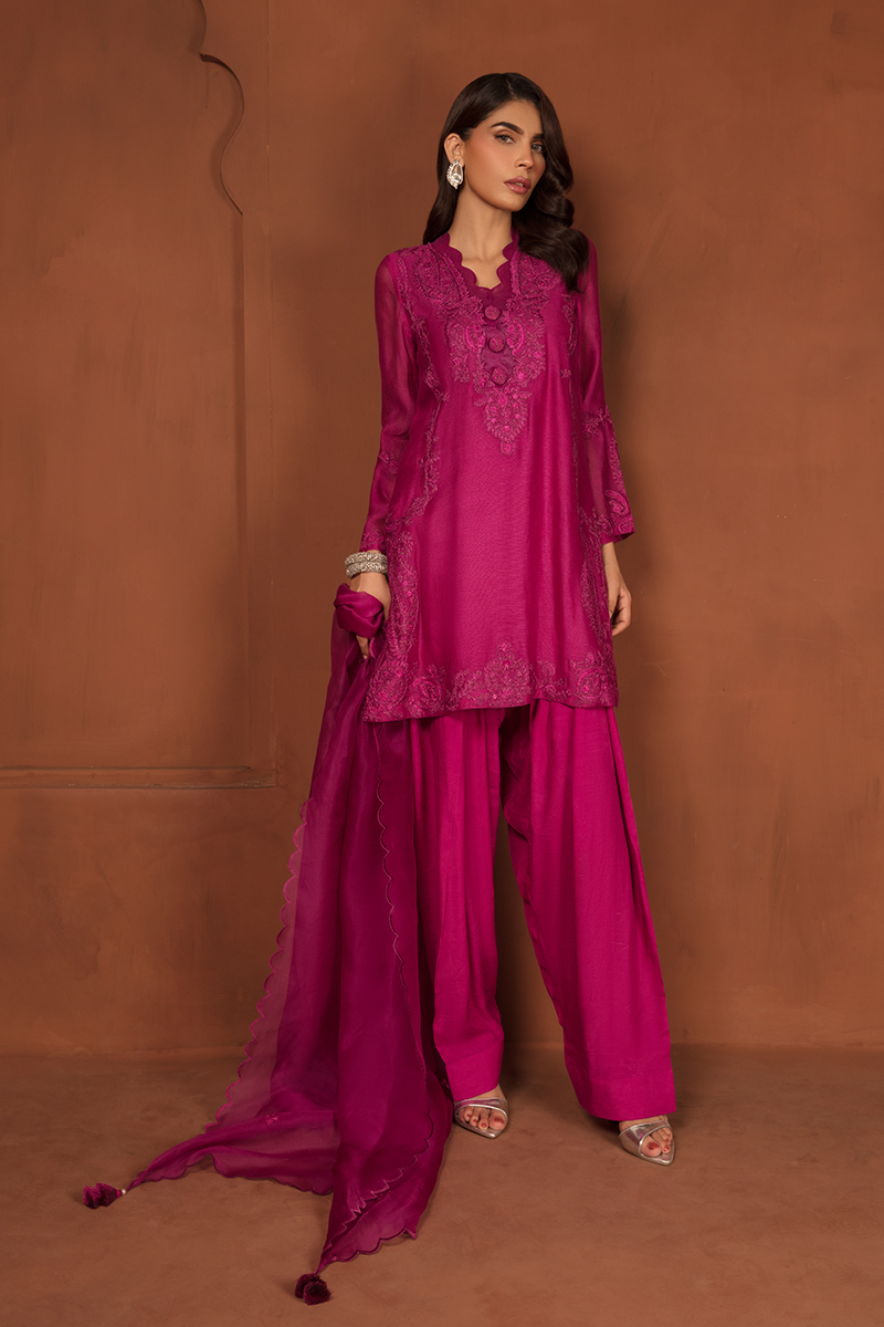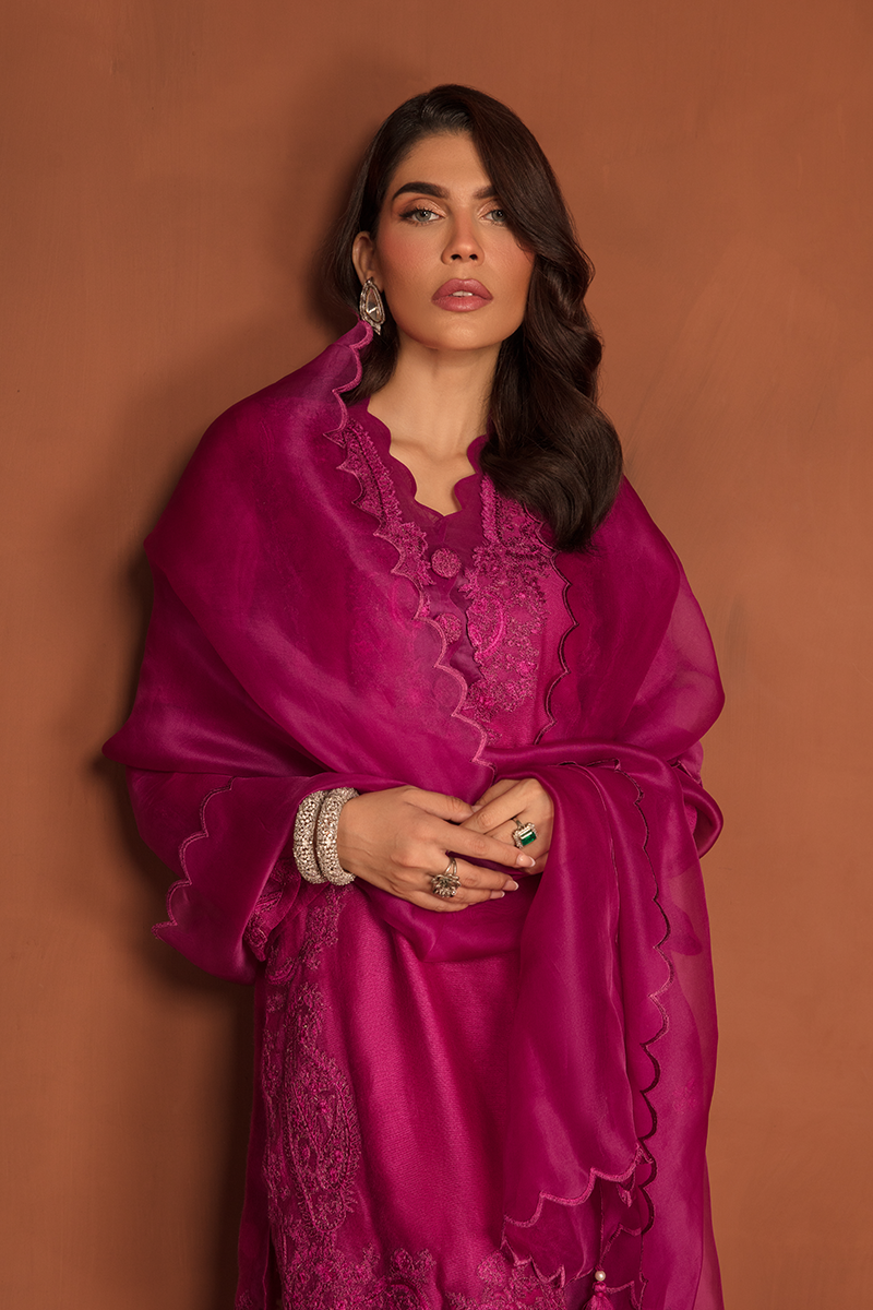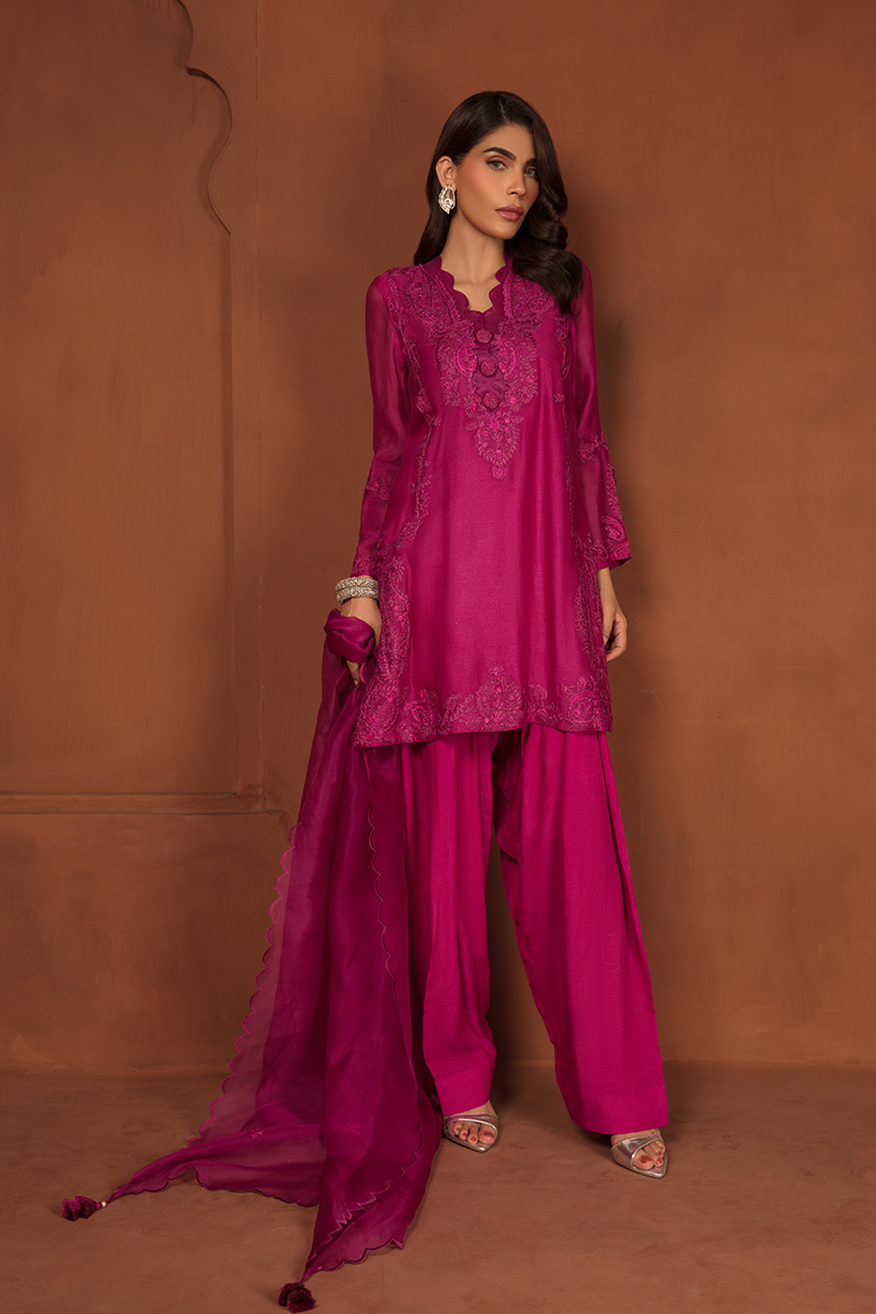 Description: Stunning blush of deep Magenta takes center of the stage with “SHERIN”, a true fashion marvel showcasing an intermix of modernity and tradition. This opulent ensemble is completed with a cotton net shirt adorned with self-print fabric and self-colored embroidered patches on the neckline, daman, and sleeves, creating layers of exquisite floral and paisley patterns. Paired with raw silk trousers and an organza dupatta, Sherin is your royal choice for a breathtaking formal affair